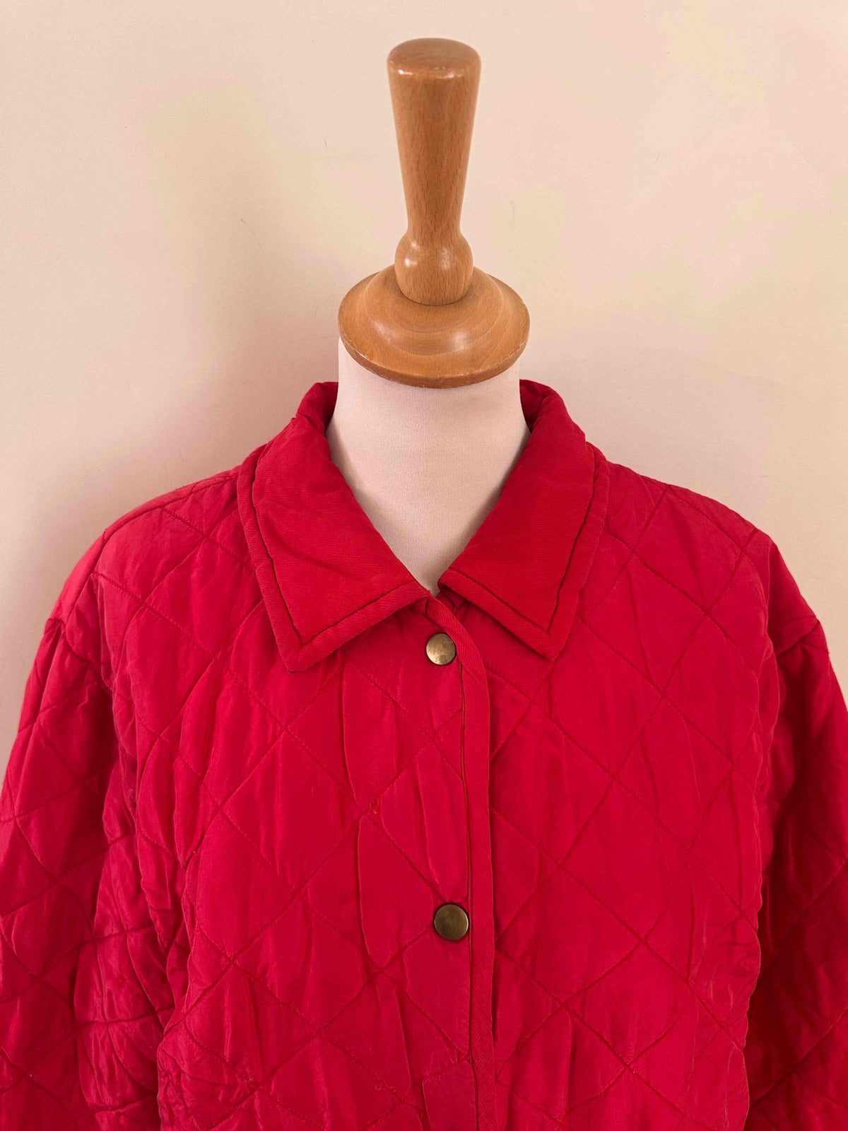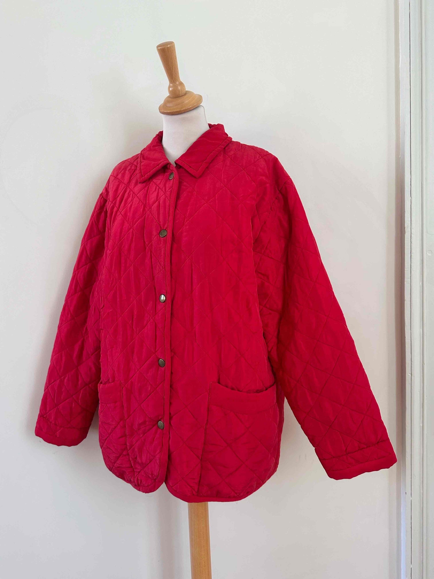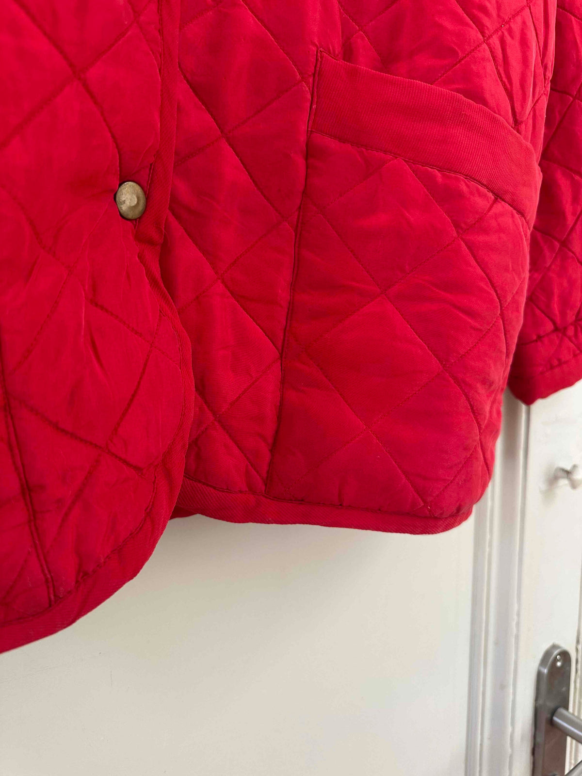 Prix unitaire parVeste matelassée en soie rouge cardinal matelassée ouate croisillons, forme esprit barn jacket, boutons pressions laiton, années 80, taille S, taille 36 portée ici sur un mannequin T36.