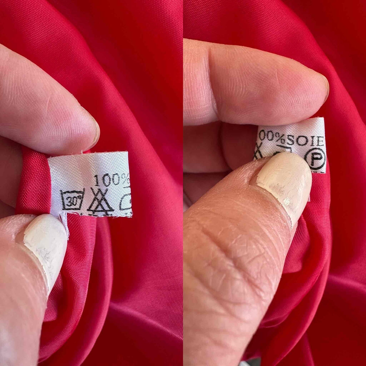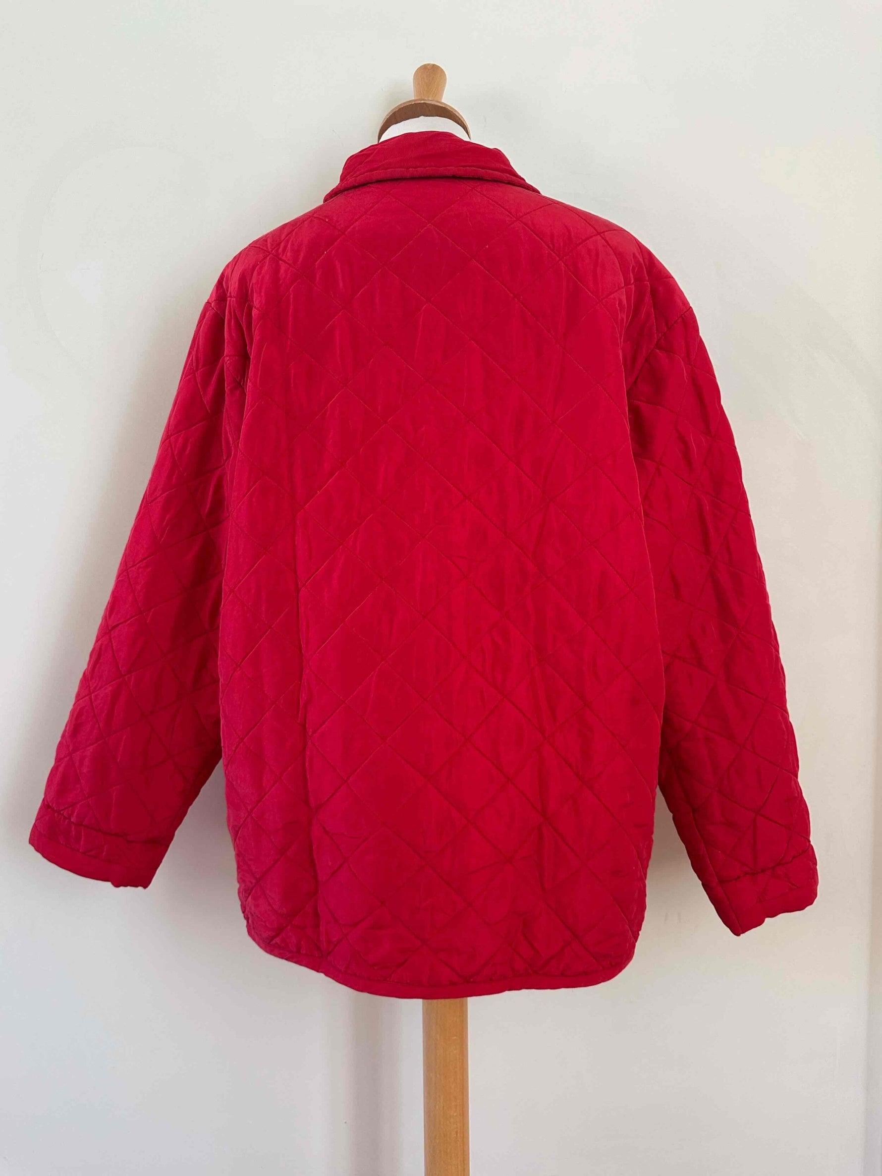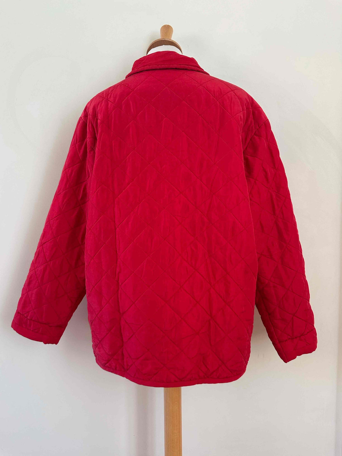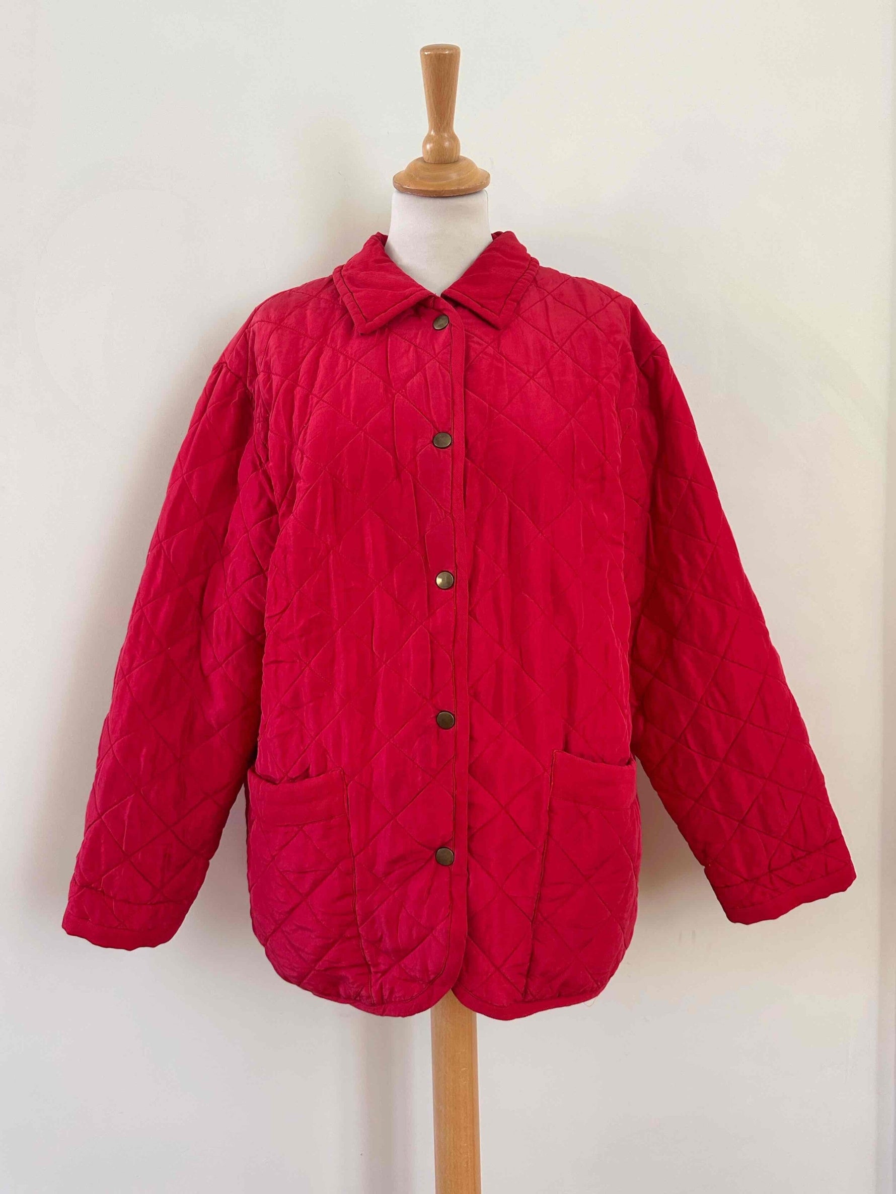 Prix unitaire parVeste matelassée en soie rouge cardinal matelassée ouate croisillons, forme esprit barn jacket, boutons pressions laiton, années 80, taille S, taille 36 portée ici sur un mannequin T36.