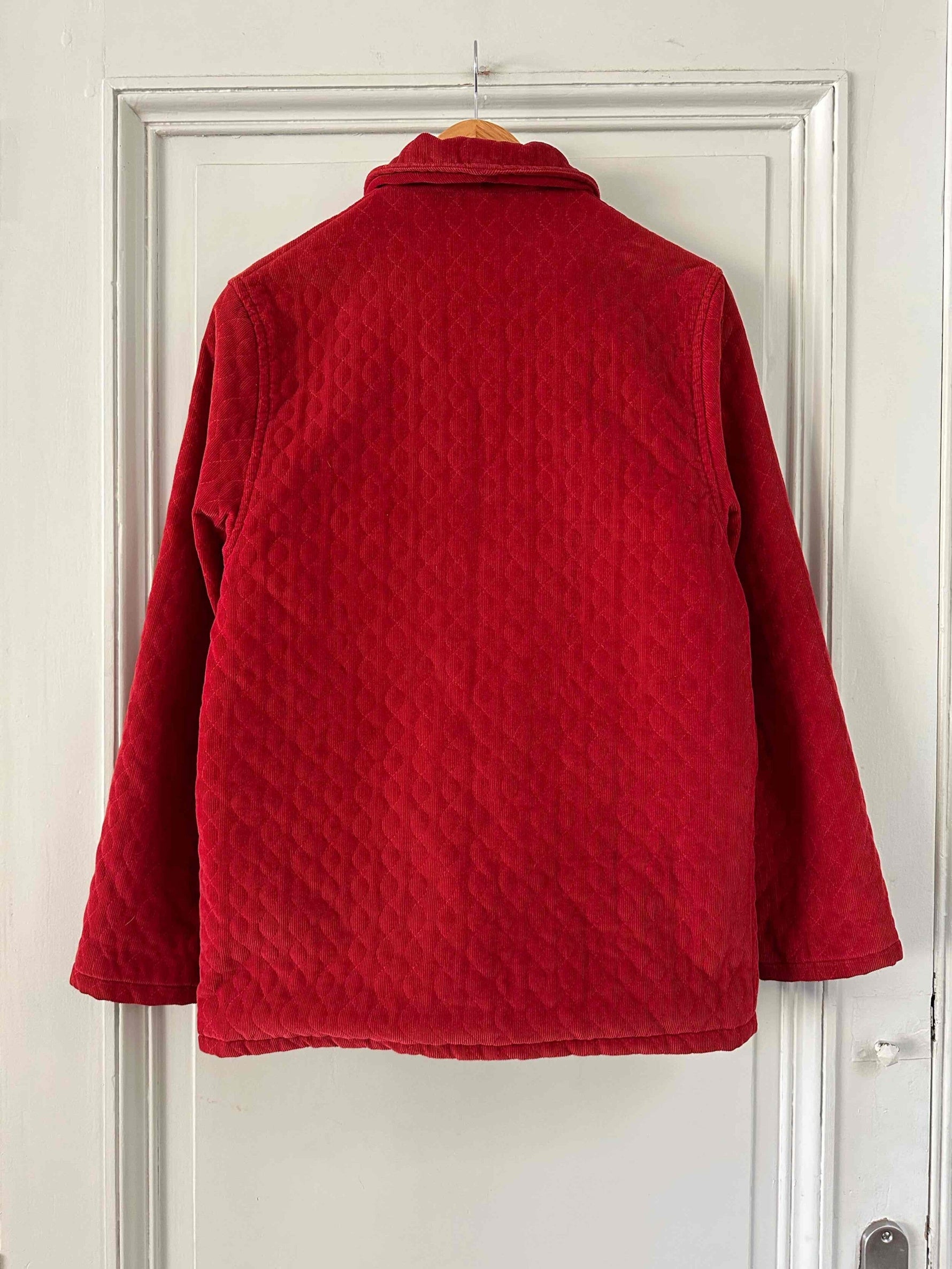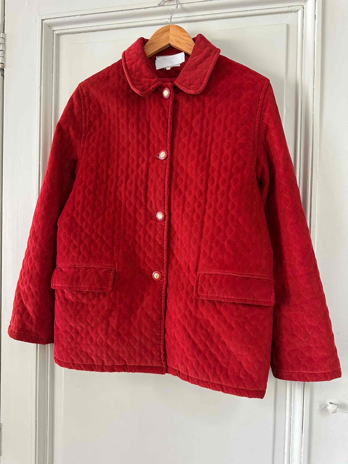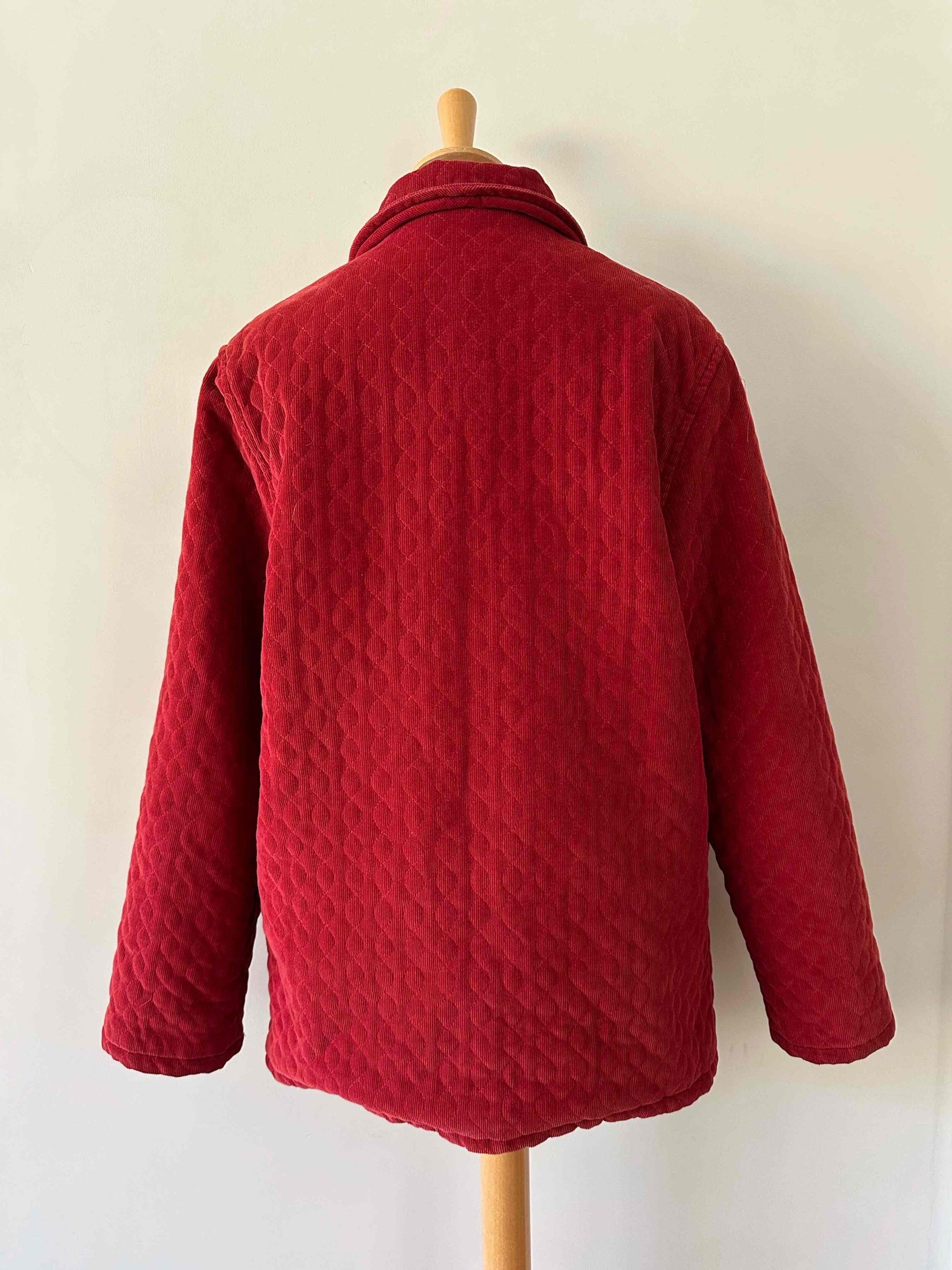 Prix unitaire parVeste matelassée en velours côtelé rouge cerise, matelassé ouatine croisillons, esprit barn-jacket, boutons dorés gravés oies, fabriquée en France, taille 36 portée ici sur un mannequin T36.