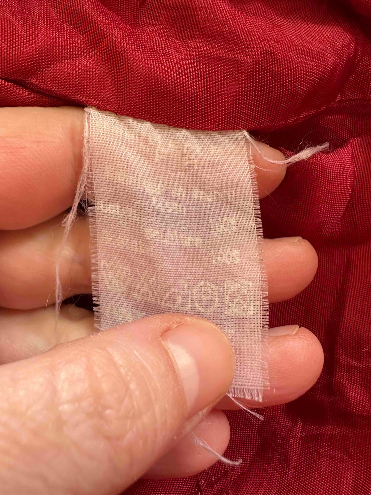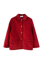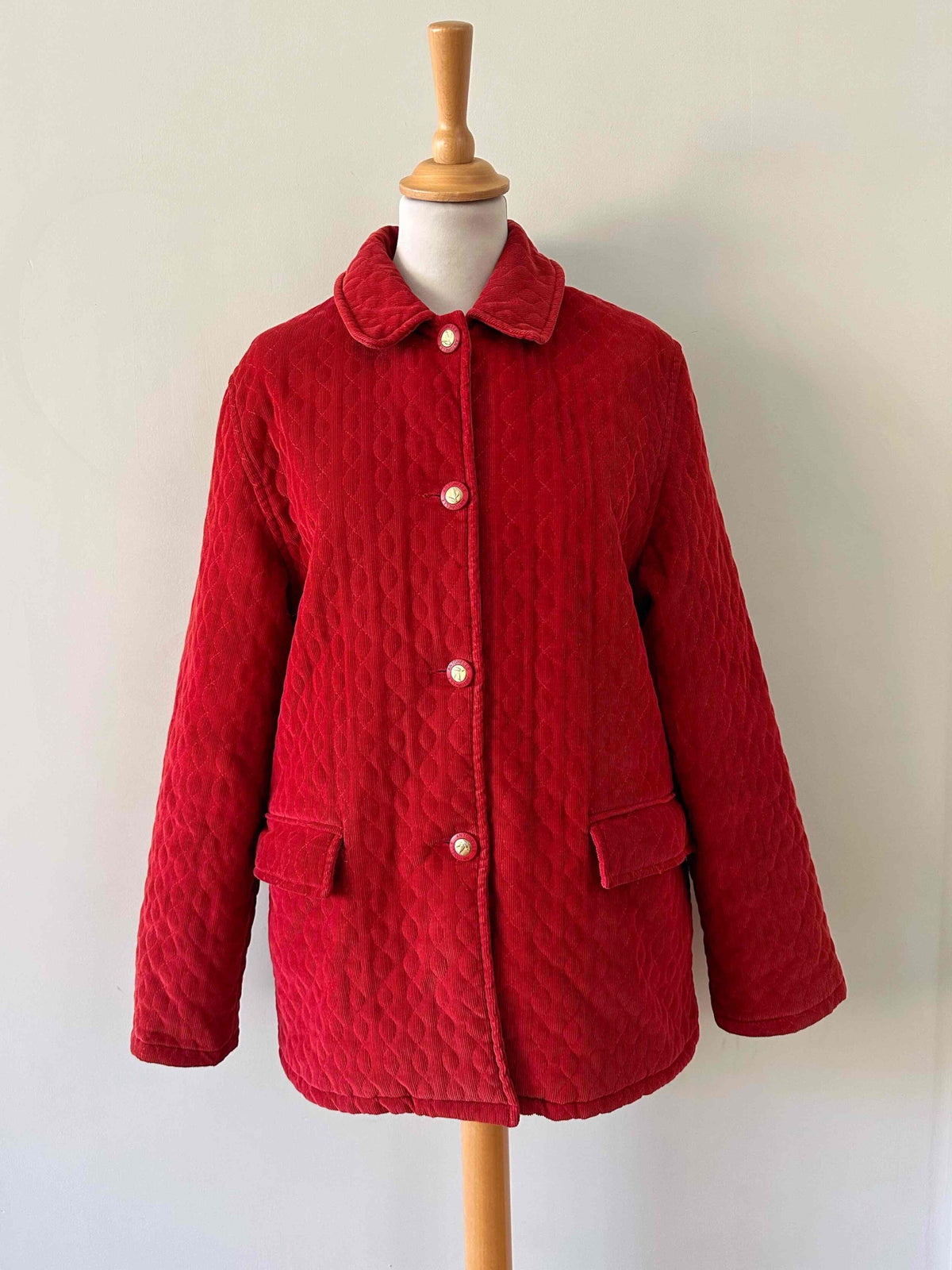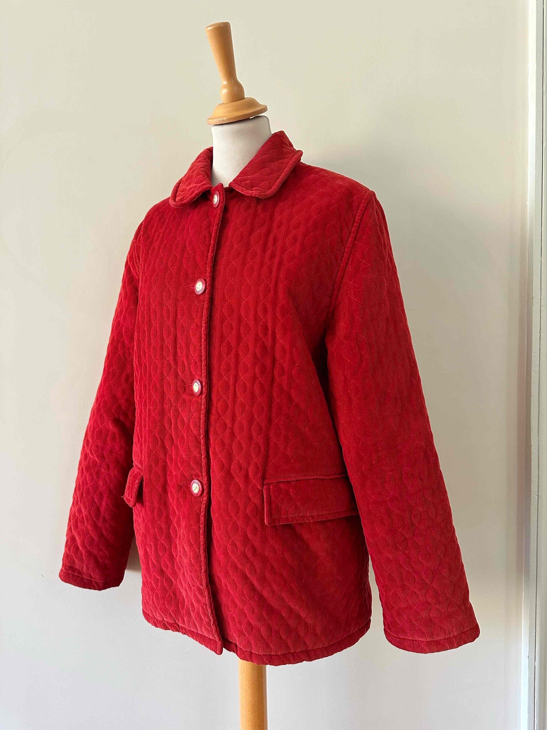 Prix unitaire parVeste matelassée en velours côtelé rouge cerise, matelassé ouatine croisillons, esprit barn-jacket, boutons dorés gravés oies, fabriquée en France, taille 36 portée ici sur un mannequin T36.