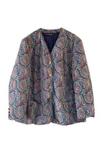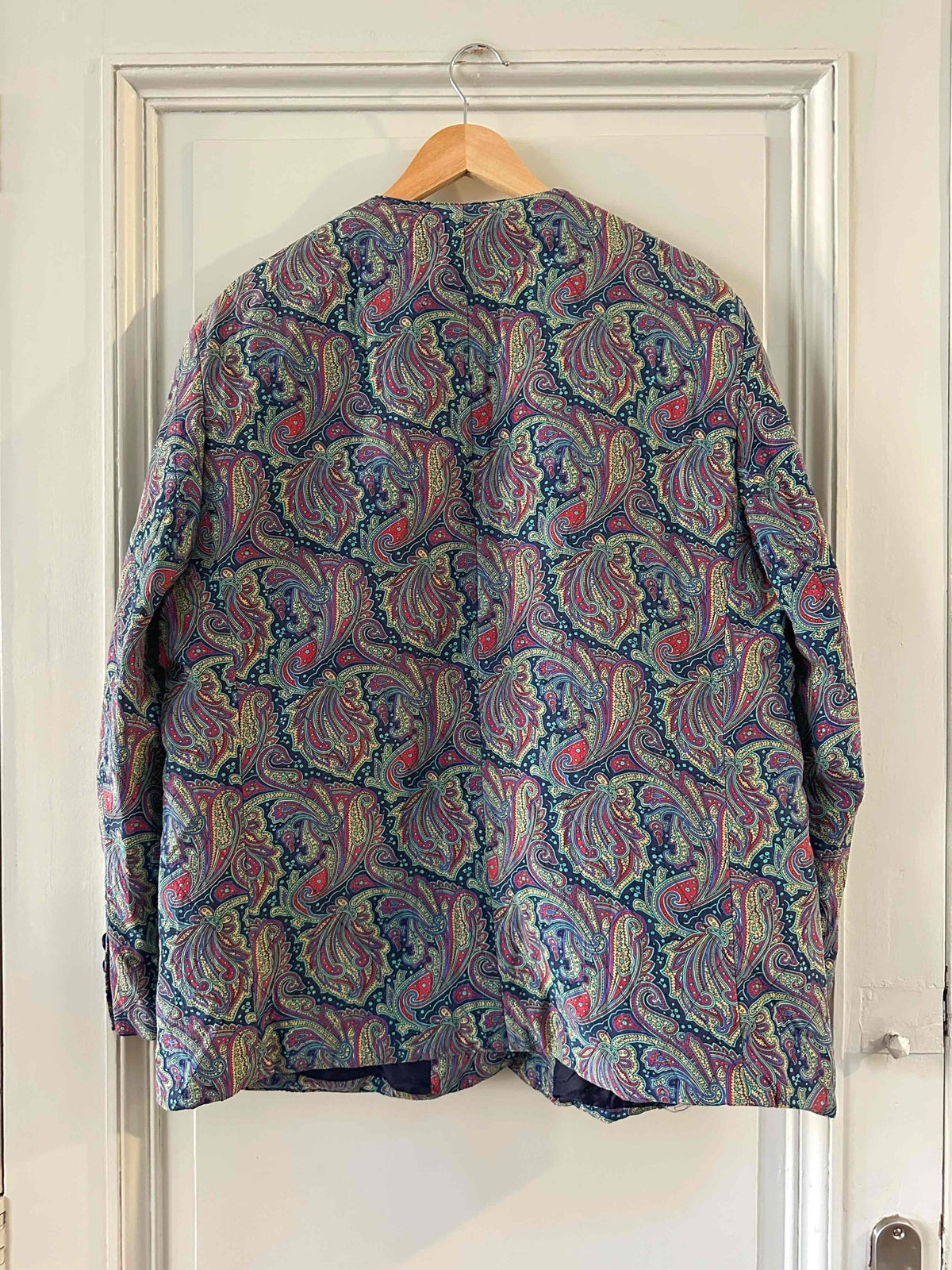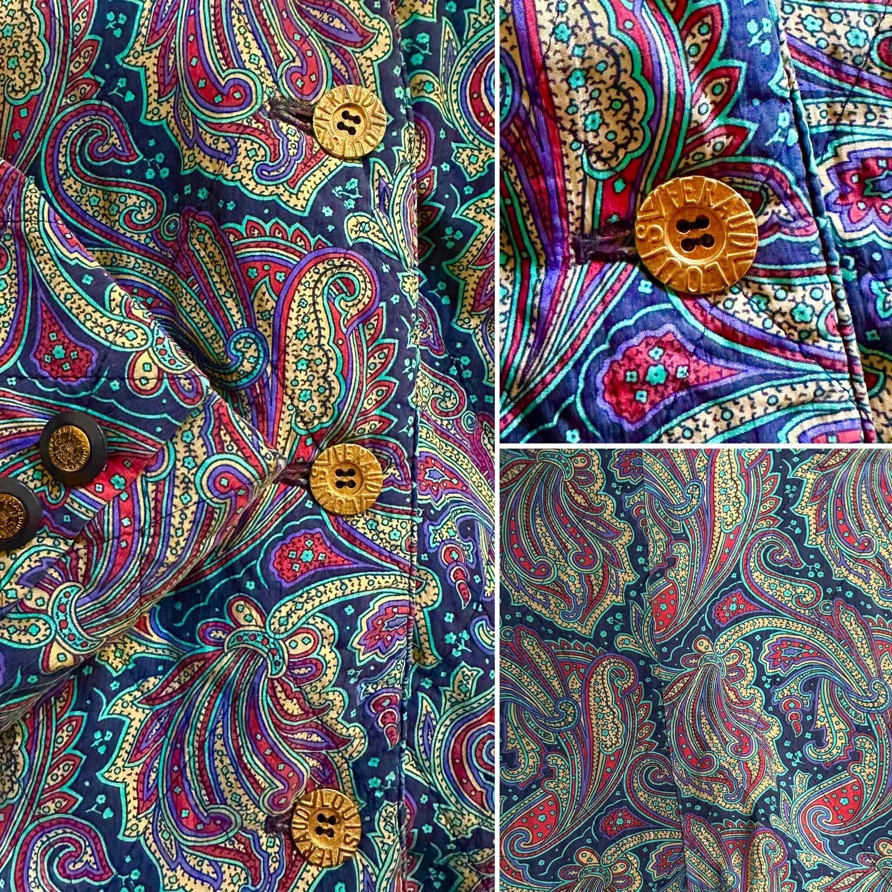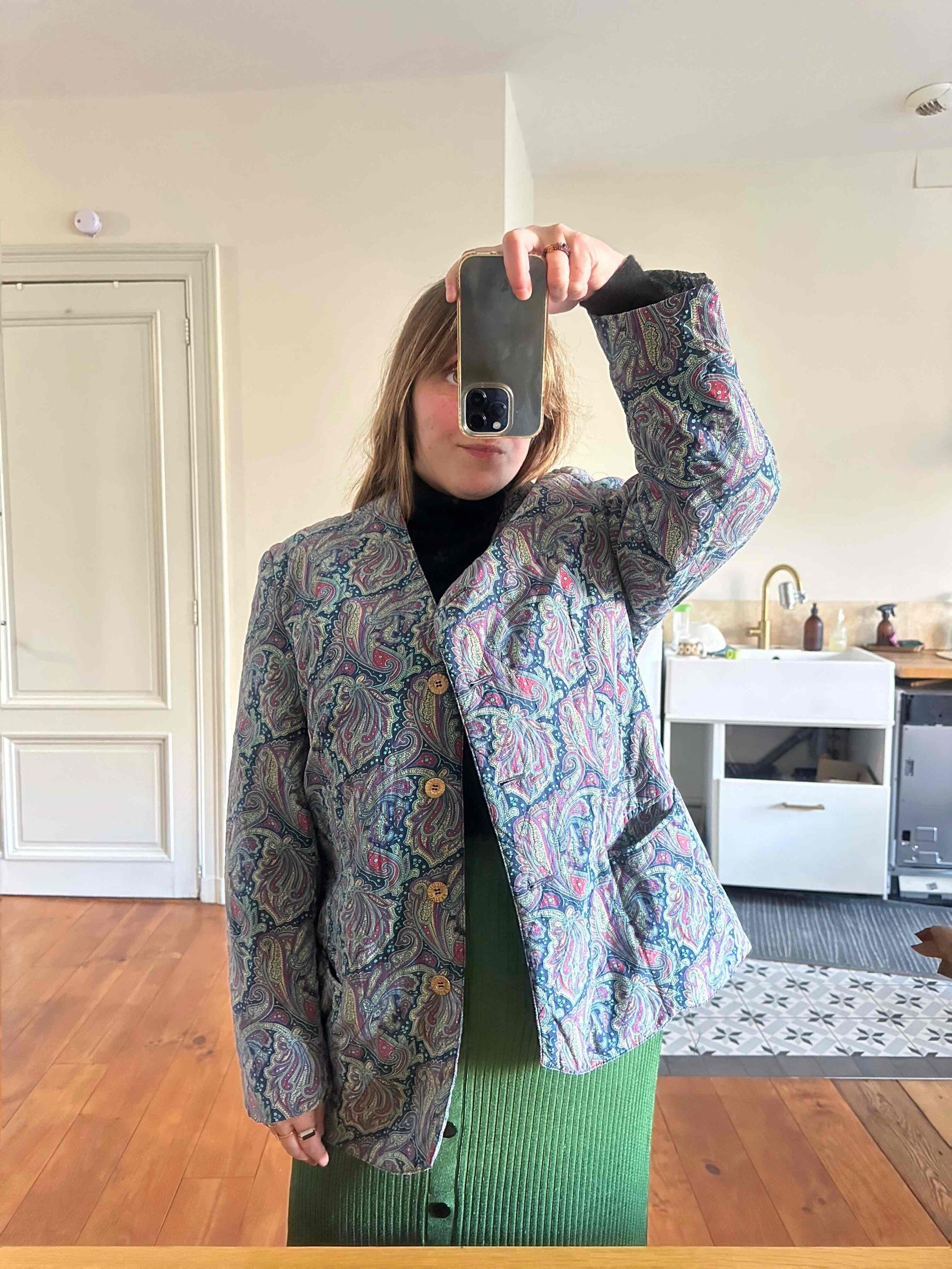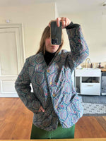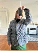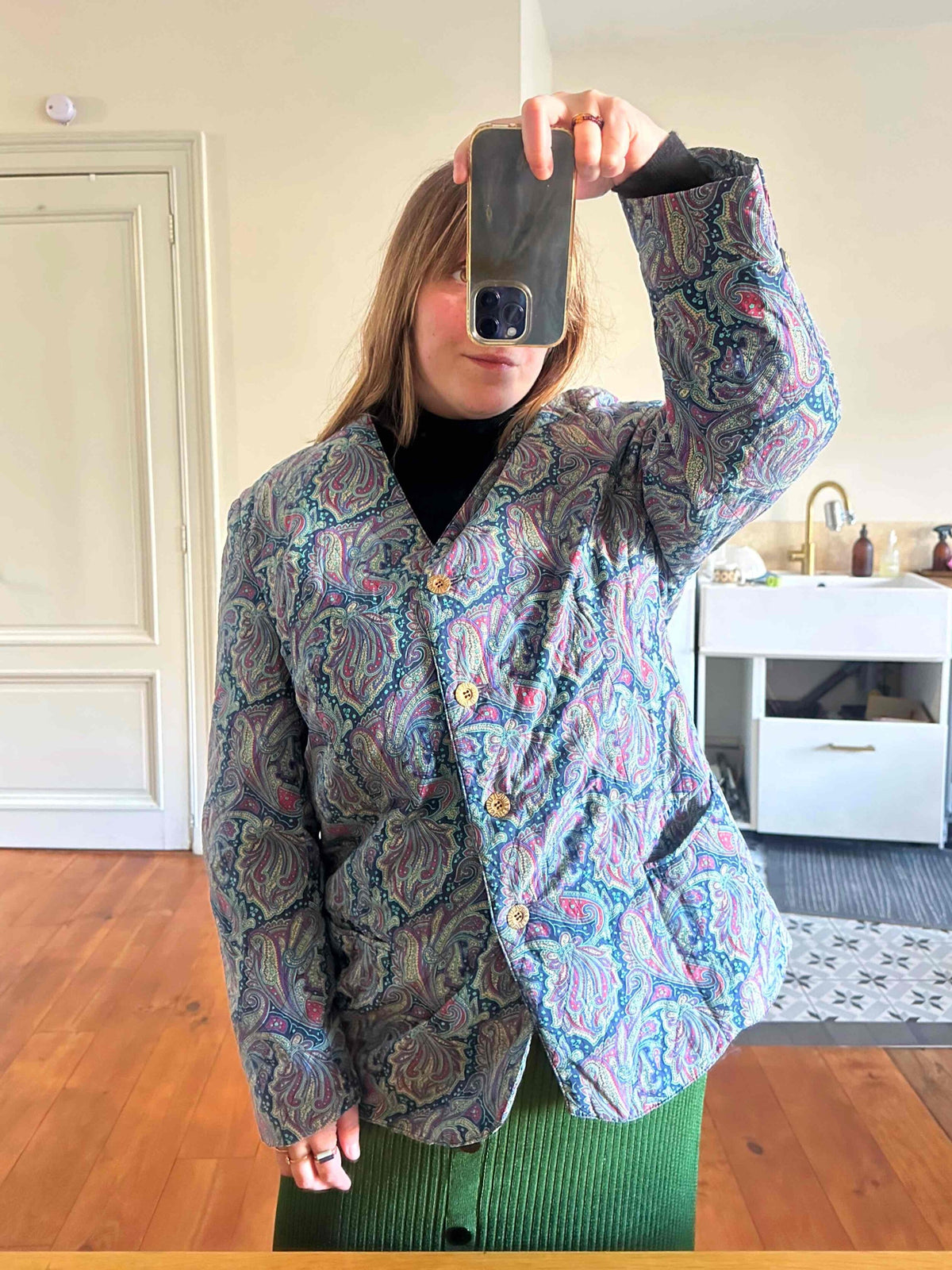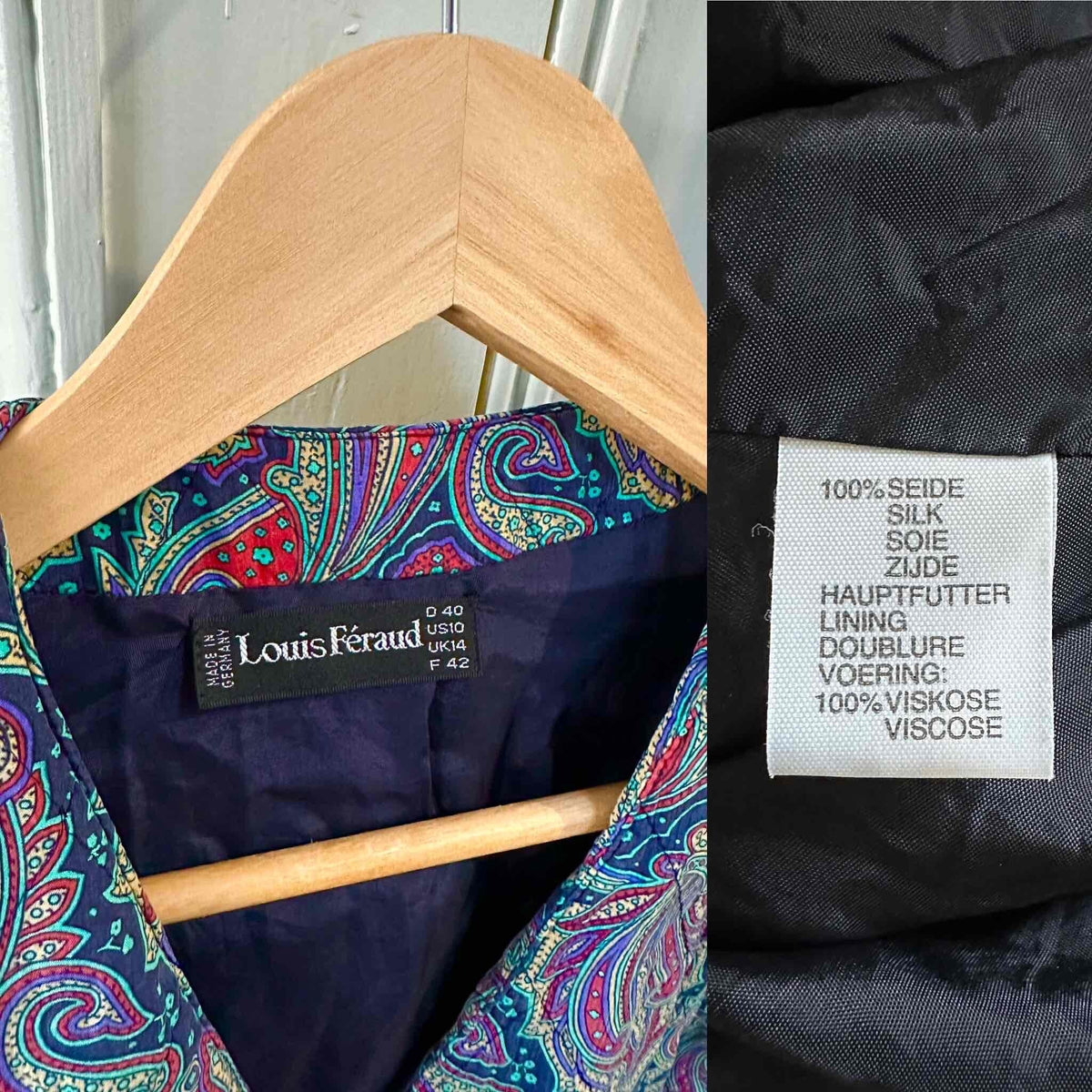 Prix unitaire parDoudoune en soie Louis Féraud, 100% soie imprimée paisley cachemire, boutons dorés gravés Louis Féraud, col V, fabriquée en Allemagne de l’ouest, taille 40 portée ici sur une personne T40.
