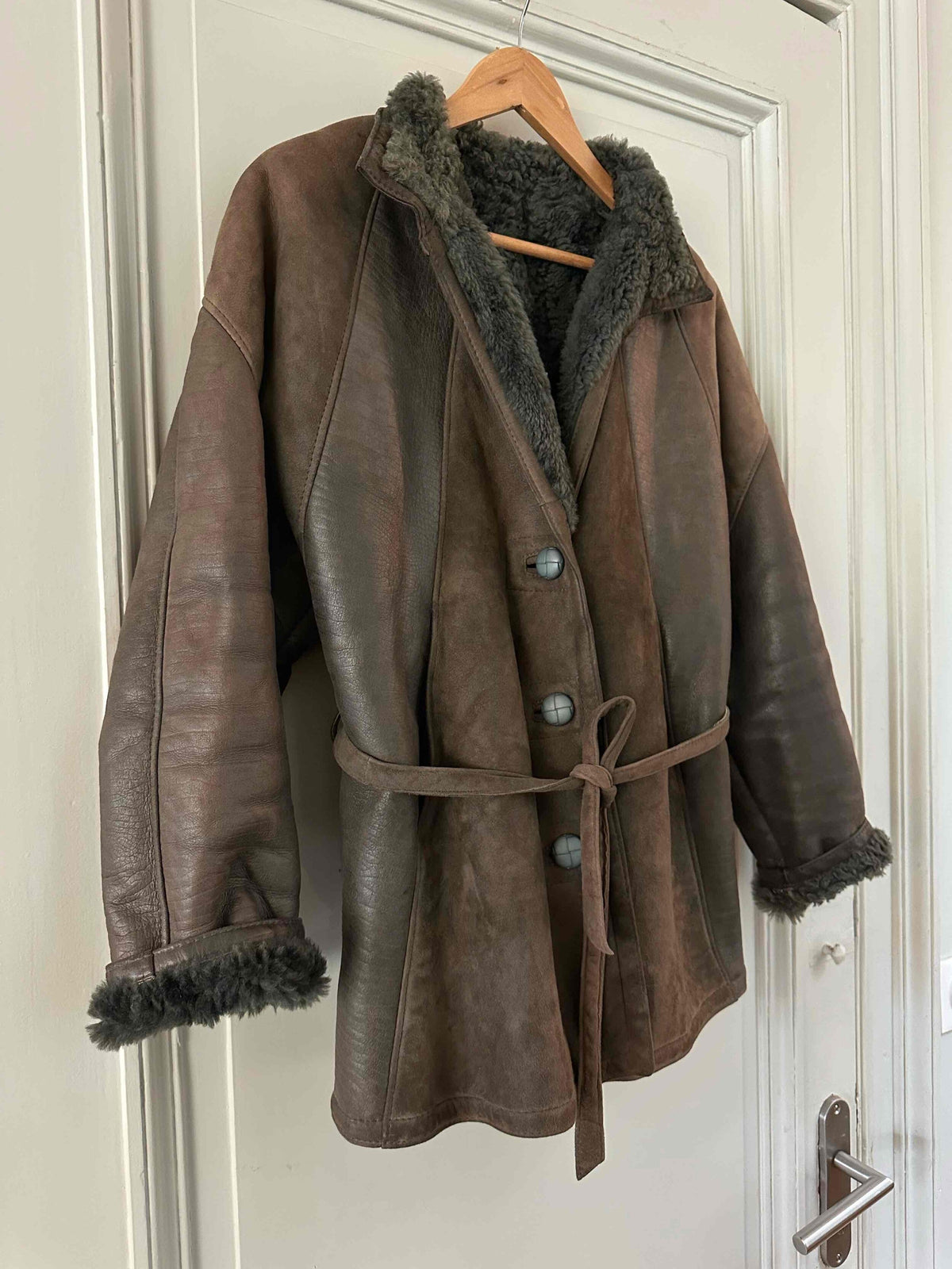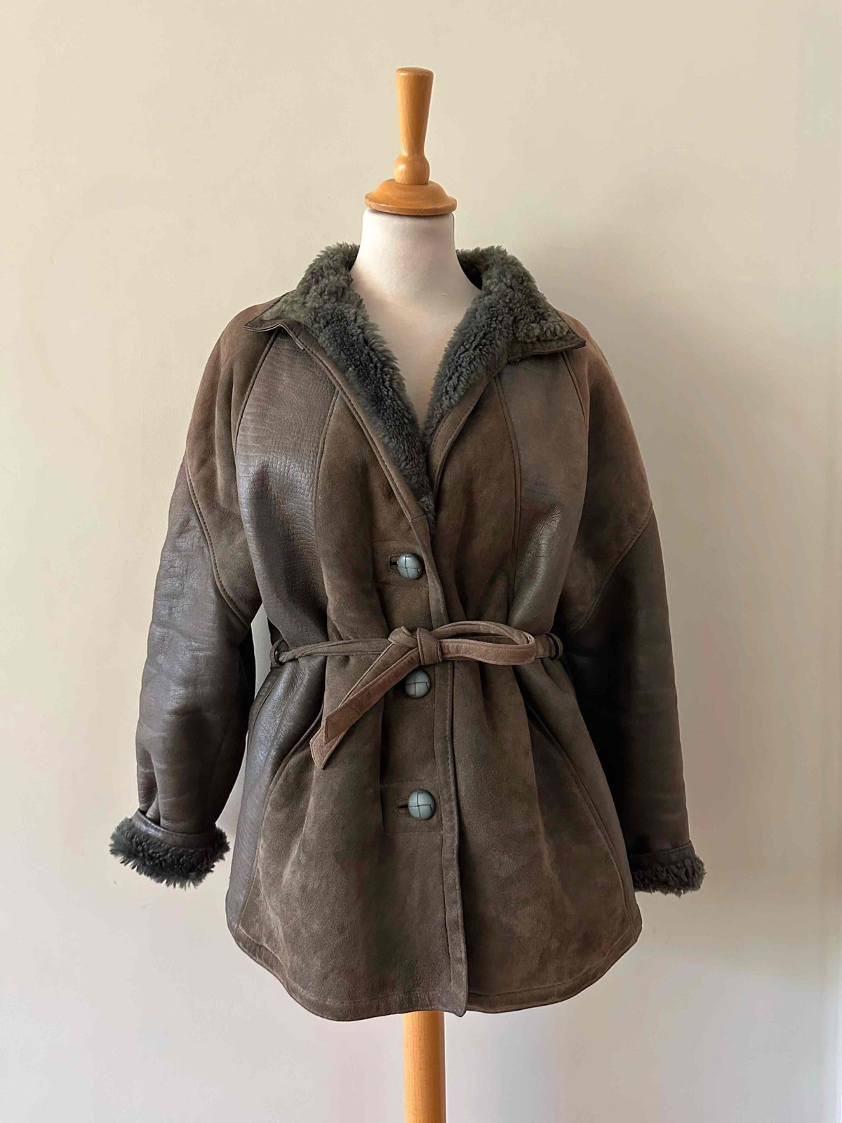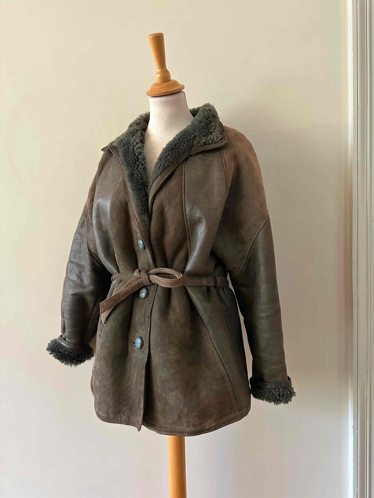 Prix unitaire parPeau lainee en mouton retourné, exterieur daim et cuir brun kaki, interieur laine de mouton vert foncé, boutonné, ceinture taille à nouer façon saharienne, fabriqué en Espagne, taille 36 portée ici sur un mannequin T36.