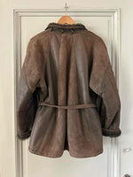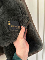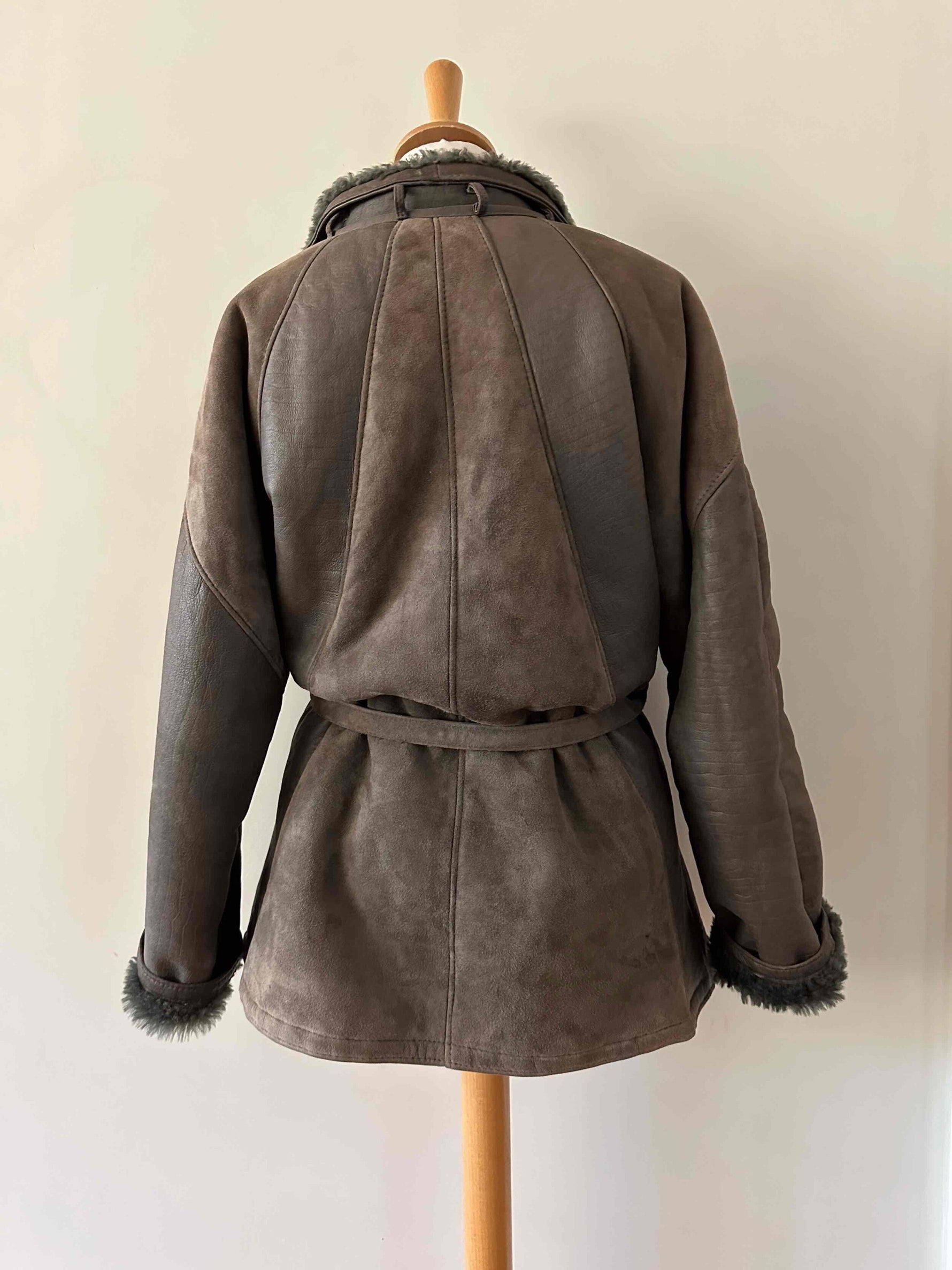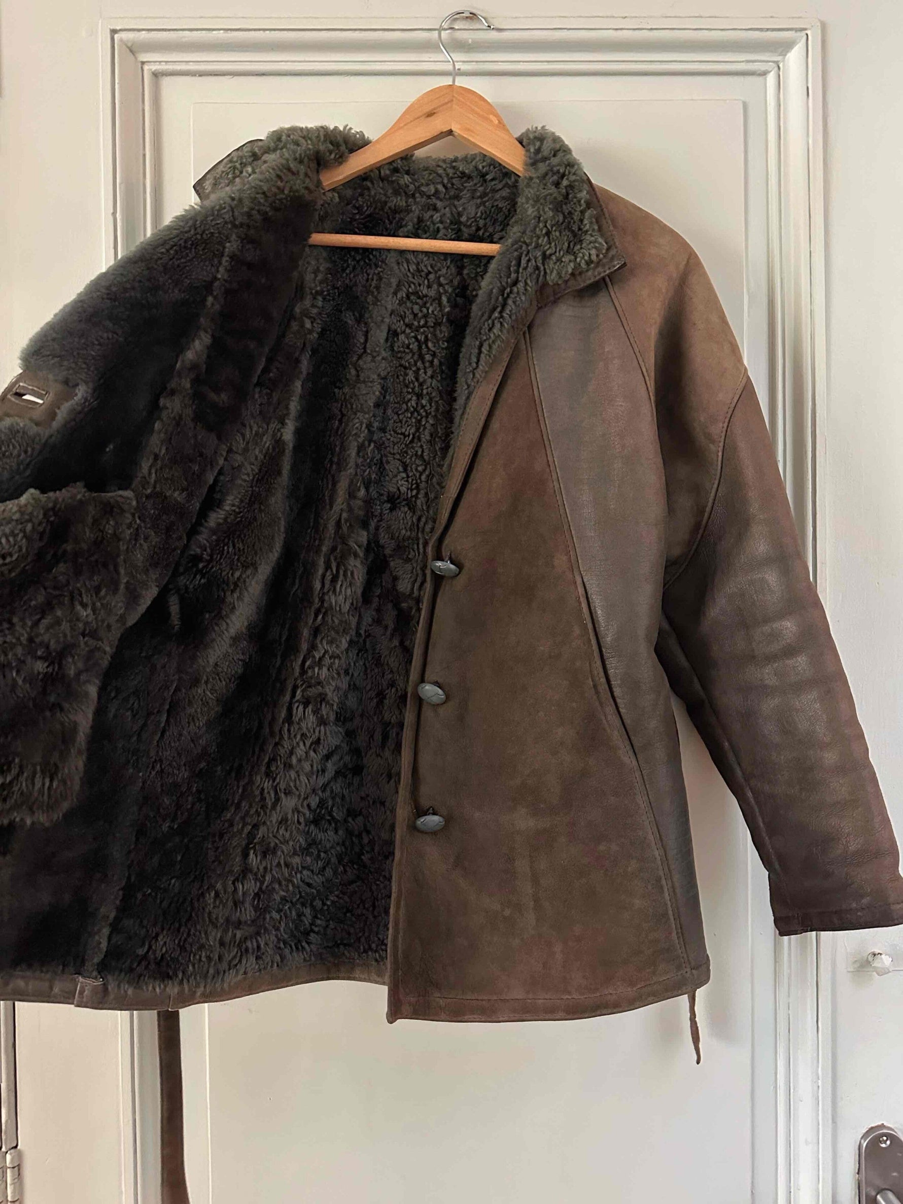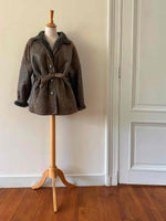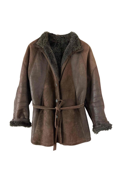 Prix unitaire parPeau lainee en mouton retourné, exterieur daim et cuir brun kaki, interieur laine de mouton vert foncé, boutonné, ceinture taille à nouer façon saharienne, fabriqué en Espagne, taille 36 portée ici sur un mannequin T36.