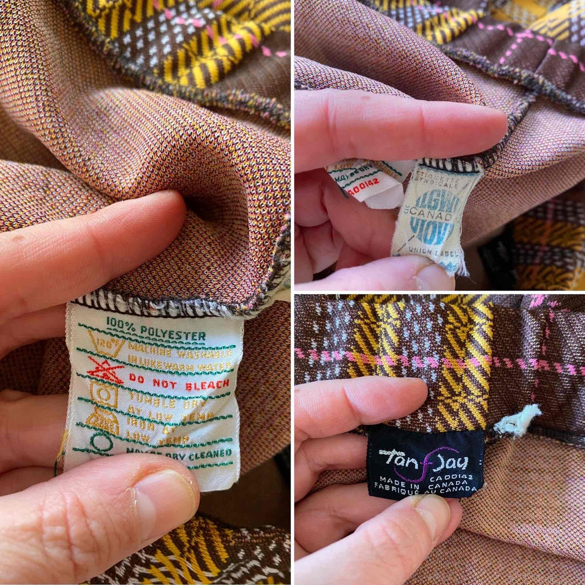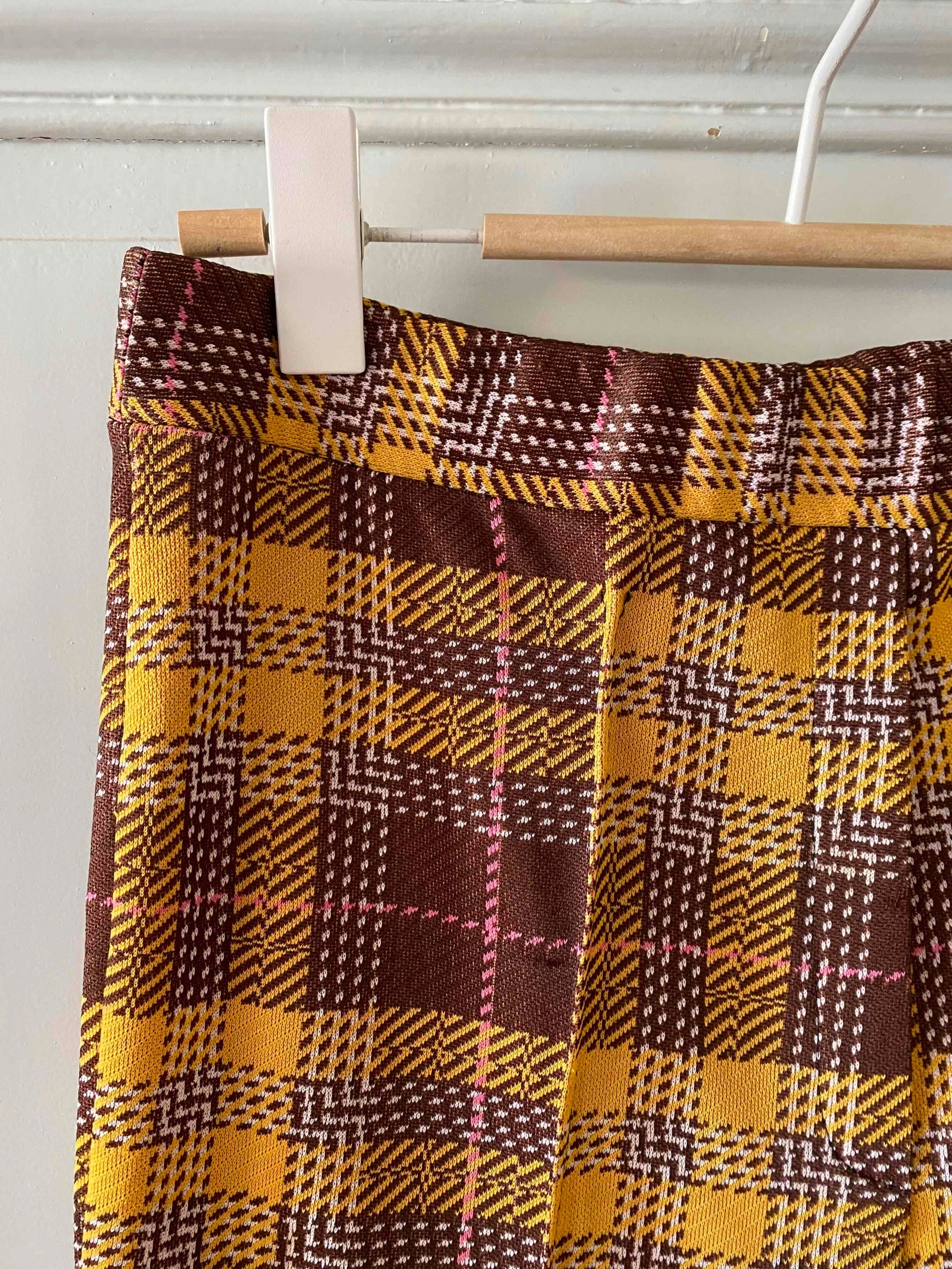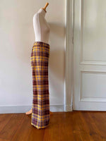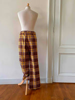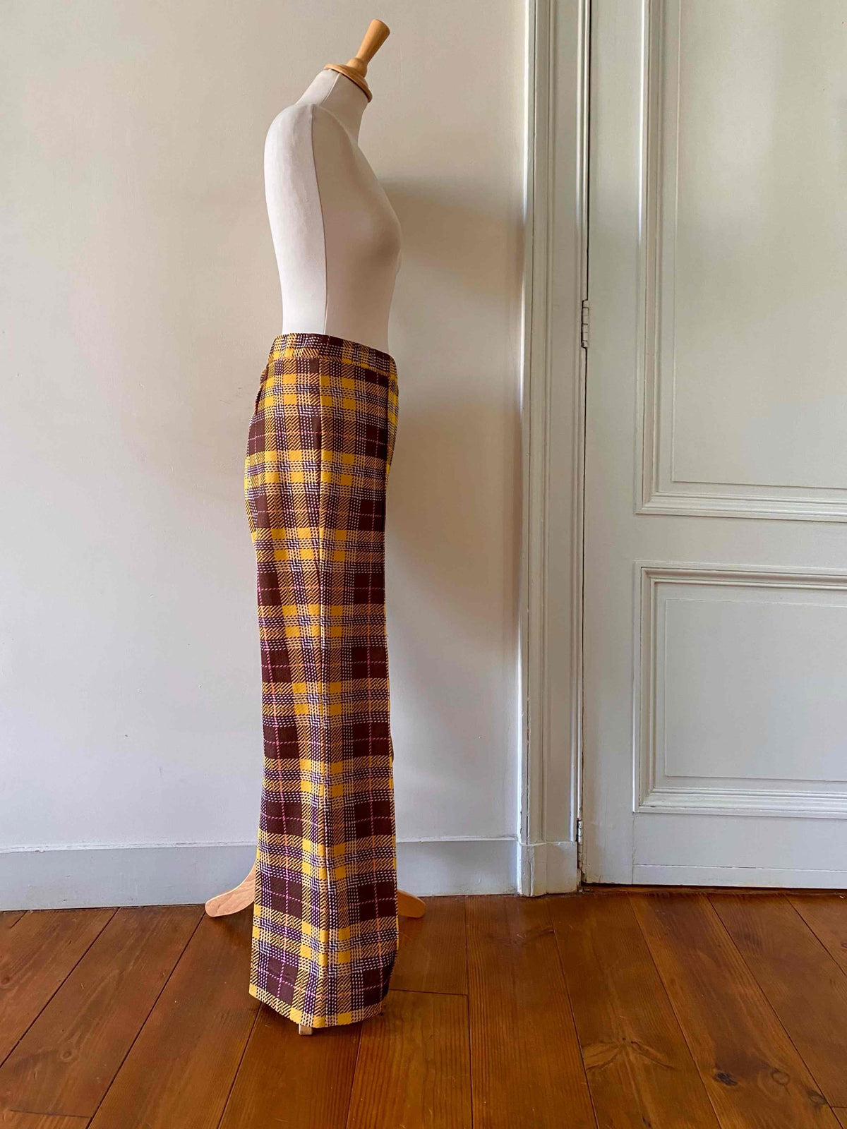 Prix unitaire parFlare 70’s à carreaux prince de Galles chocolat, jaune ocre, et baguette rose, maille seventies, taille haute élastique, fabriqué au Canada, taille 38 porté ici sur un mannequin T36, mesures : Taille 36cm