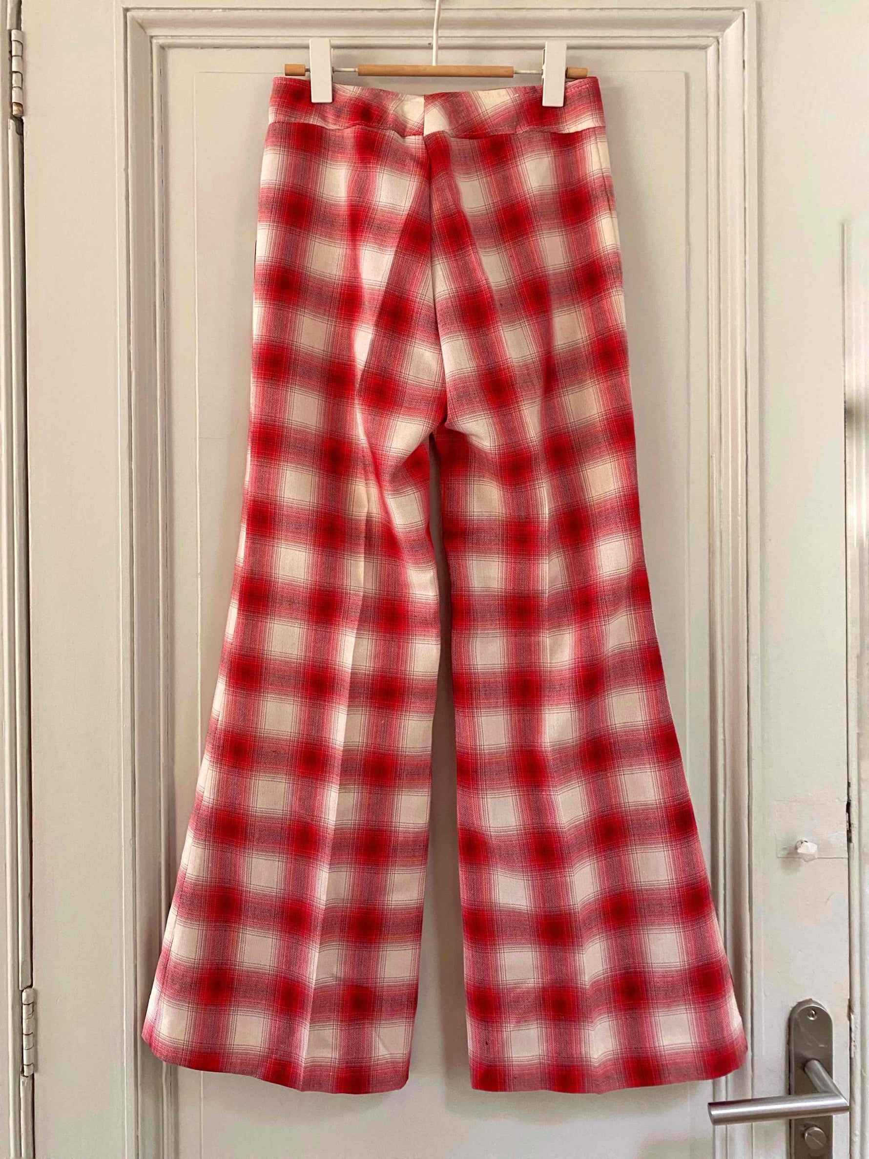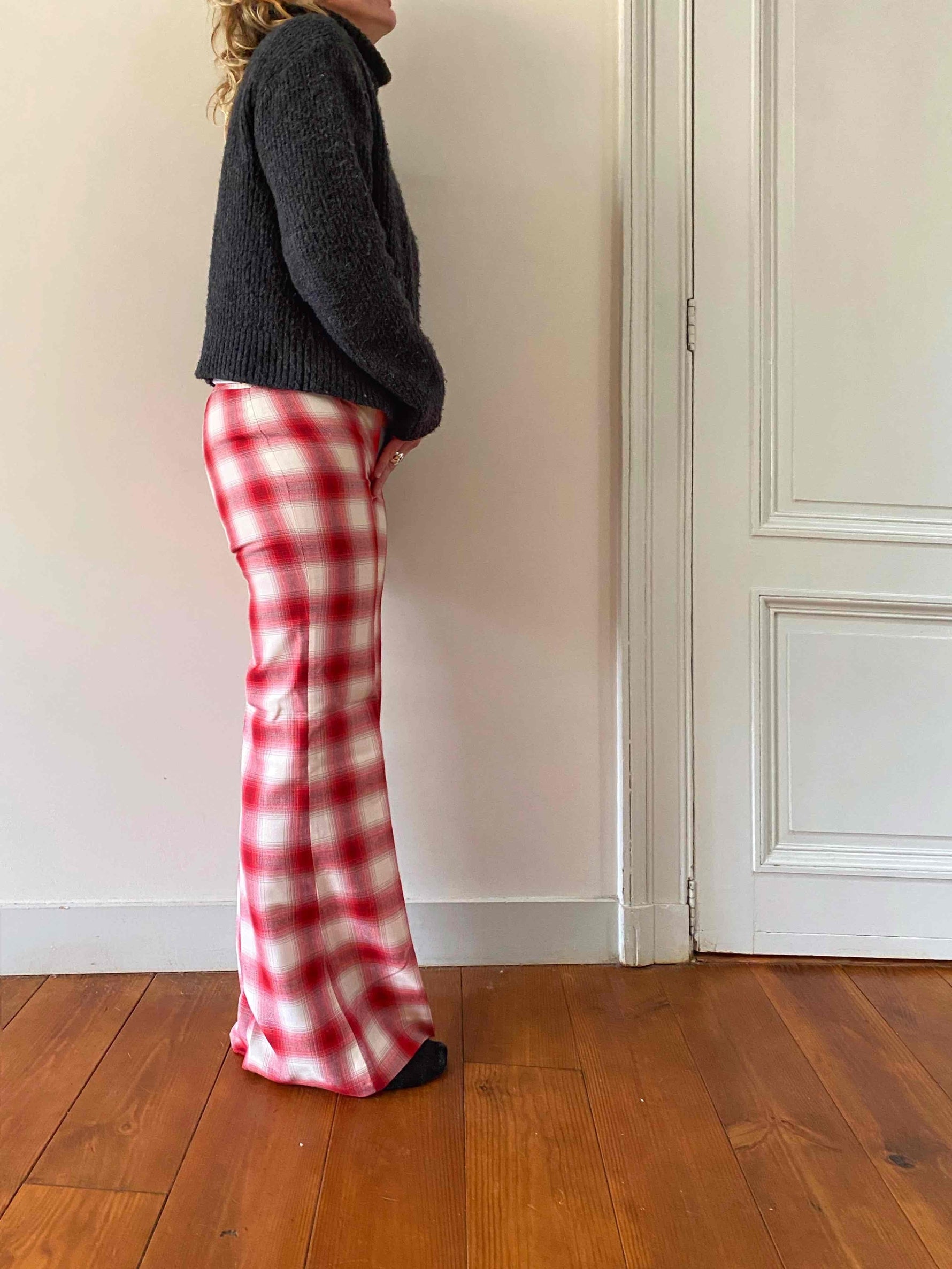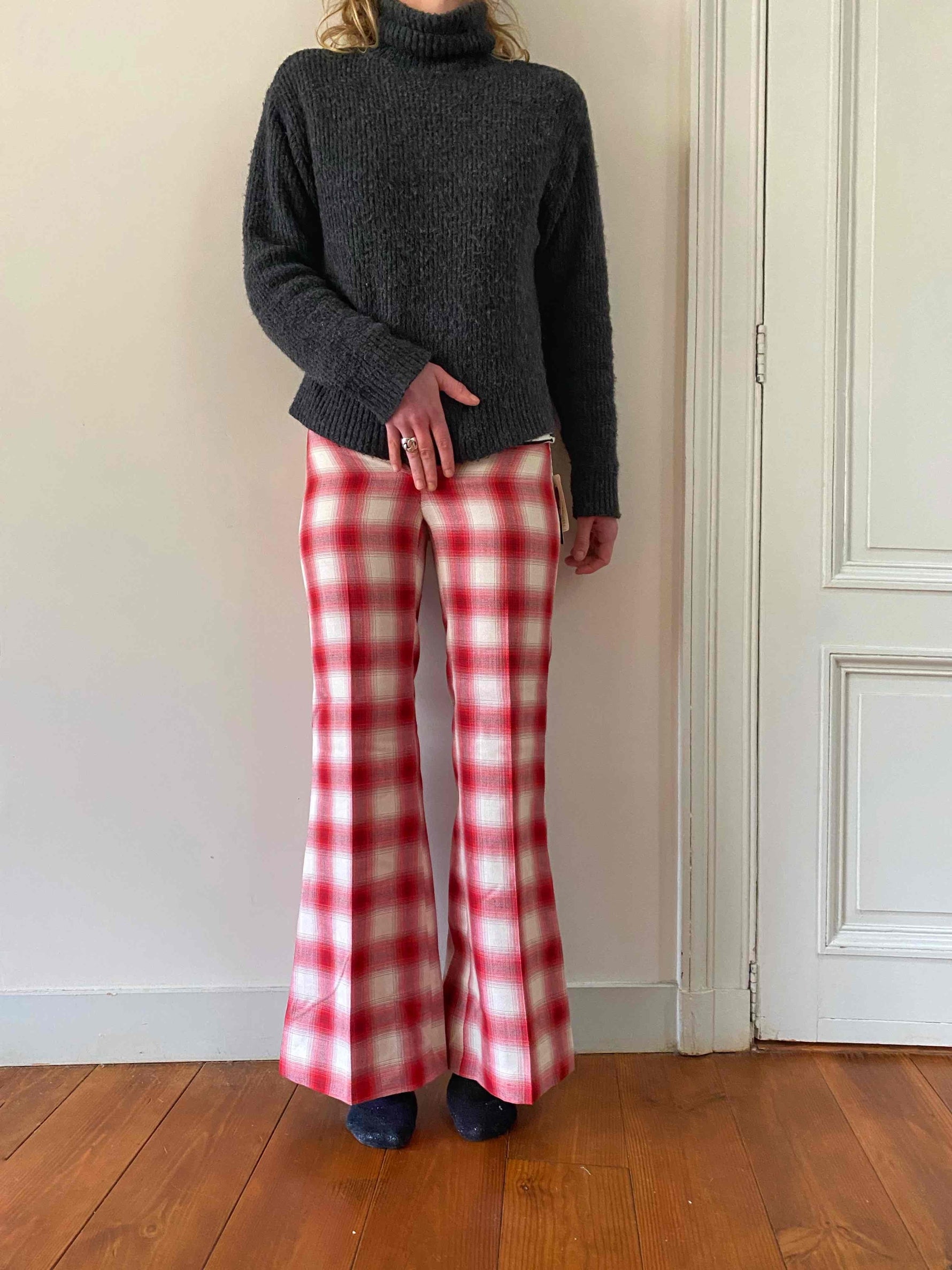 Prix unitaire parFlare à carreaux 70’s, en coton mélangé carreaux écrus, beiges et rouges, fabriqué en Espagne, deadstock des années 70’s, taille 34 porté ici ouvert sur une personne T36 et de 1m65, Mesures :
