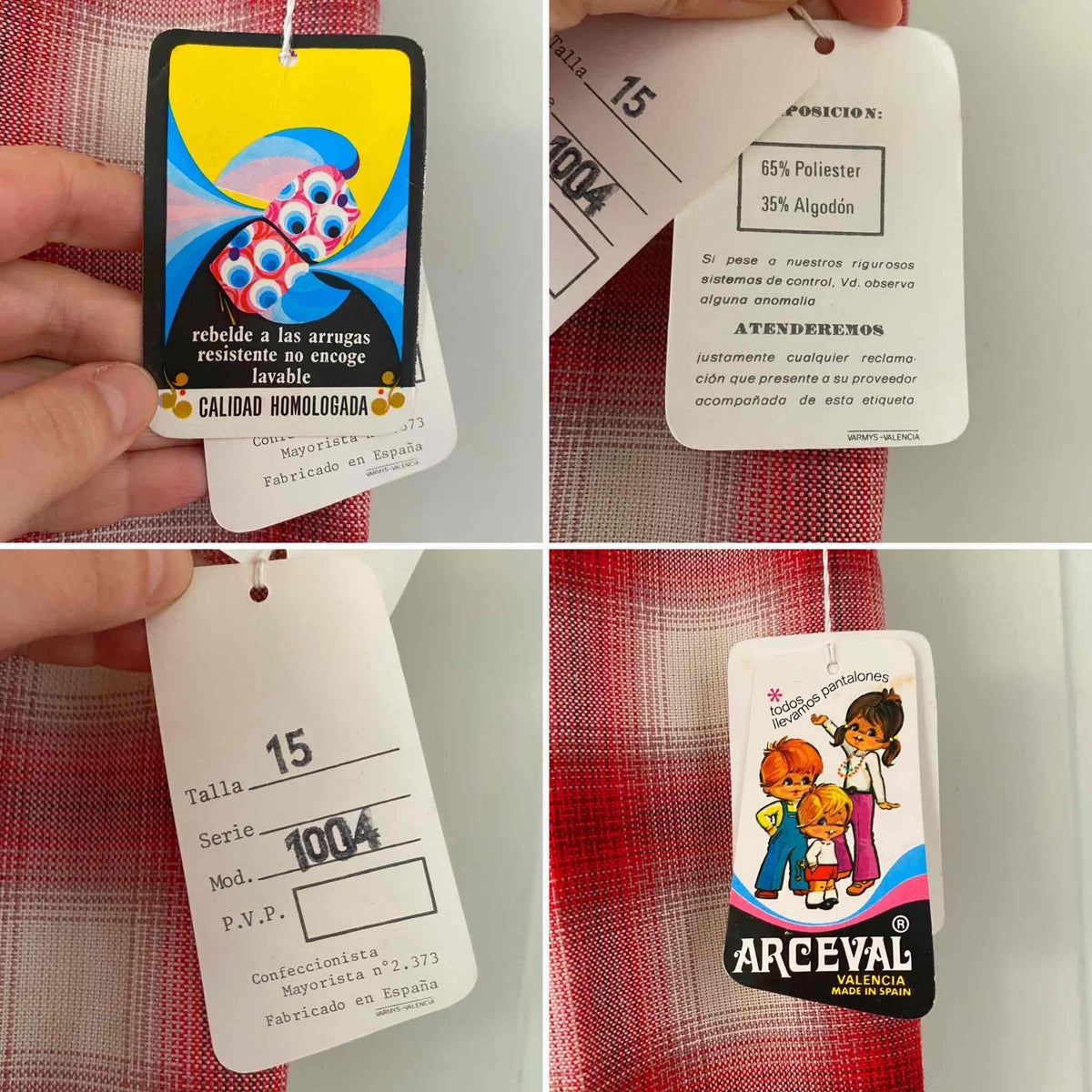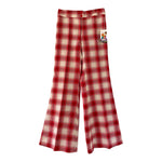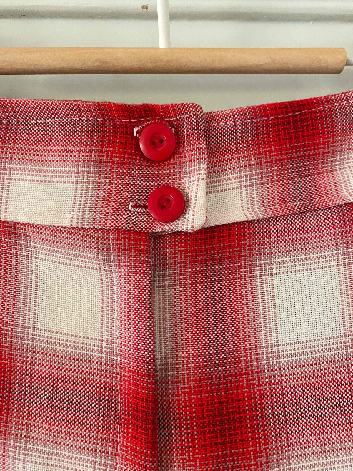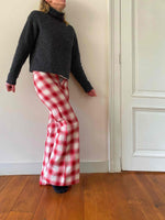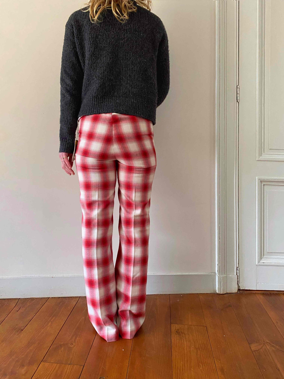 Prix unitaire parFlare à carreaux 70’s, en coton mélangé carreaux écrus, beiges et rouges, fabriqué en Espagne, deadstock des années 70’s, taille 34 porté ici ouvert sur une personne T36 et de 1m65, Mesures :