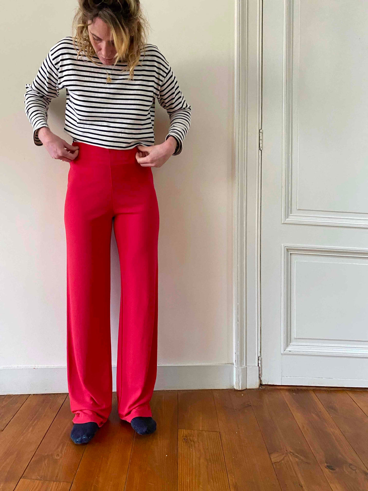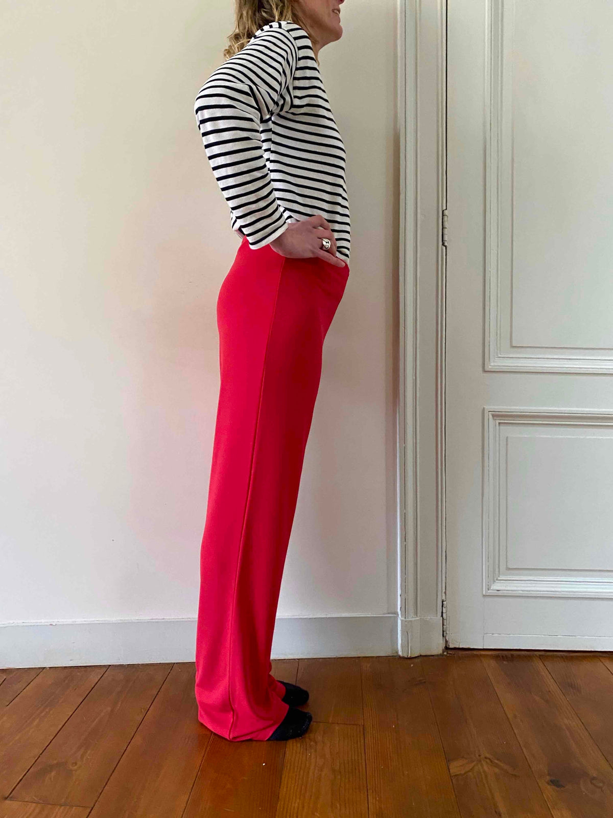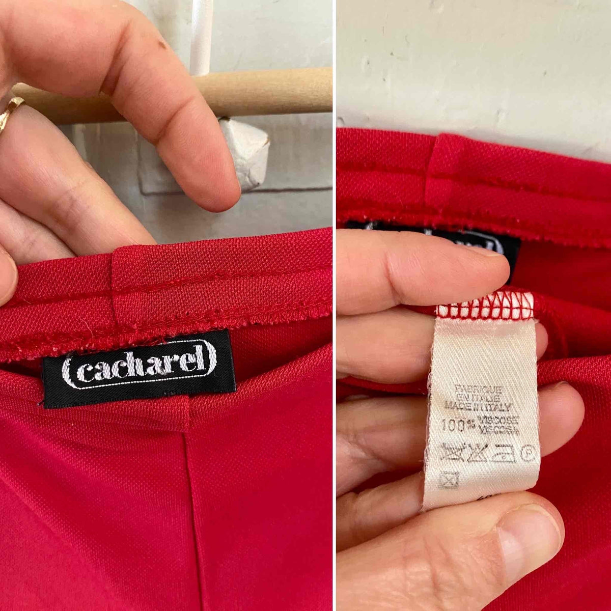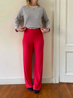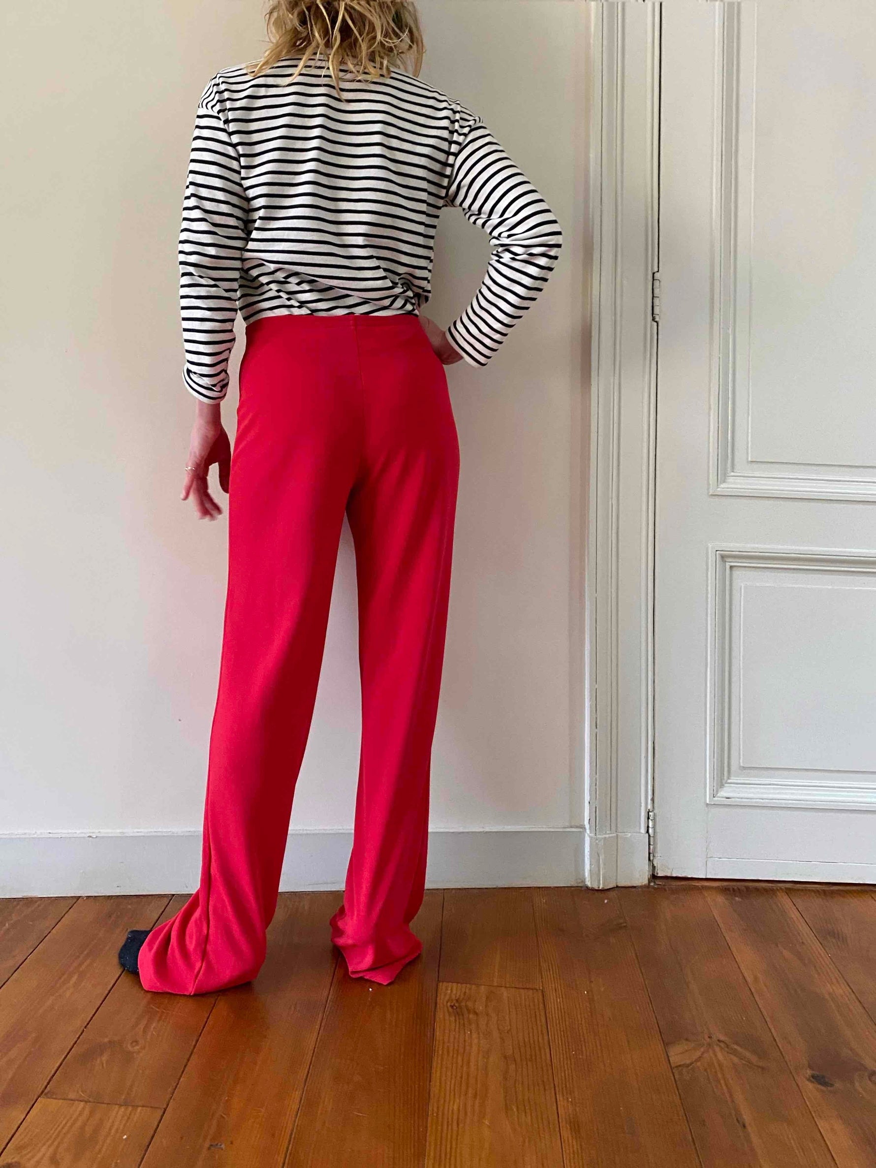 Prix unitaire parFlare Cacharel en maille fluide de viscose rouge, taille et maille élastique, fabriqué en Italie, taille 38 porté ici sur une personne T36 et de 1m65, mesures :