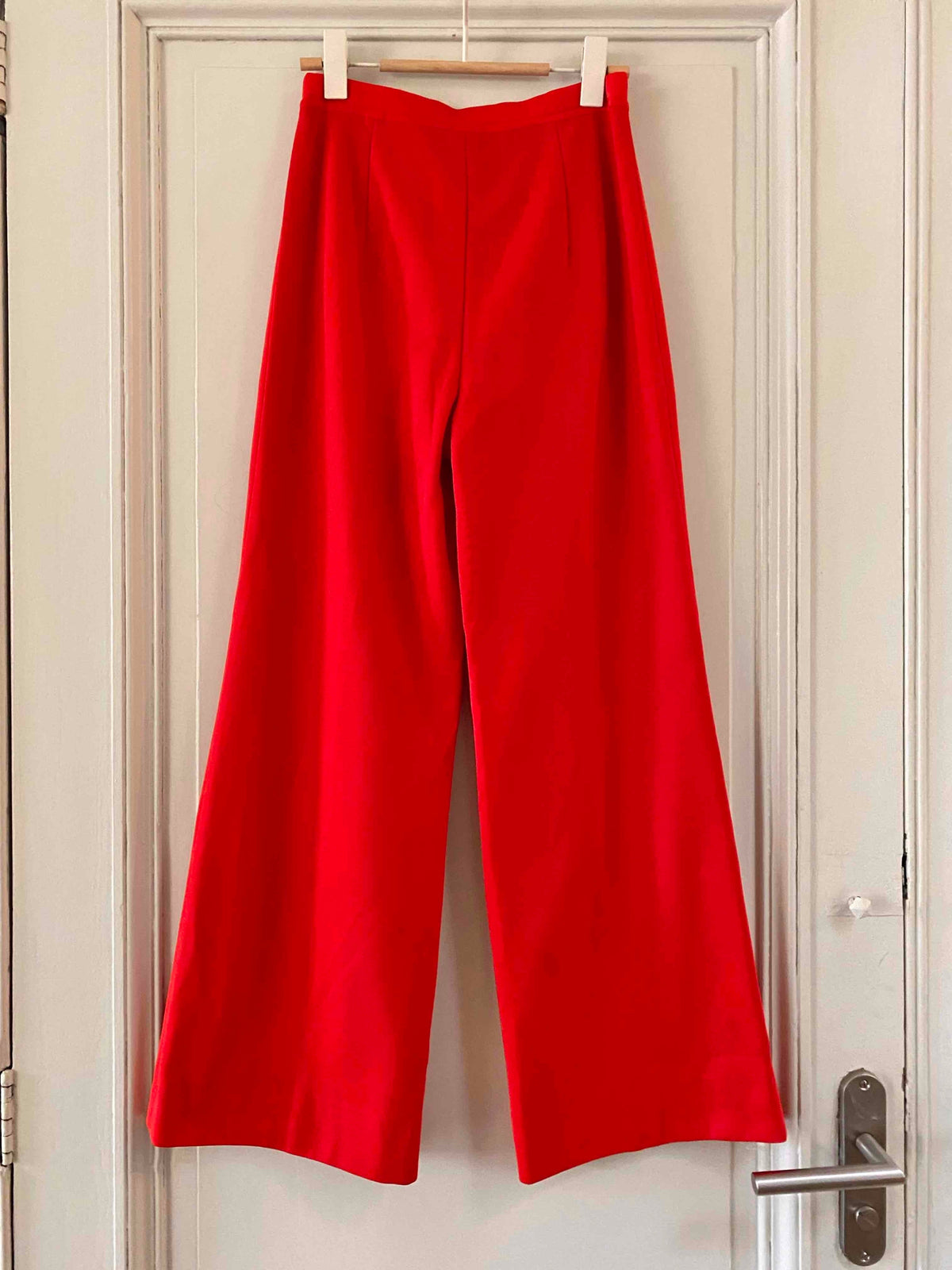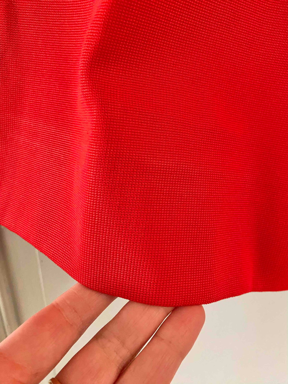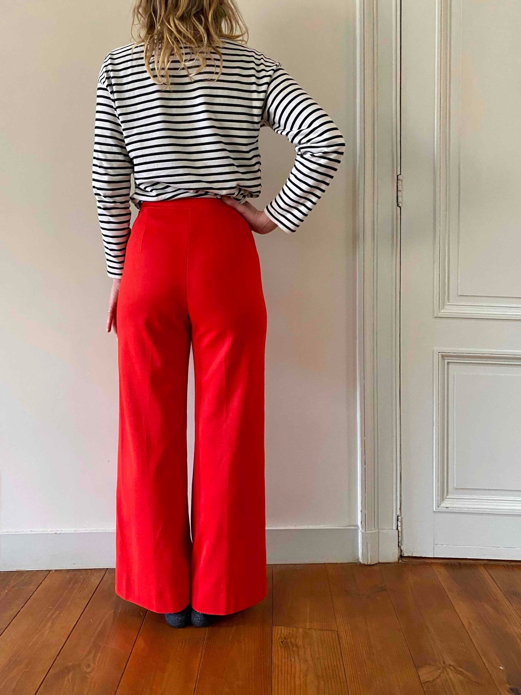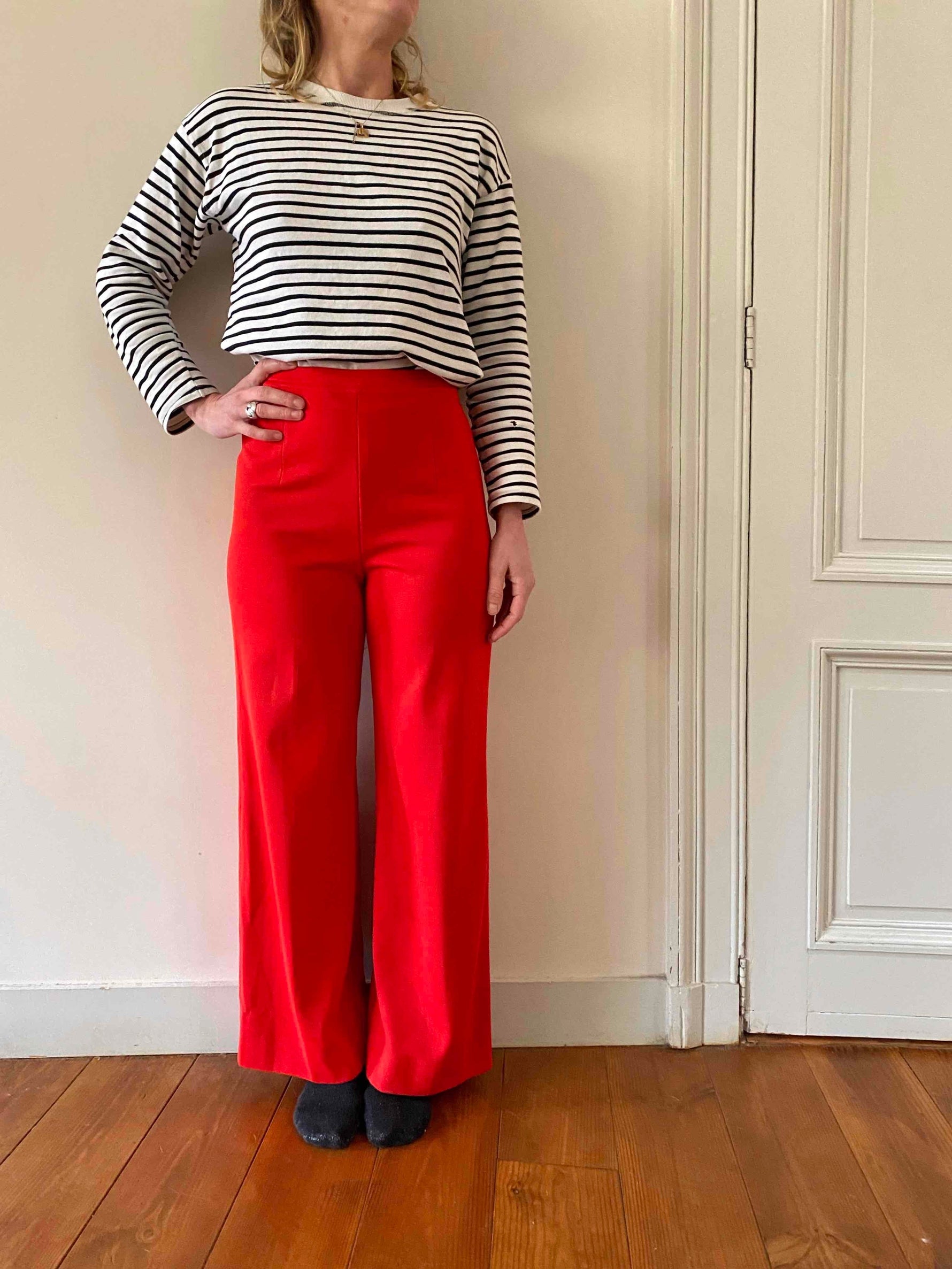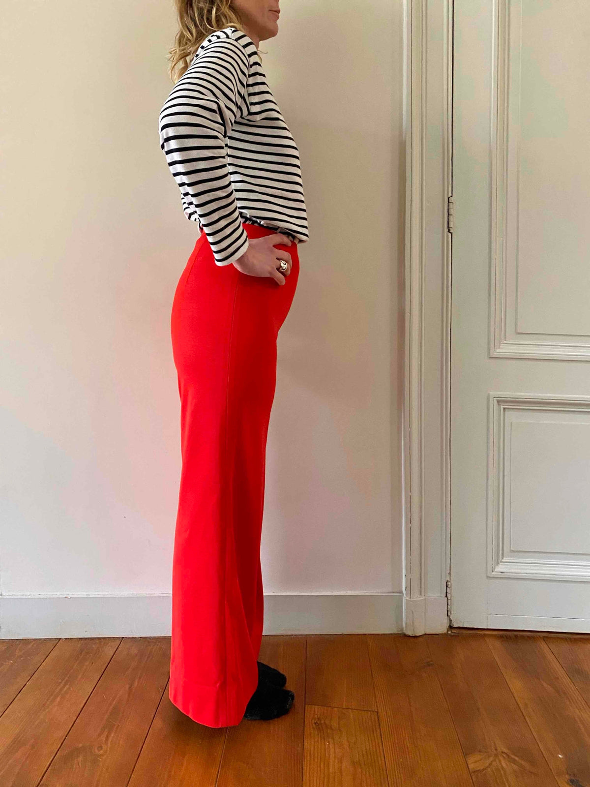 Prix unitaire parFlare en maille 90’s, en maille orange vermillon, taille haute élastique, années 90’s, taille 36 porté ici sur une personne T36 et de 1m65, mesures :