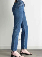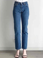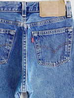 Icône du denim, ce 501 des années 90 en coton rigide bleu moyen est fabriqué aux USA. Coupe droite, allure intemporelle, très bon état.