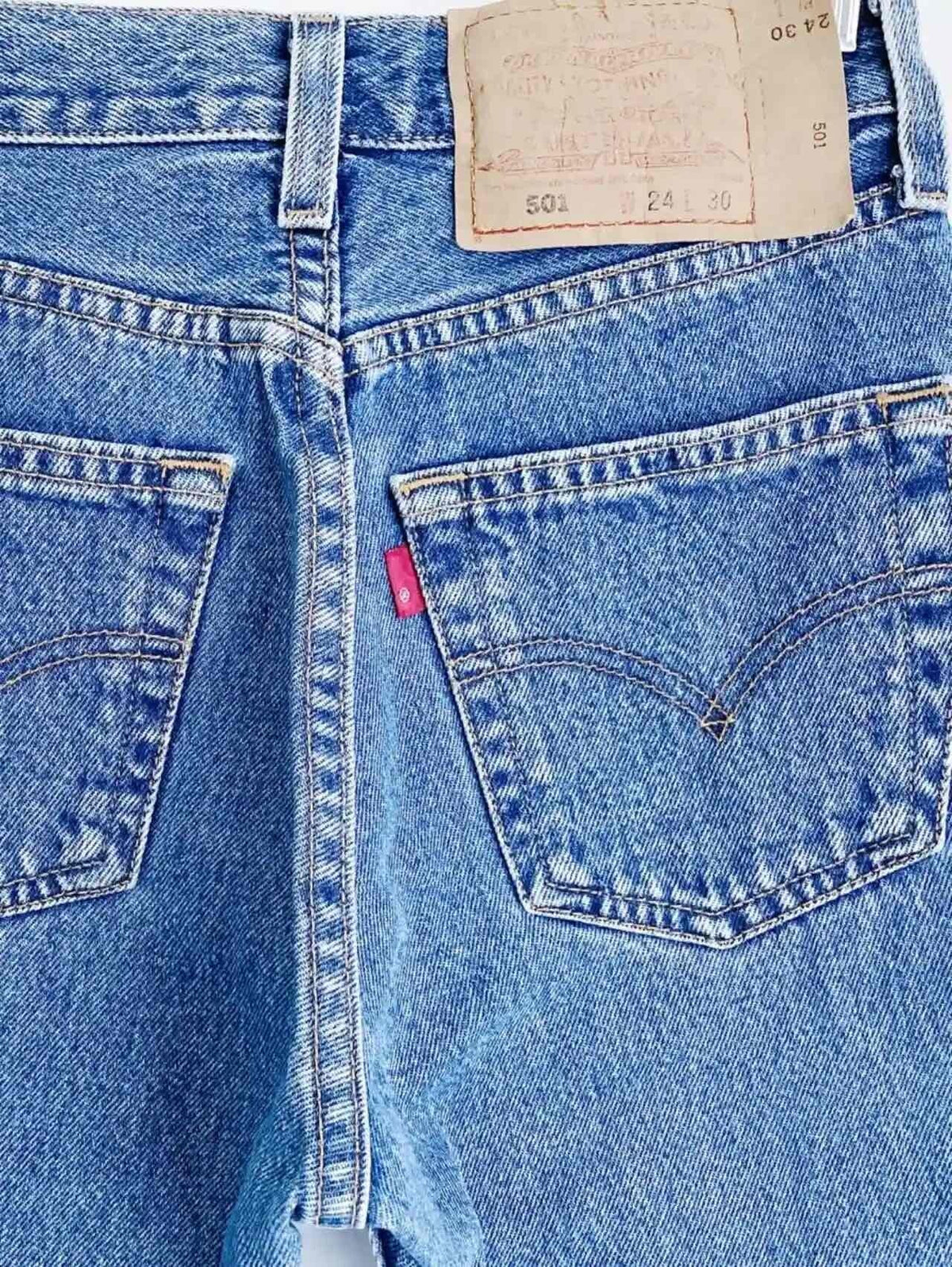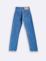 Icône du denim, ce 501 des années 90 en coton rigide bleu moyen est fabriqué au Mexique. Coupe droite, allure intemporelle, état parfait.