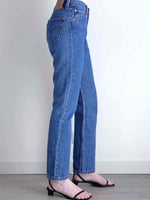 Icône du denim, ce 501 des années 90 en coton rigide bleu moyen est fabriqué au Mexique. Coupe droite, allure intemporelle, état parfait.