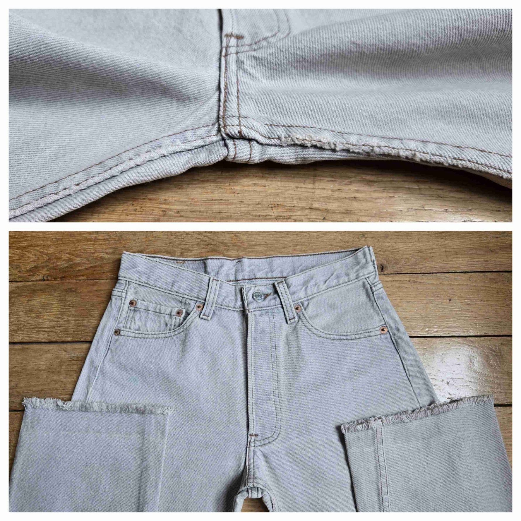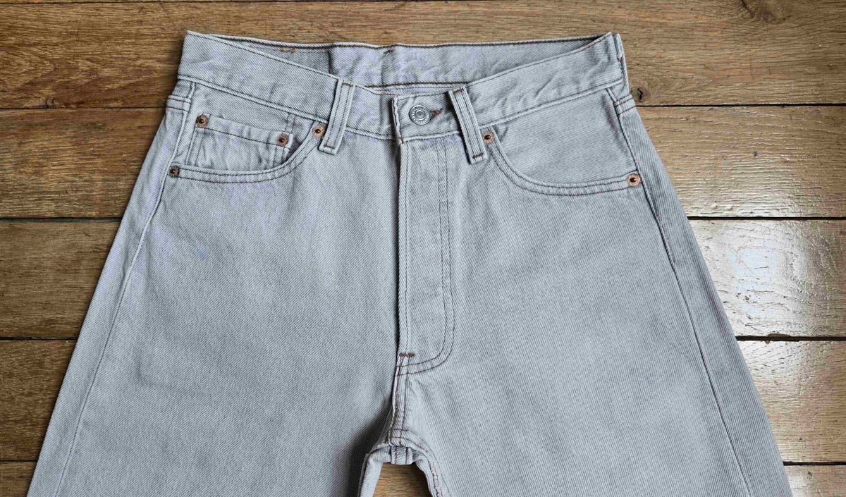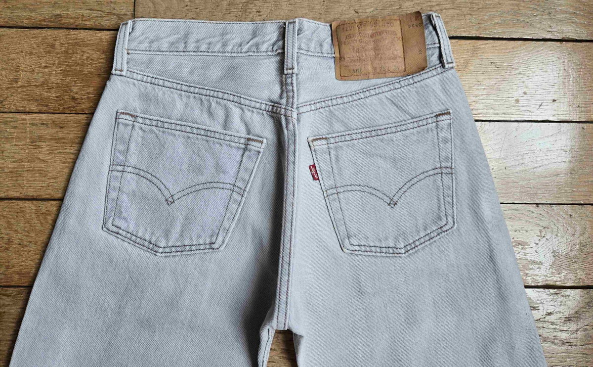 Prix unitaire parJean Levi's 501 W28 L34 gris clair. Ourlets coupés. Made in USA. Longueur ext jambe 101 cm. Hauteur fourche 27 cm. Vous pouvez comparer les mesures avec celles de votre jean favori prises à plat.
