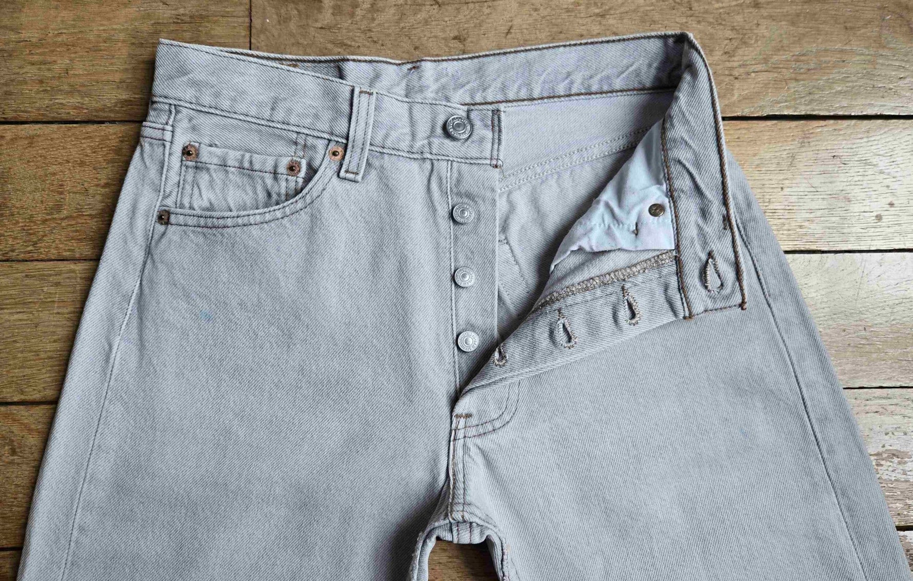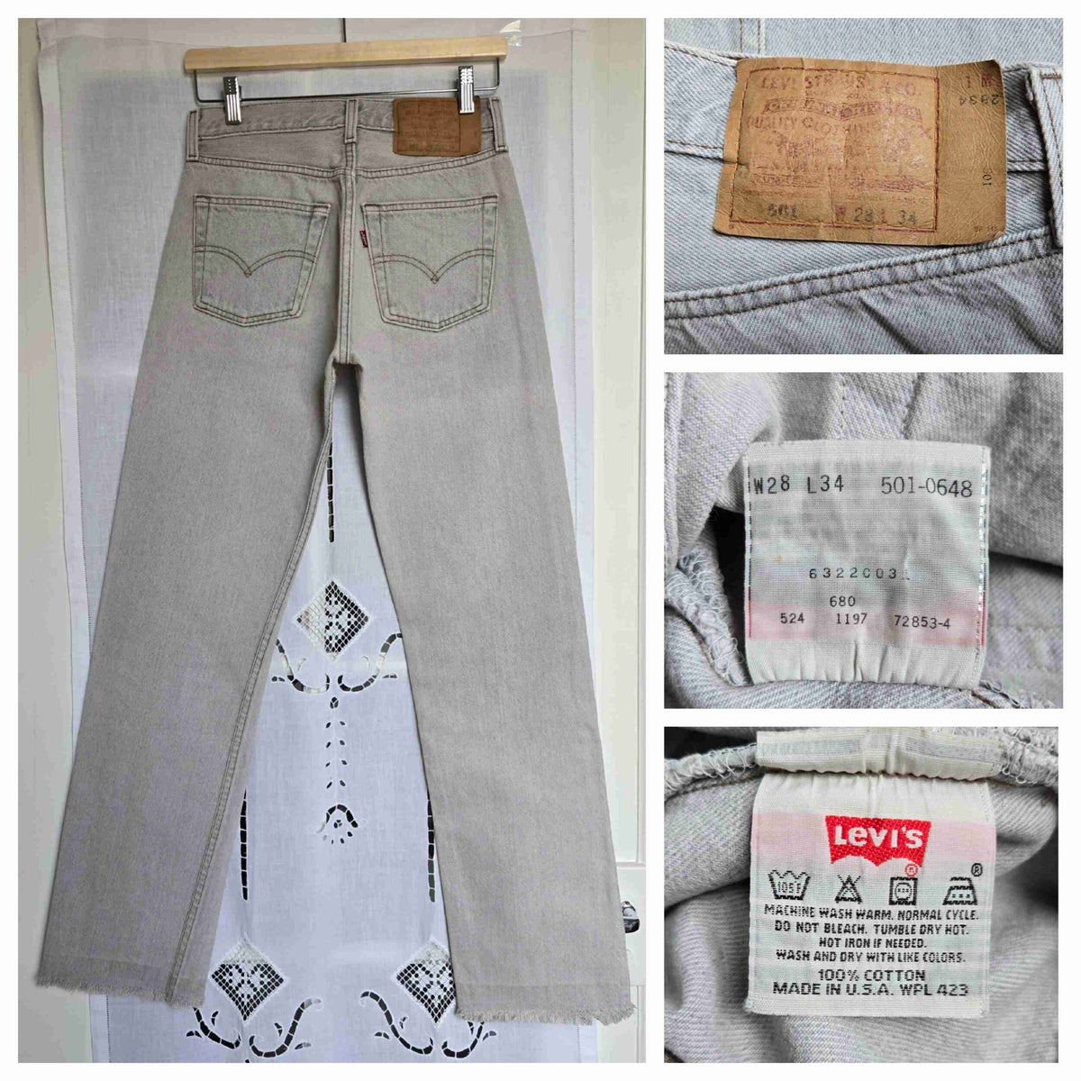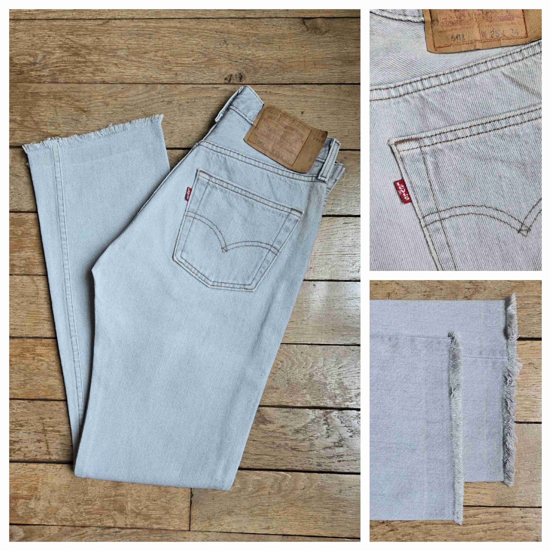 Prix unitaire parJean Levi's 501 W28 L34 gris clair. Ourlets coupés. Made in USA. Longueur ext jambe 101 cm. Hauteur fourche 27 cm. Vous pouvez comparer les mesures avec celles de votre jean favori prises à plat.