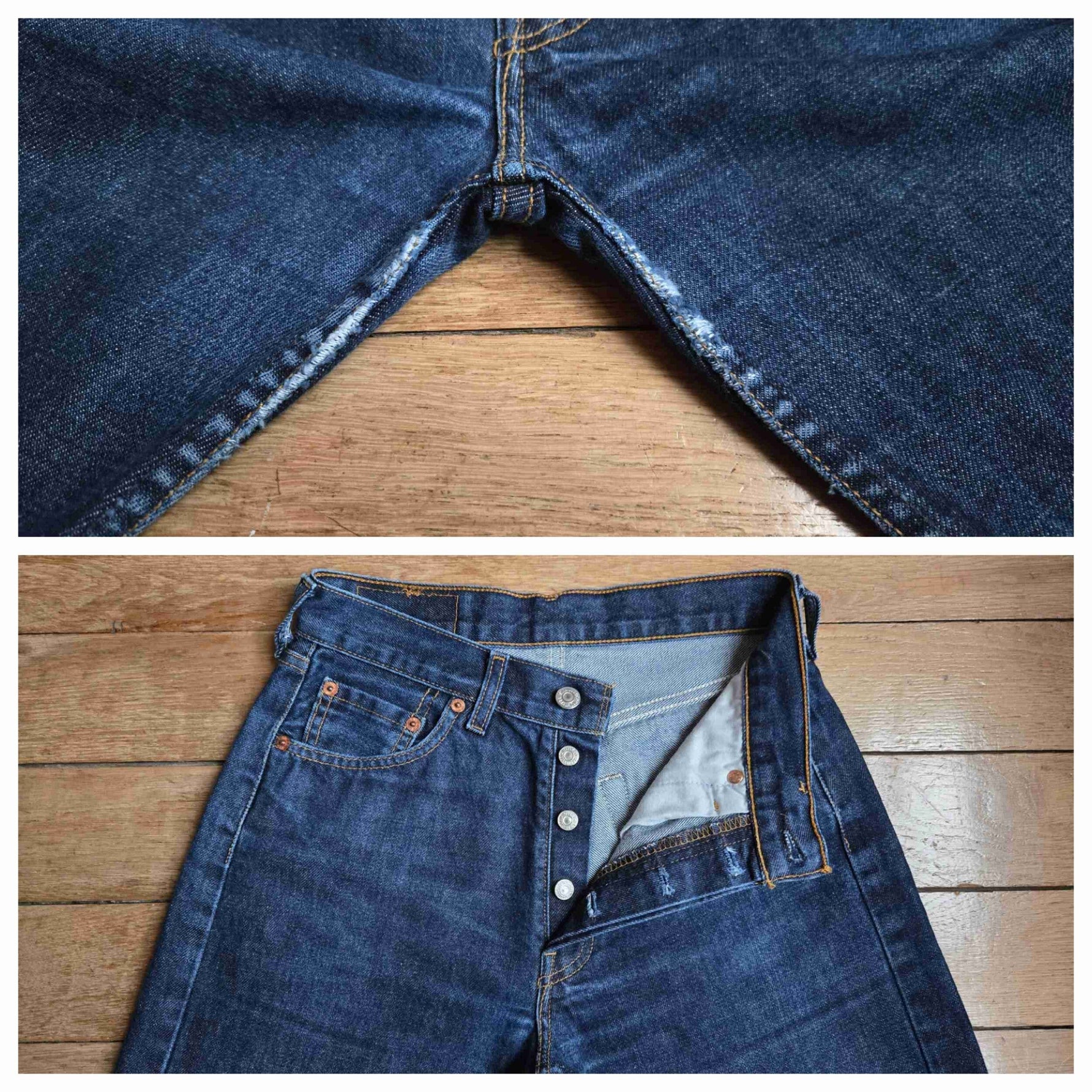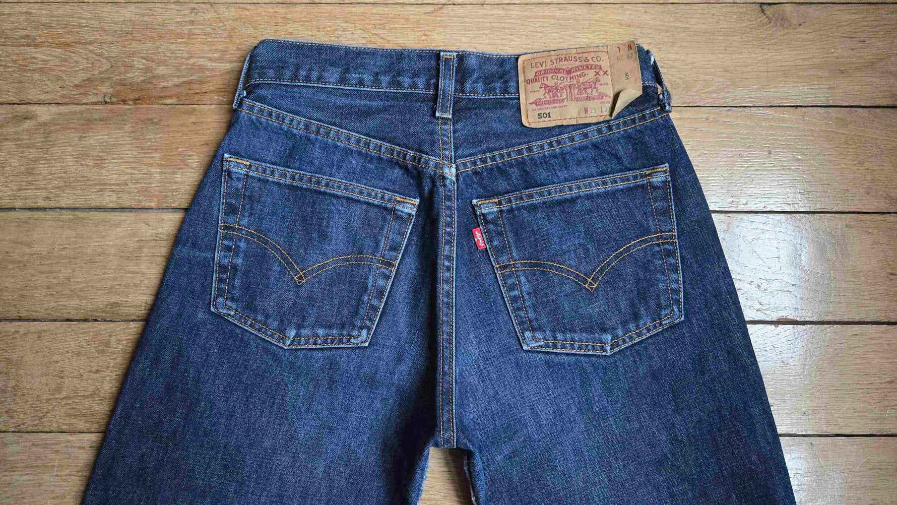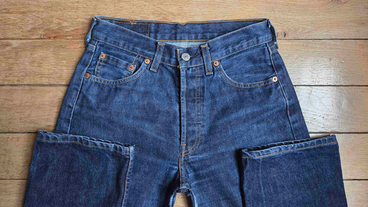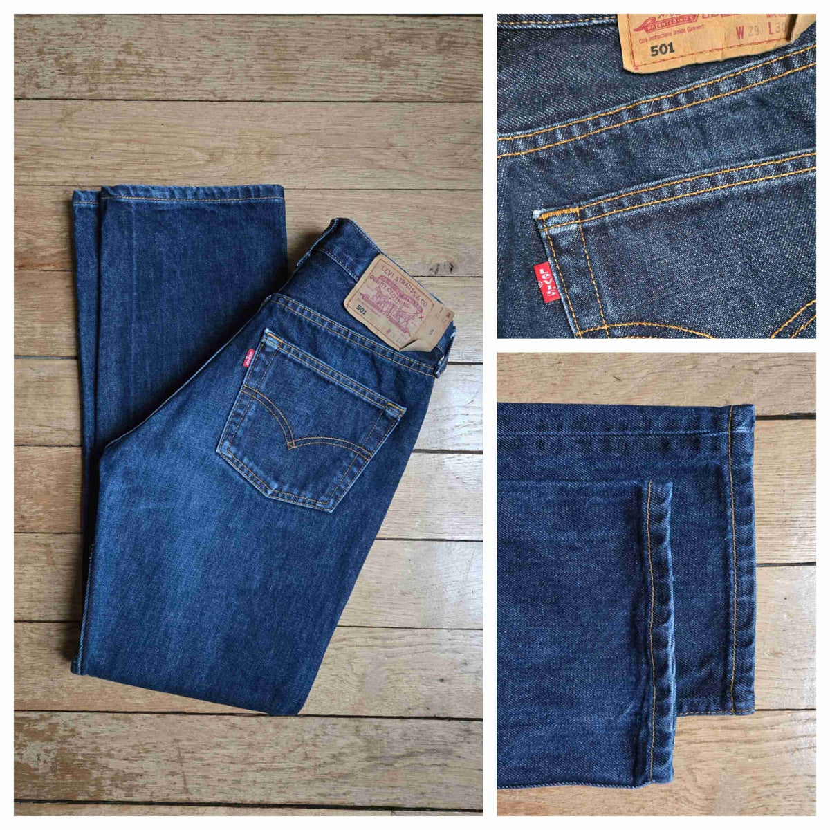 Prix unitaire parJean Levi's 501 W29 L30 bleu foncé. Ourlets d'origine. 100% coton. Toile solide. Longueur ext jambe 98 cm. Hauteur fourche 27 cm.