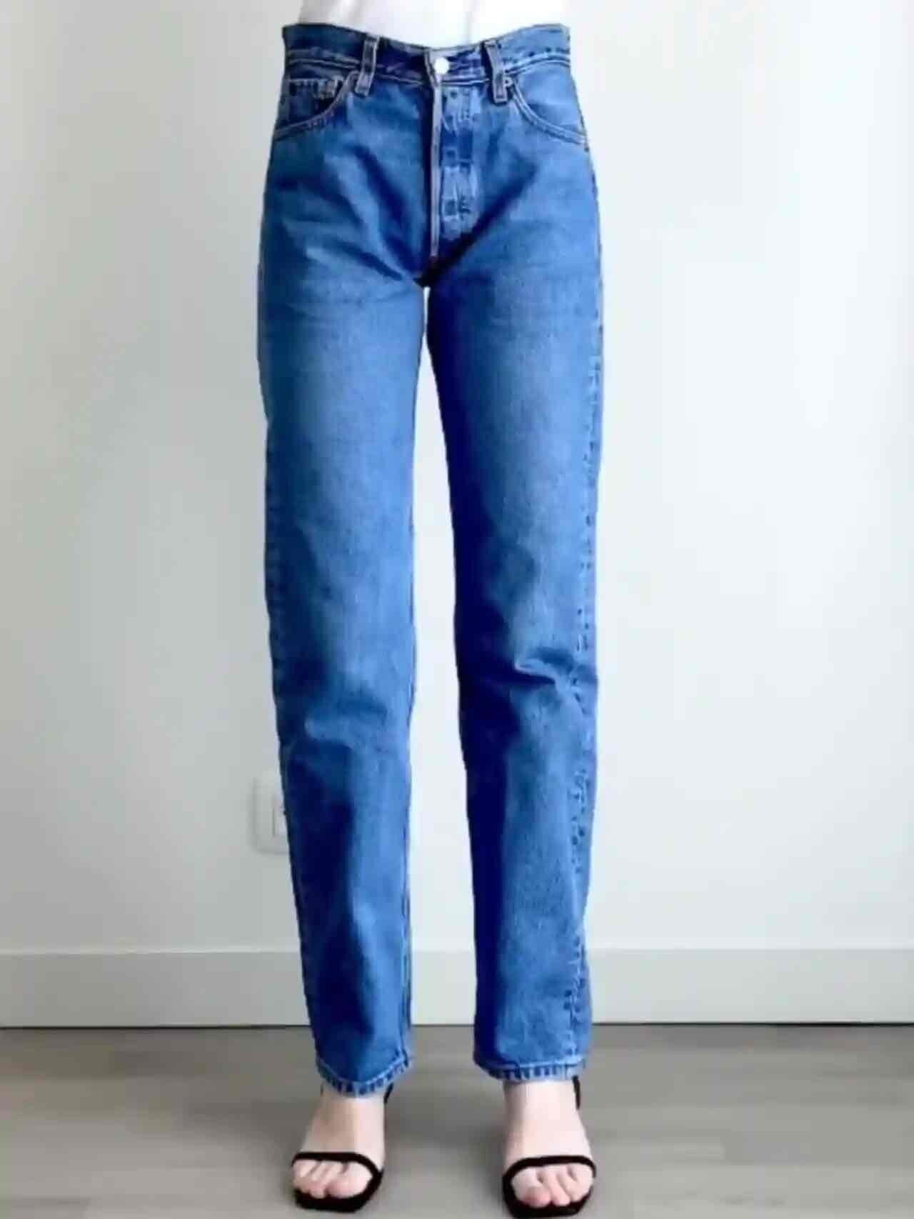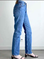 Icône du denim, ce 501 des années 90 en coton rigide bleu moyen est fabriqué au Guatemala. Coupe droite, allure intemporelle, état parfait.