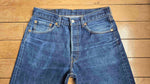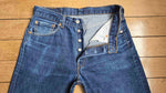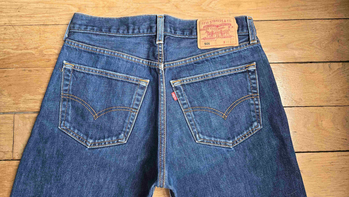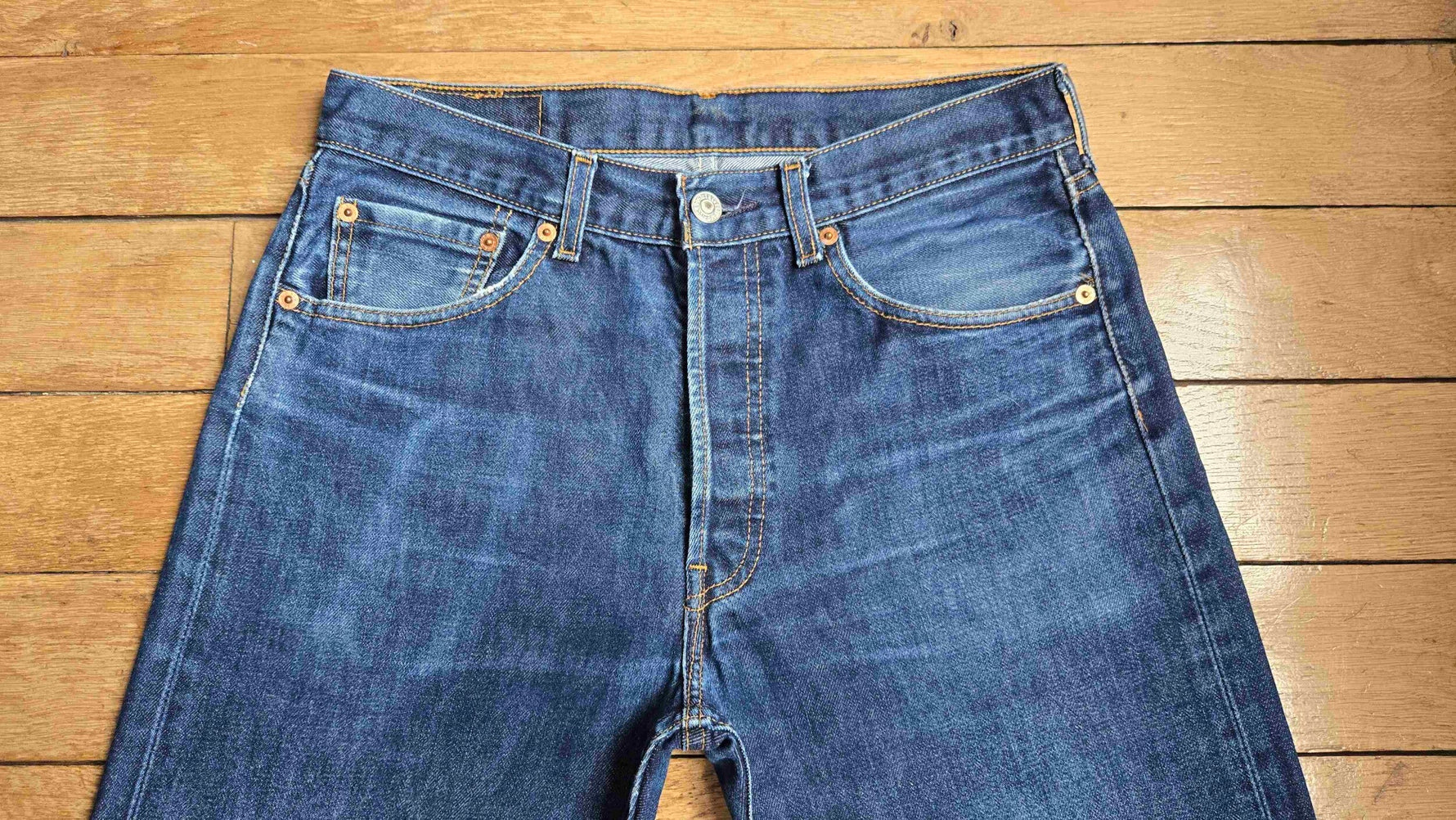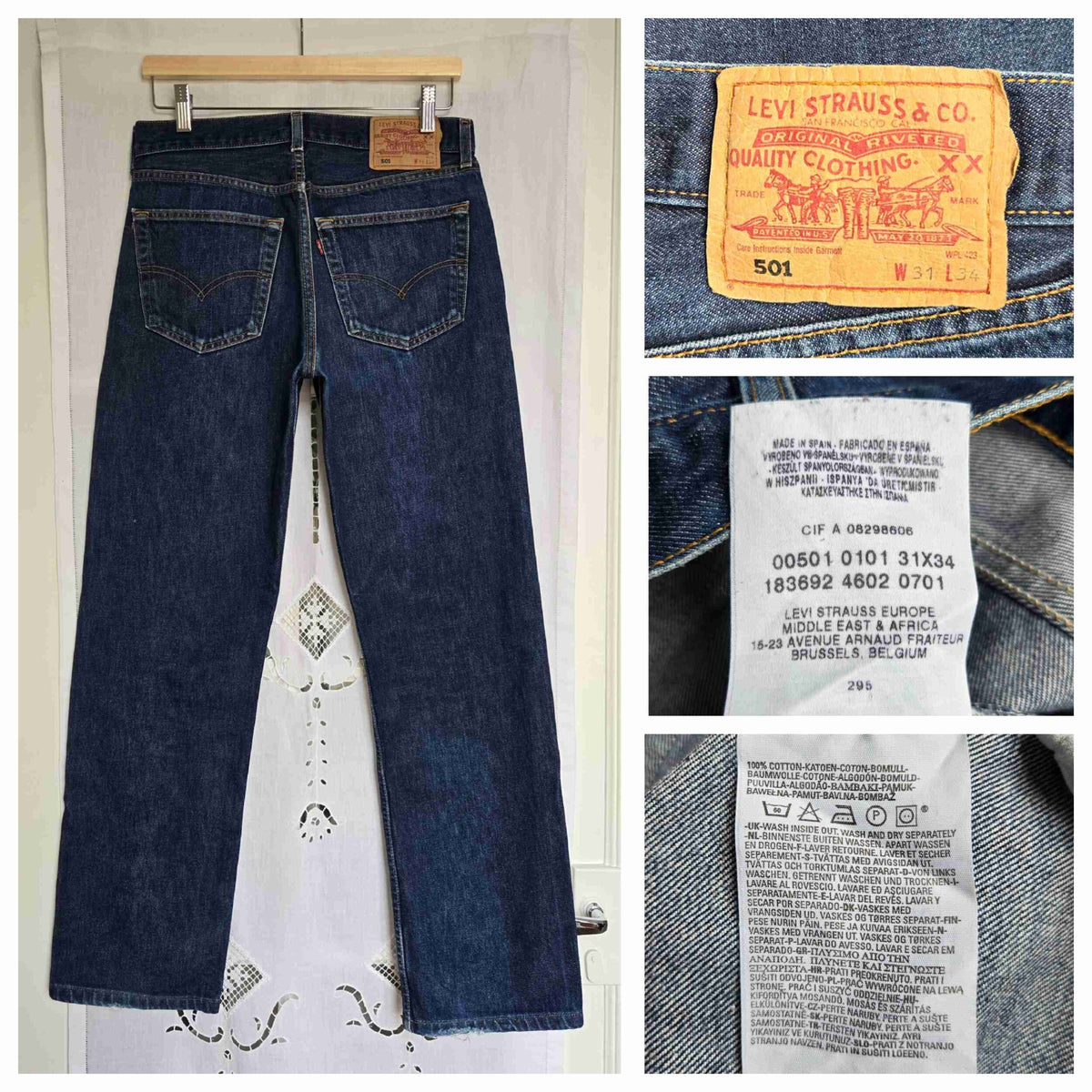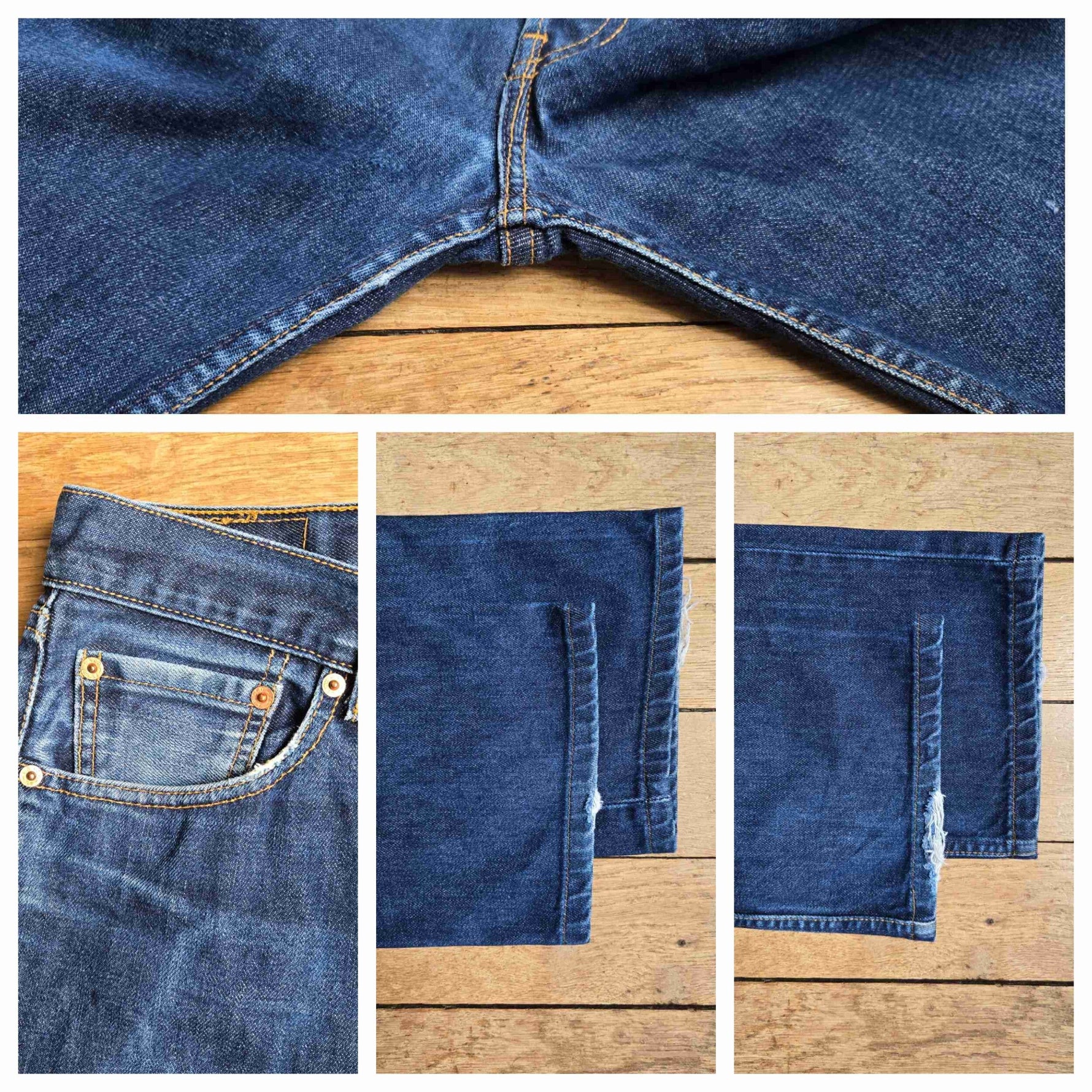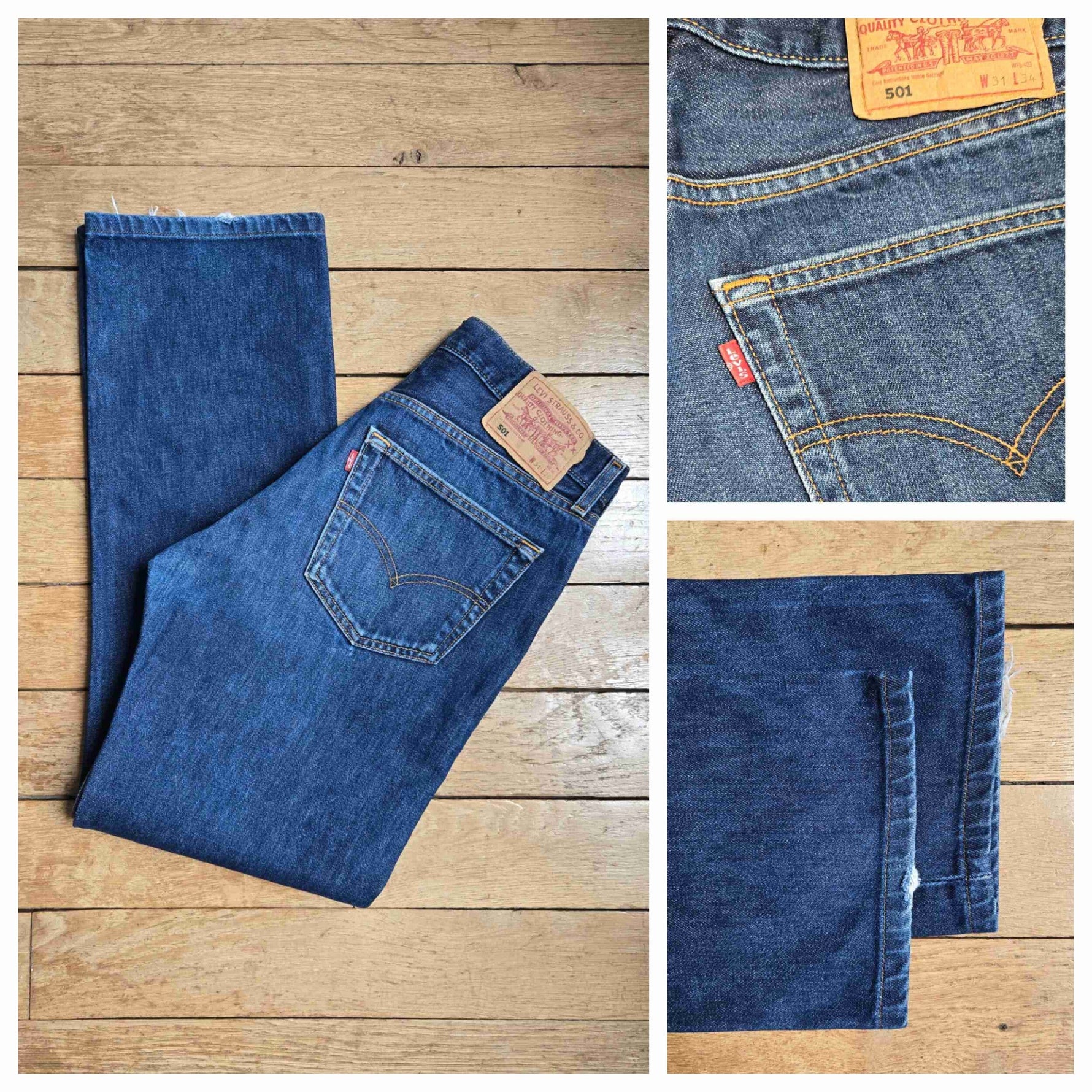 Jean Levi's 501 W31 L34 bleu moyen. Ourlets non d'origine. 100% coton. Made in Spain. Longueur extérieur jambe 102 cm. Hauteur fourche 28 cm. Vous pouvez comparer les mesures avec celles de votre jean favori : étalez-le entièrement à plat avant de mesurer.