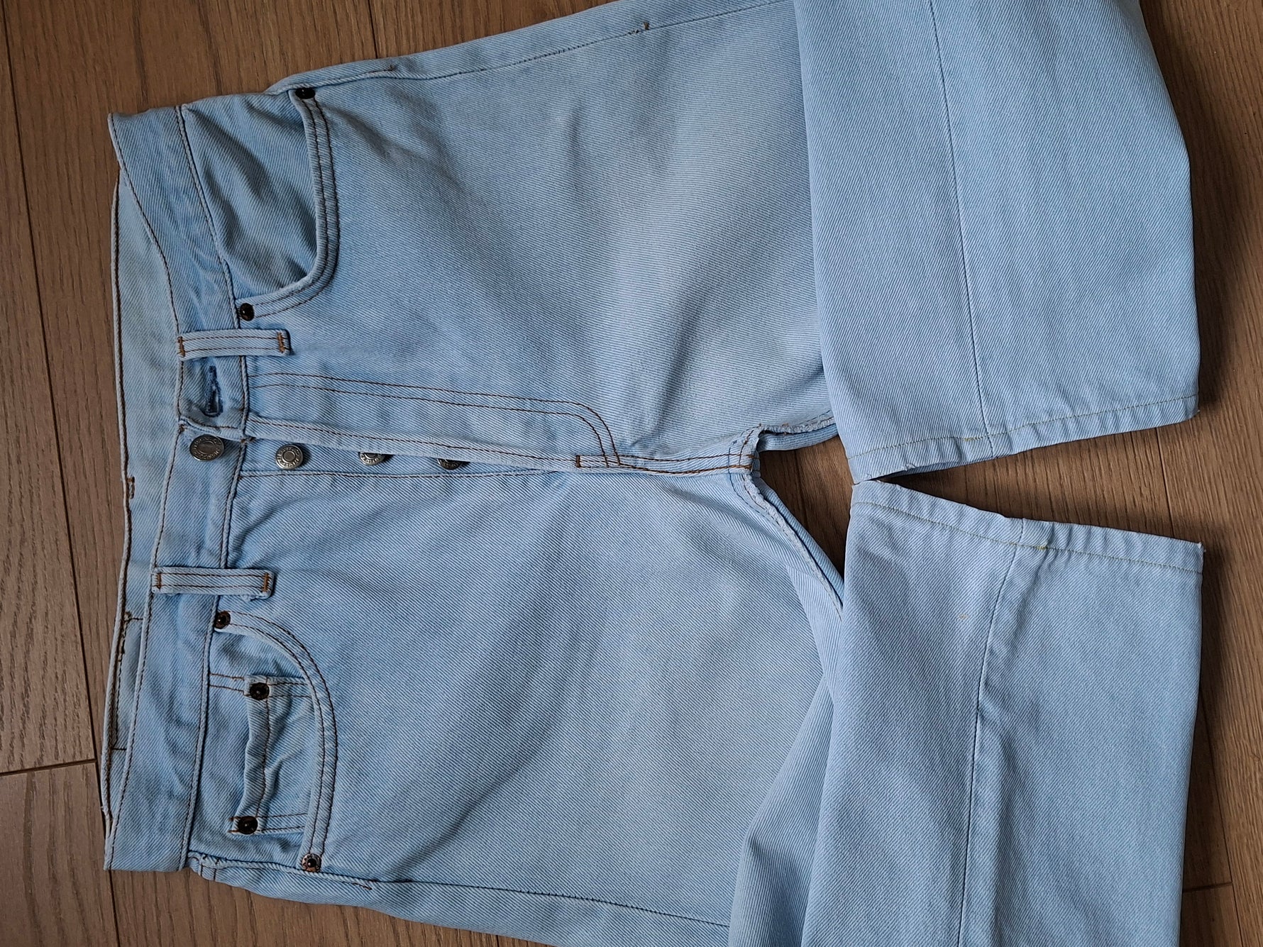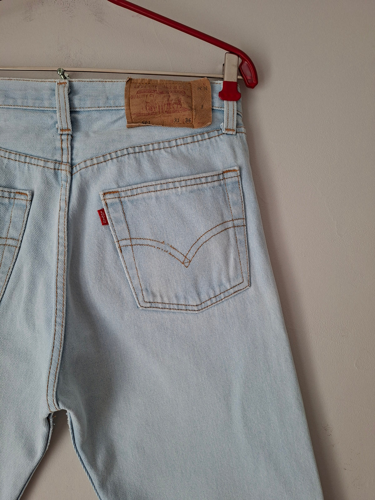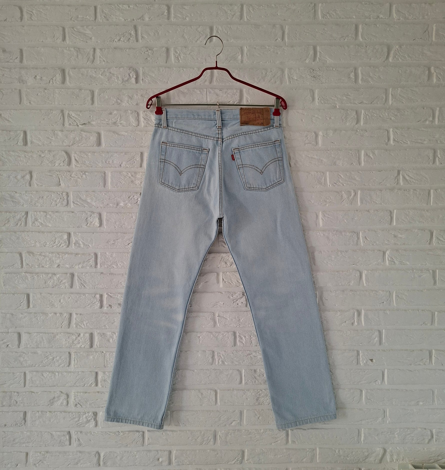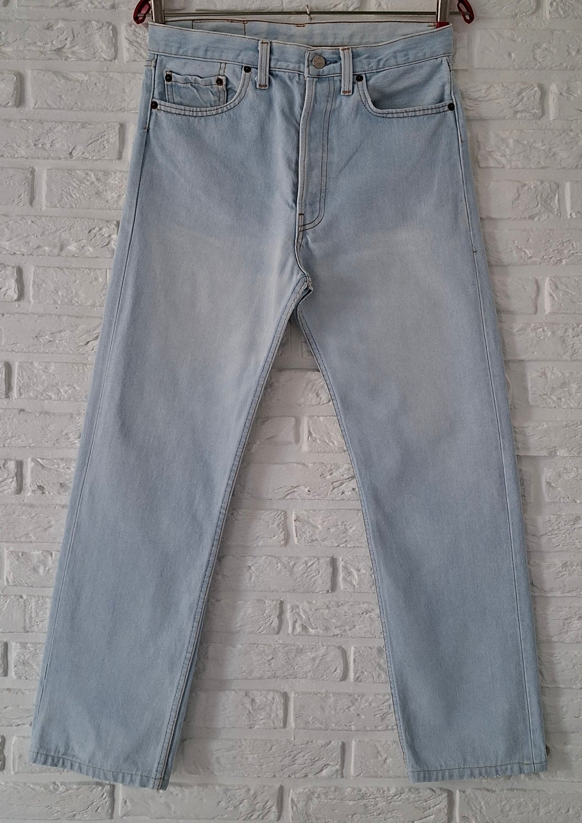 Jean Levi's 501 W31 L36 Made in USA. Denim bleu clair. Ourlets refaits à l’identique. Taille à plat 38cm Hanches 48cm Longueur 96cm Entrejambe 69cm (légère usure à l’entrejambe )