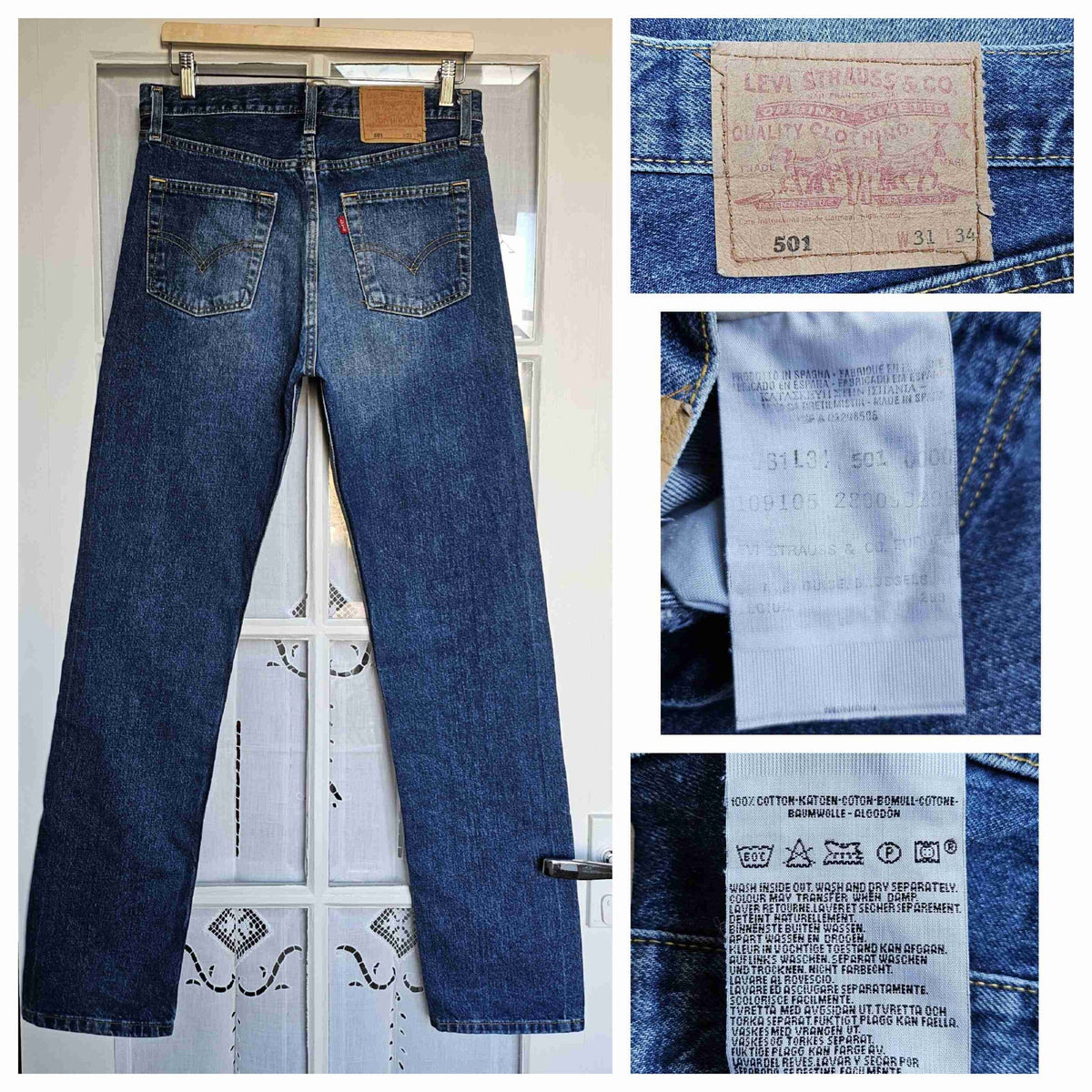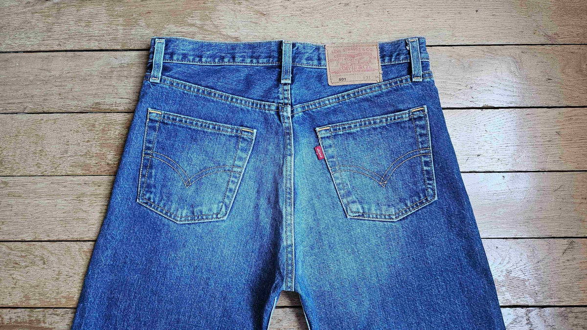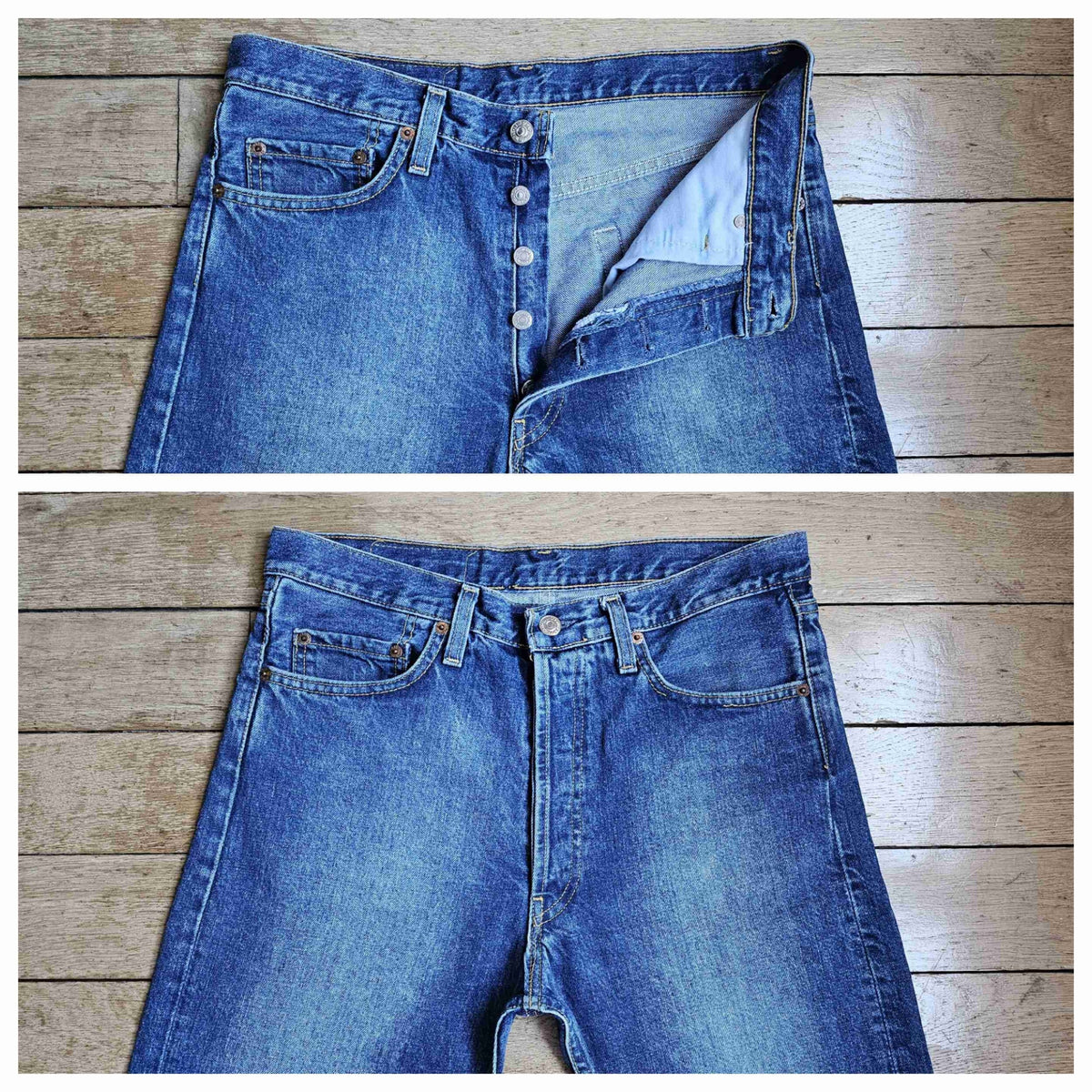 bleu moyen. Ourlets d'origine. 100% coton. Longueur extérieur jambe 114 cm. Hauteur fourche 30 cm.