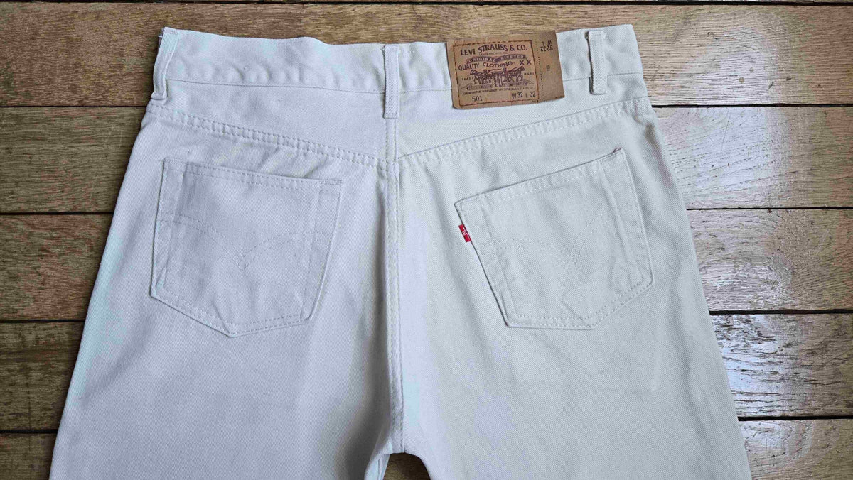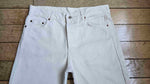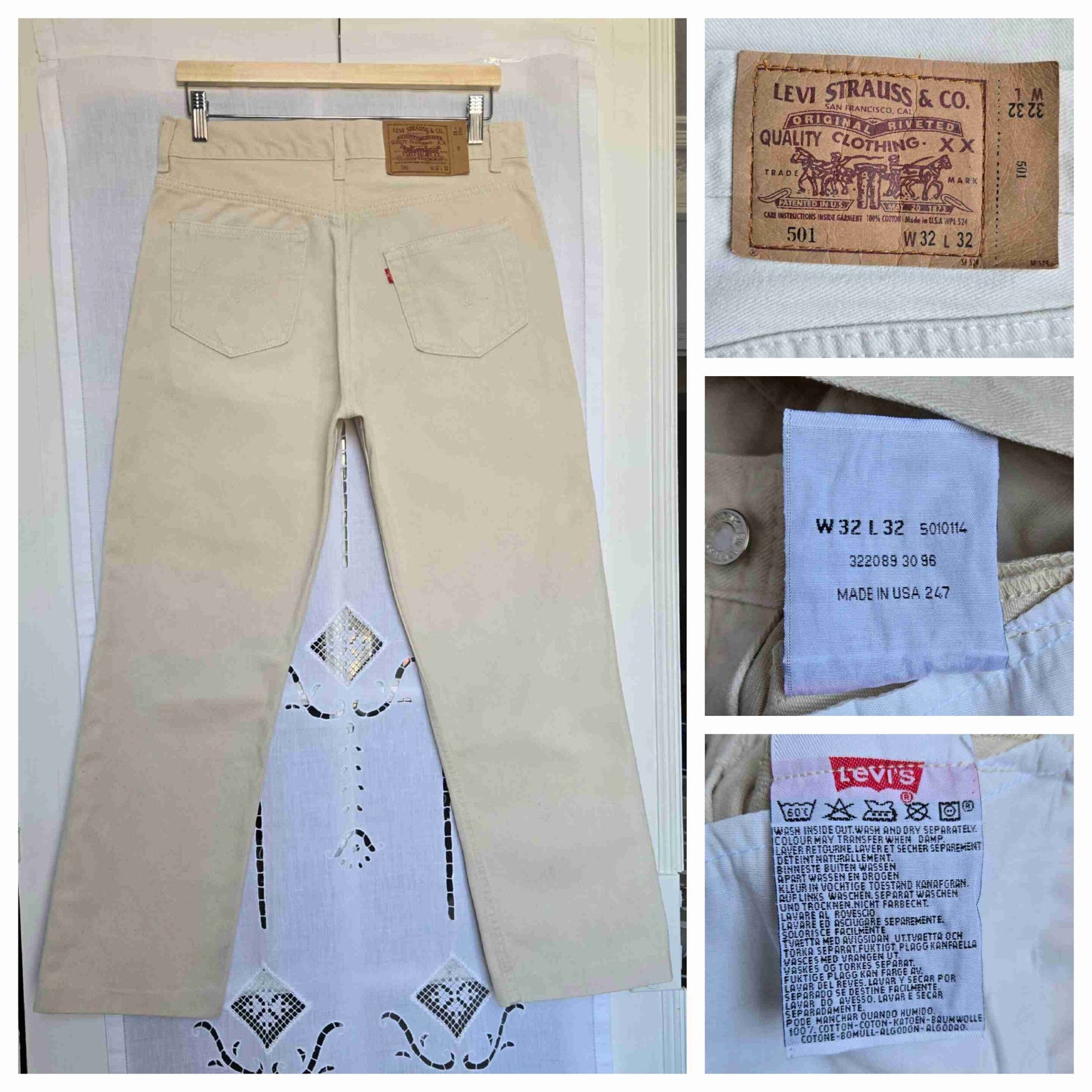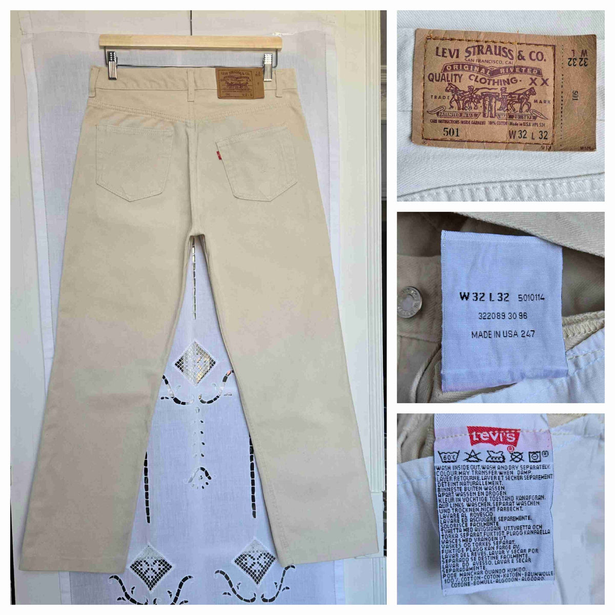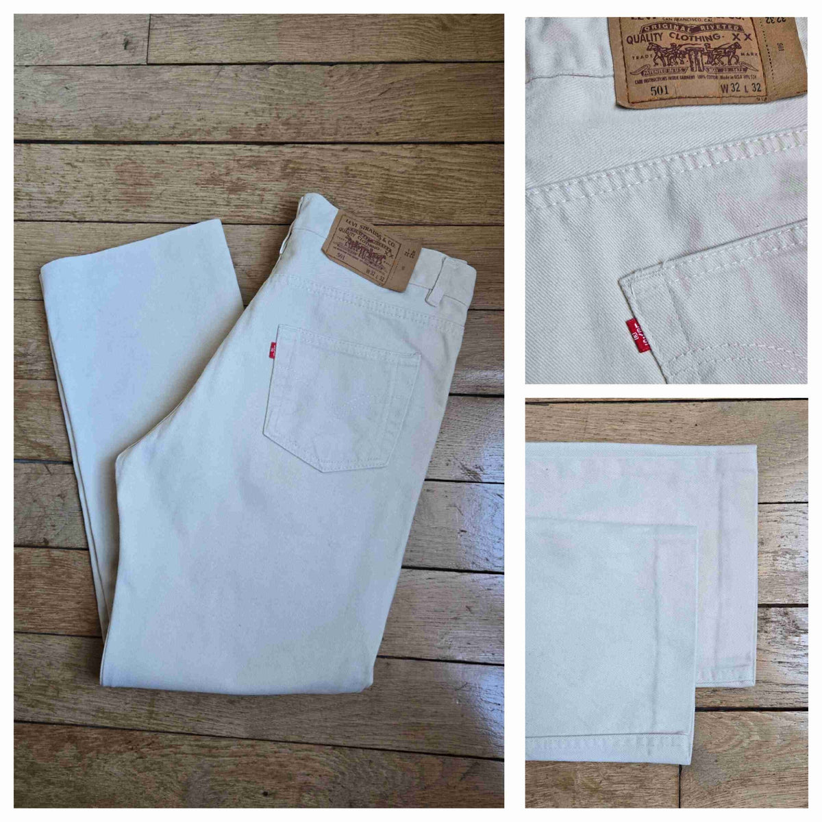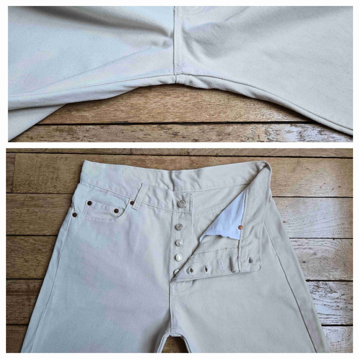 Jean Levi's 501 W32 L32 en denim peau de pêche beige clair. Ourlets non d'origine. 100 % coton. Made in USA. Longueur extérieur jambe 99 cm. Hauteur fourche 29.5 cm. Vous pouvez comparer les mesures avec celles de votre jean favori prises bien à plat.