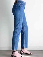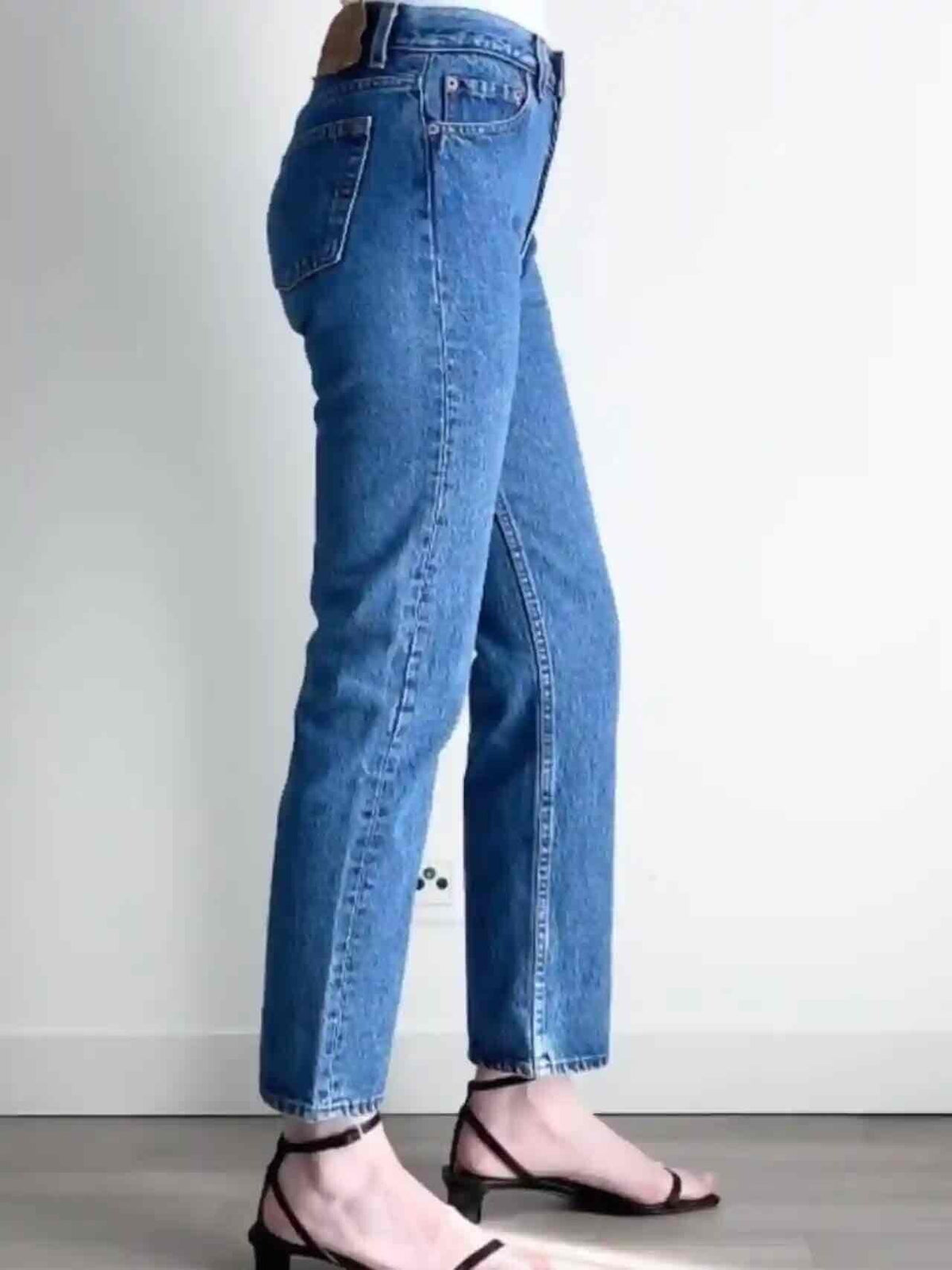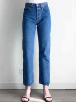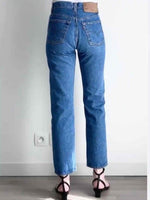 Icône du denim, ce 501 des années 90 en coton rigide bleu moyen est fabriqué aux USA. Coupe droite, allure intemporelle, parfait état.