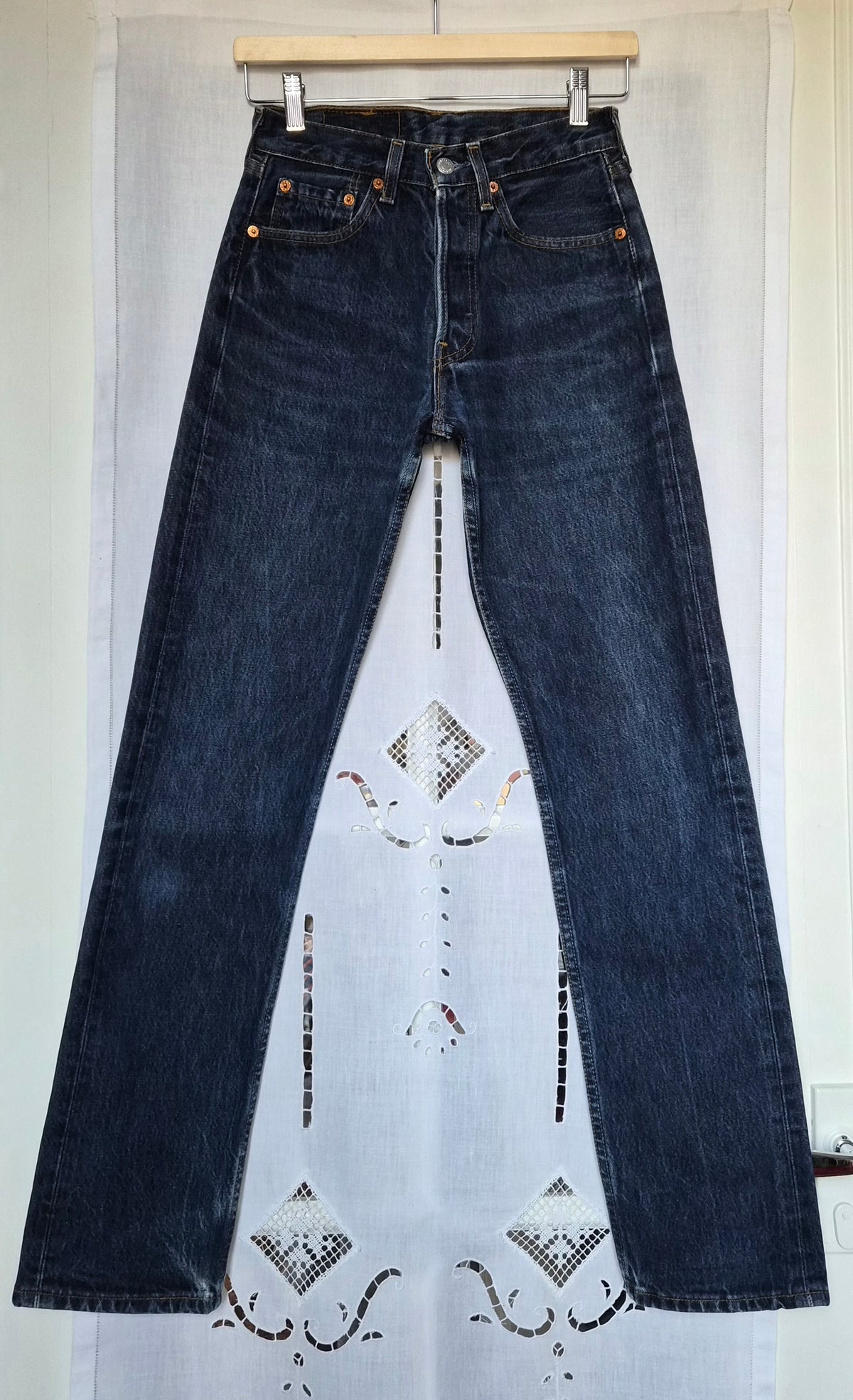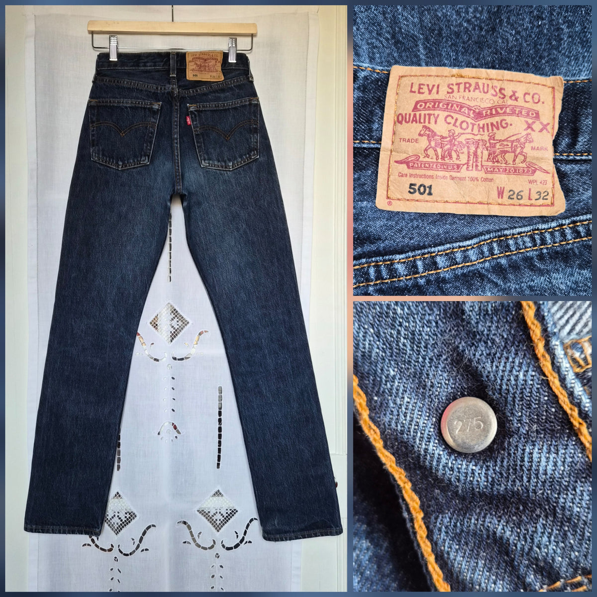 Prix unitaire parJean Levi's 501 W26L32 bleu moyen. Ourlets d'origine. 100% coton. Etiquette intérieure coupée. Bouton 275 : made in France.Taille 31 cm / hanches 50 cm / hauteur fourche 27 cm / longueur extérieur jambe 103 cm / longueur entrejambe 79 cm. Vous pouvez comparer les mesures avec celles de votre jean favori, prises bien à plat.
