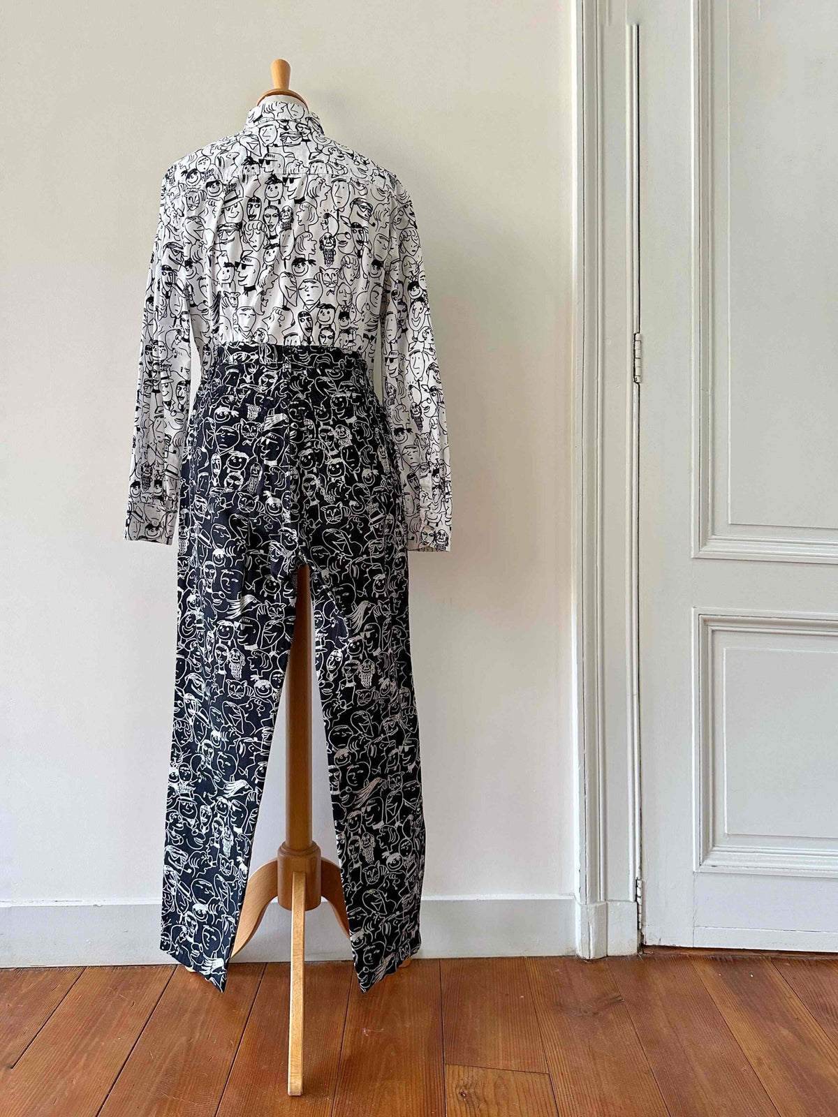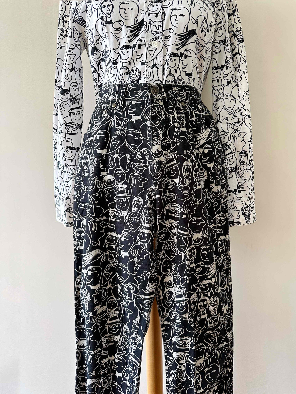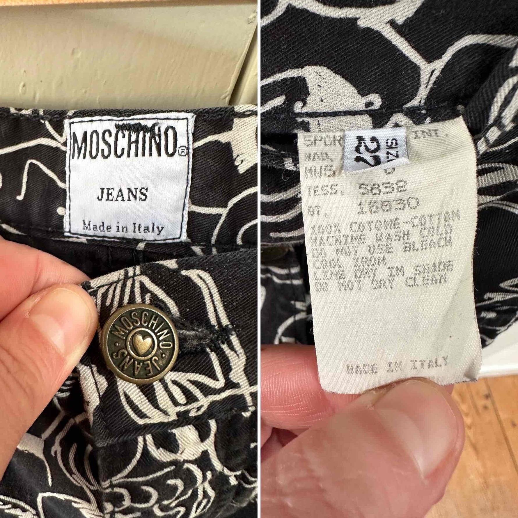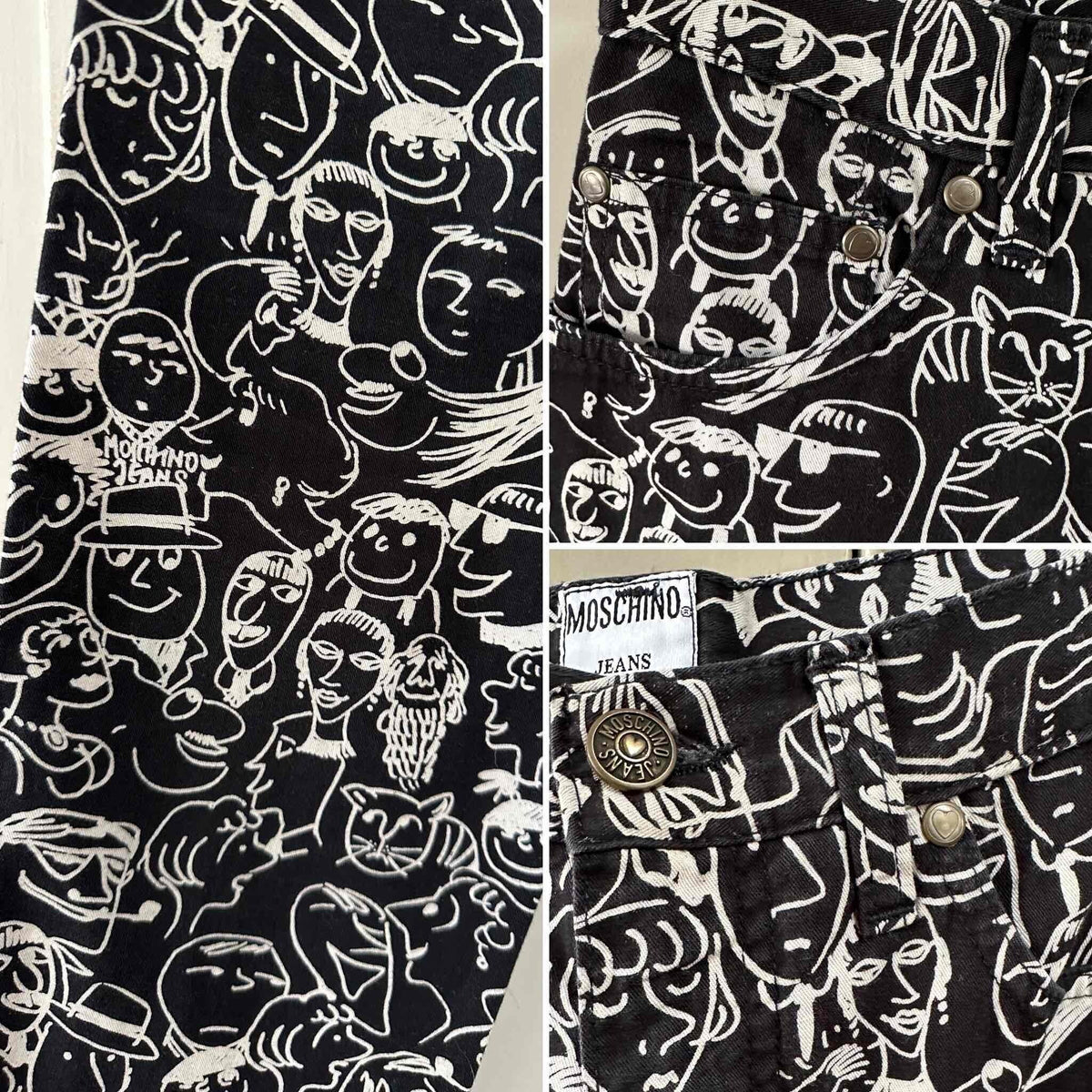 Prix unitaire parJeans Moschino, en coton denim noir imprimé motifs visages et personnages au trait blancs, taille haute, fabriquée en Italie, taille 42 i : tailles 36 portée ici sur un mannequin T36.