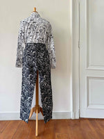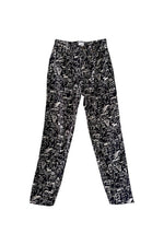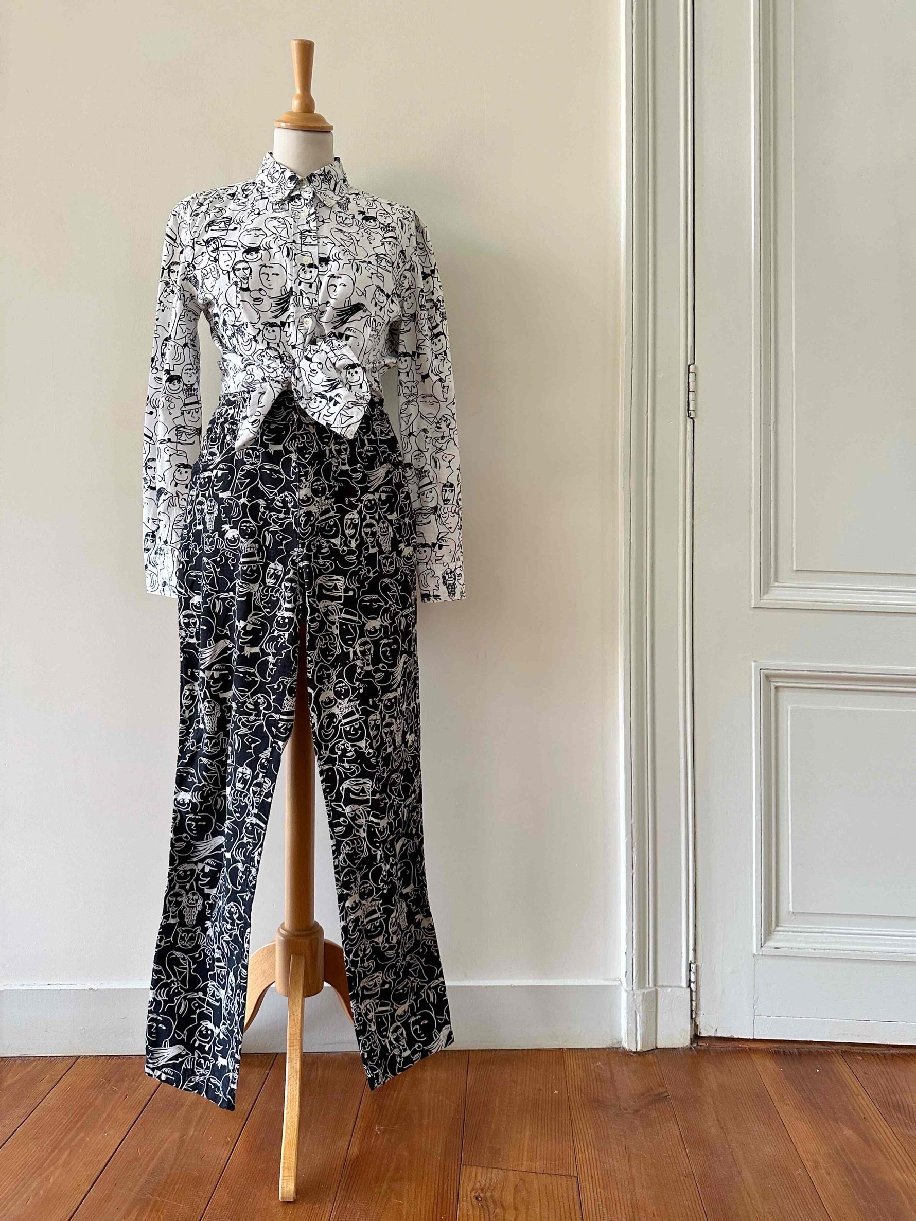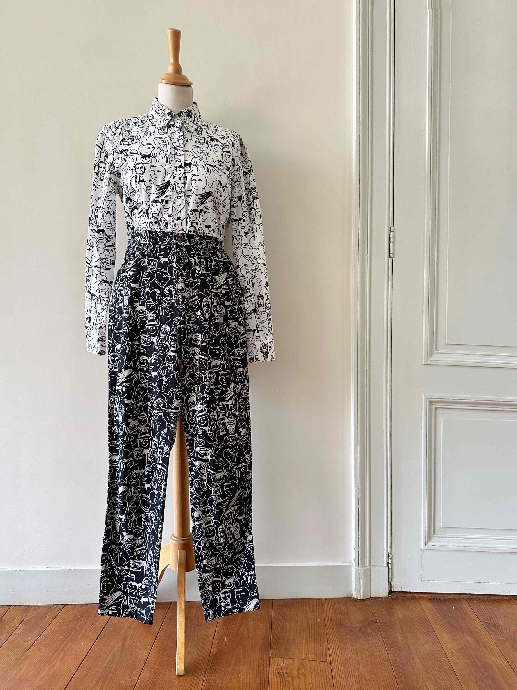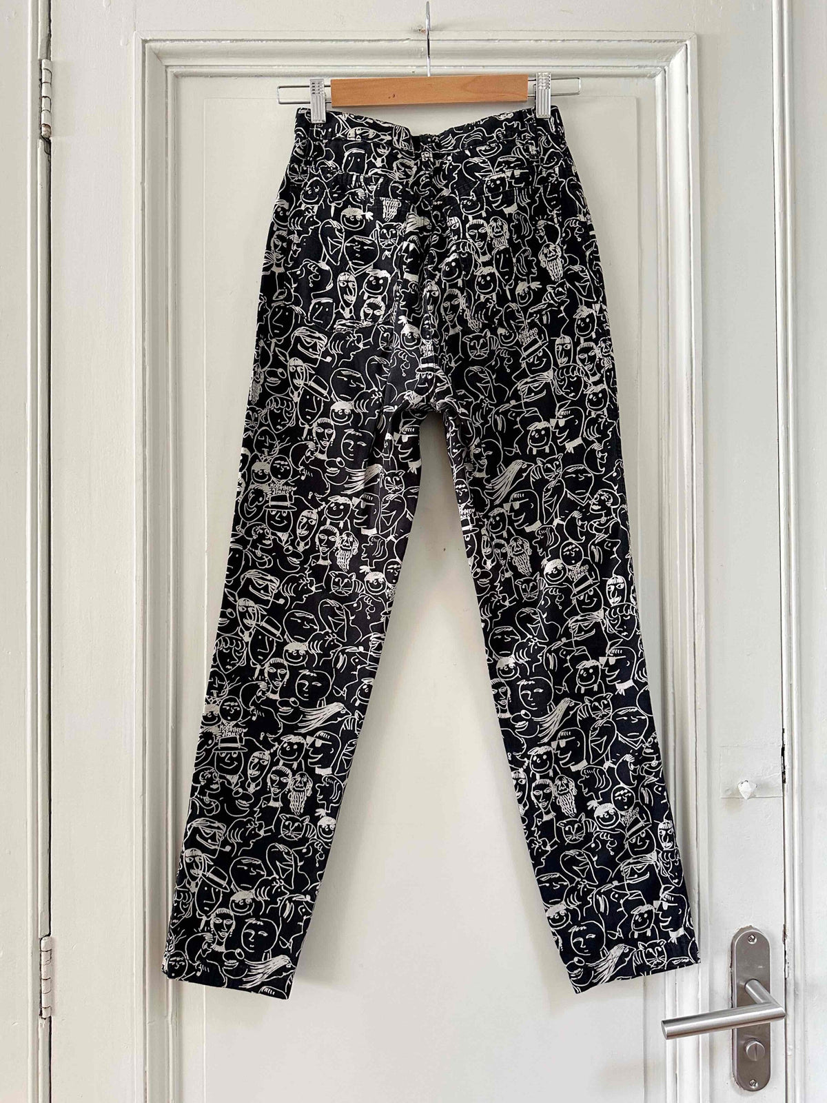 Prix unitaire parJeans Moschino, en coton denim noir imprimé motifs visages et personnages au trait blancs, taille haute, fabriquée en Italie, taille 42 i : tailles 36 portée ici sur un mannequin T36.
