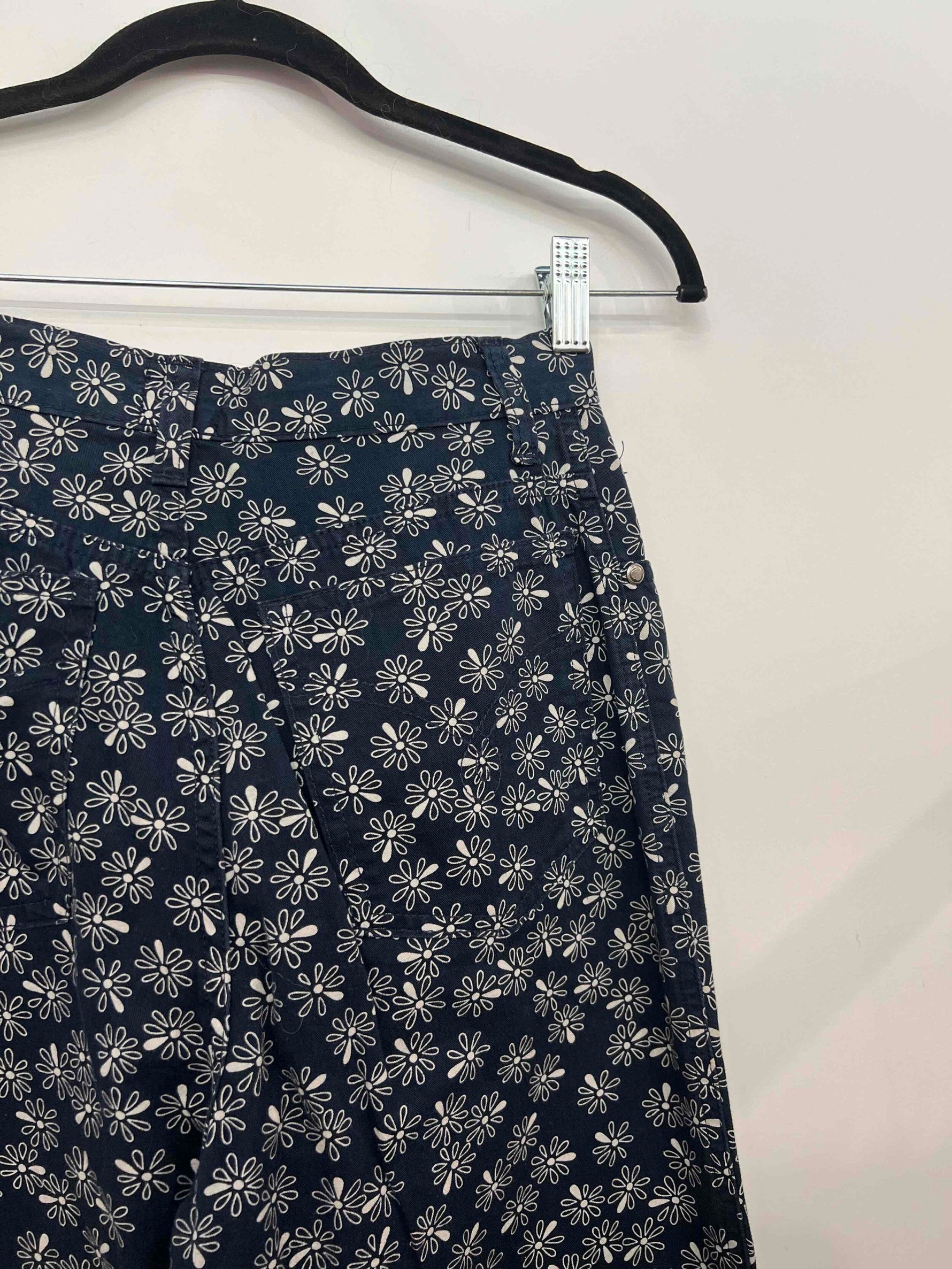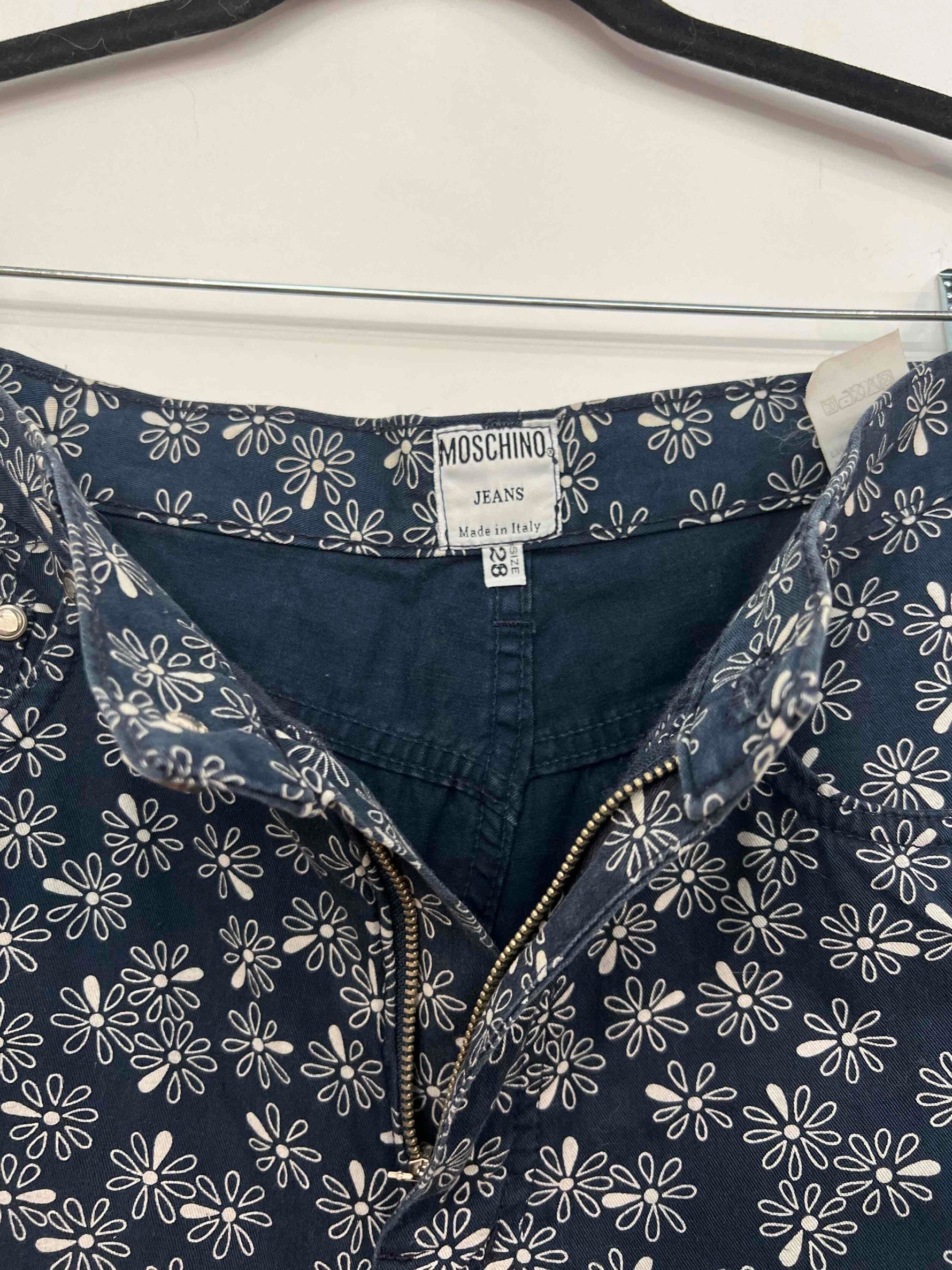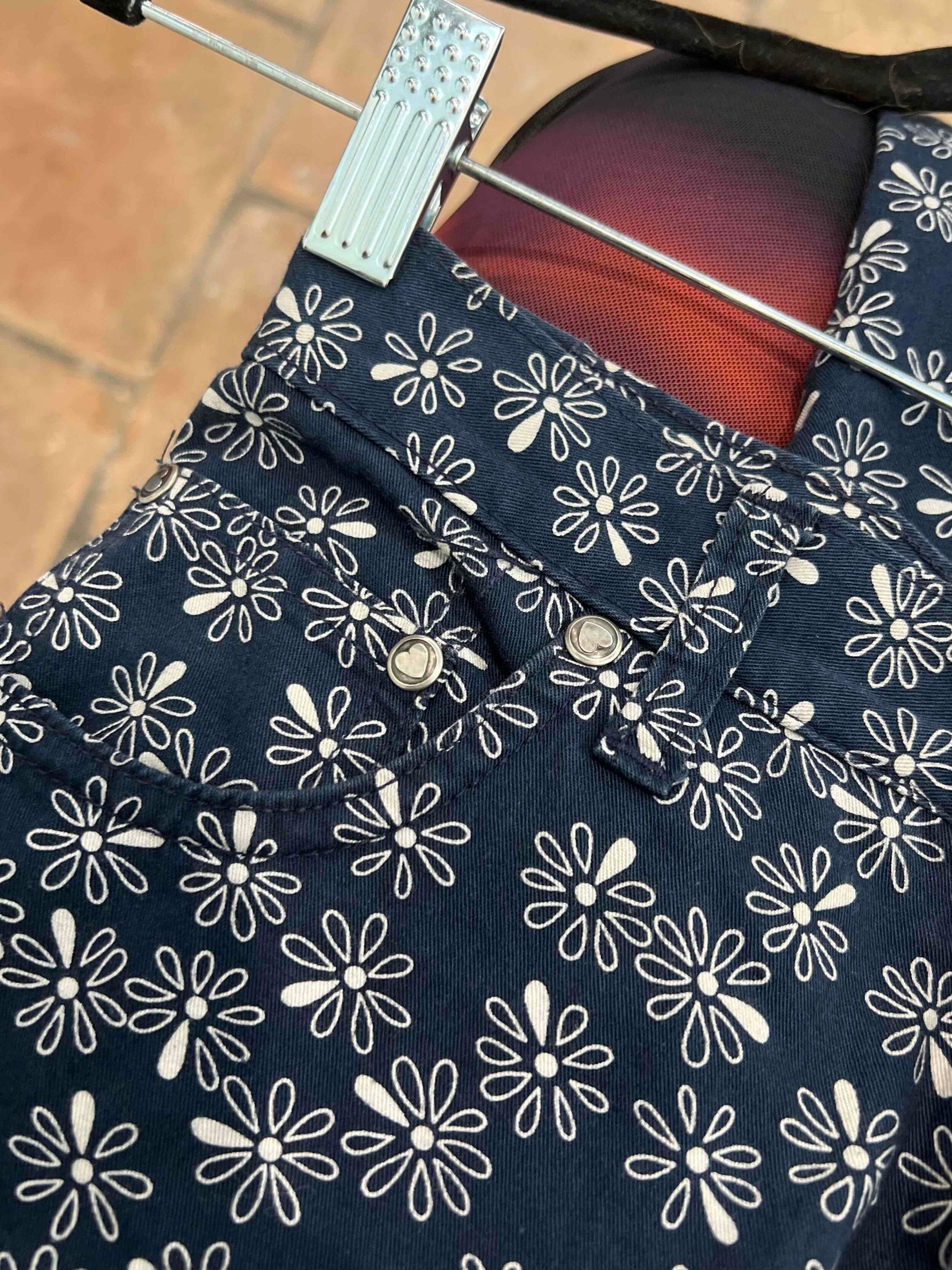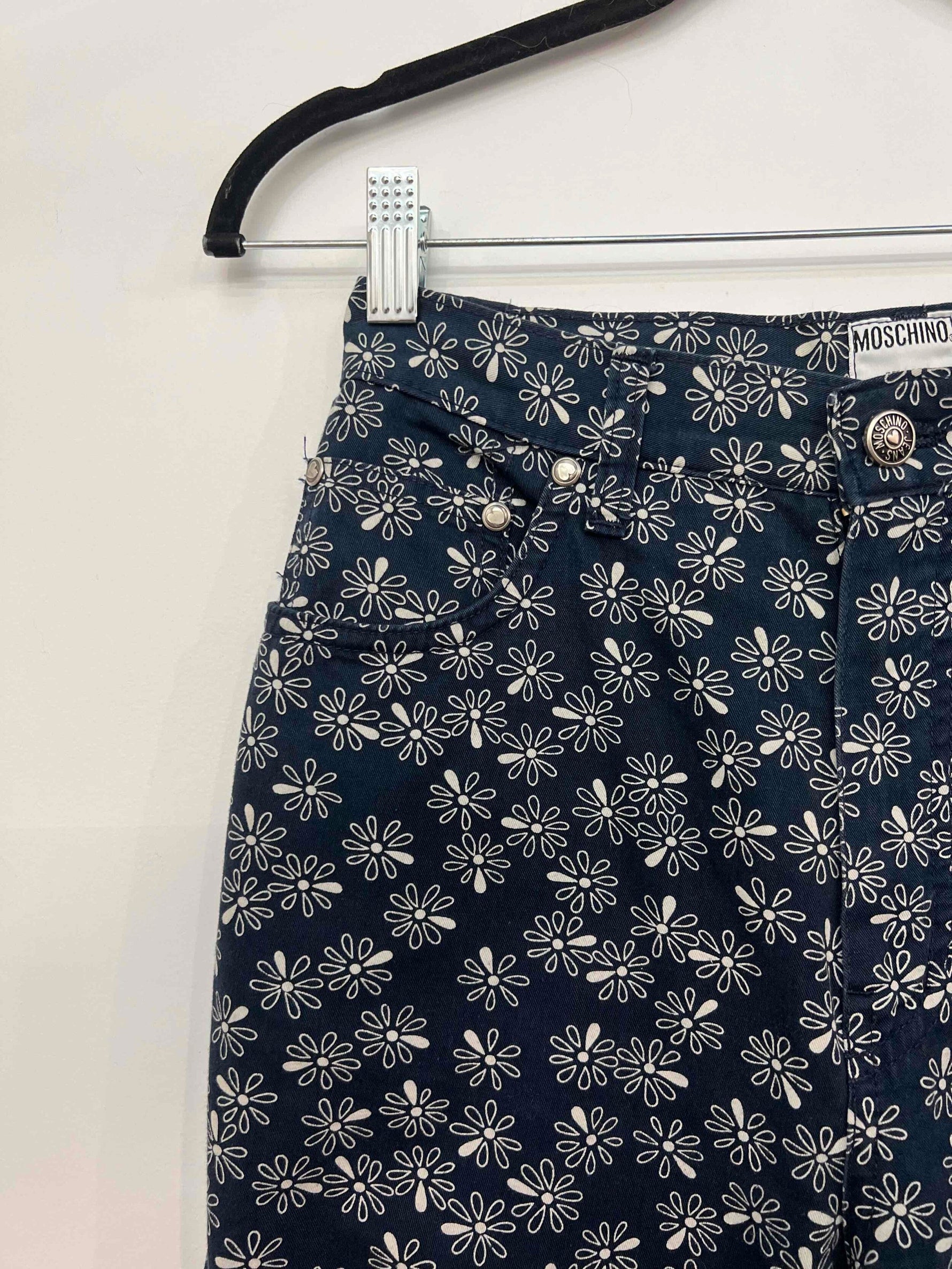 Prix unitaire parPantalon coupe jeans de la marque Moschino. Bleu marine à fleurs. Poches et surpiqûres. Taille 28 convient à un 36.