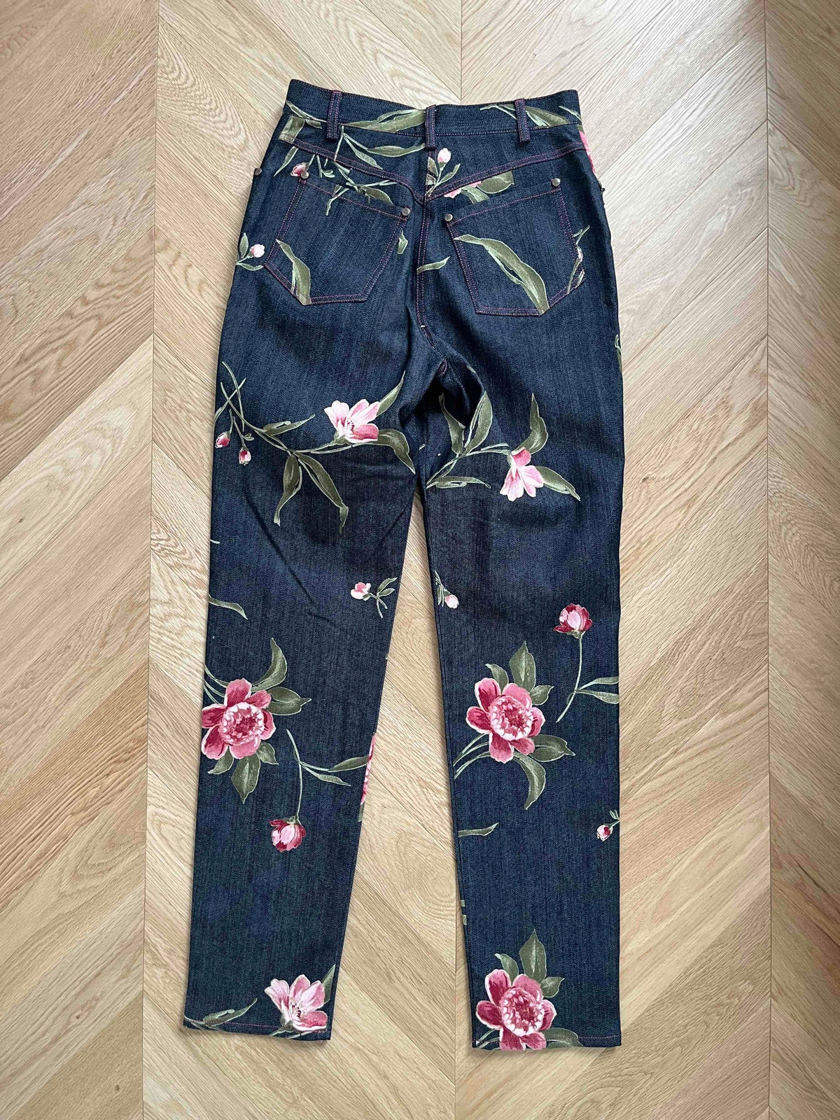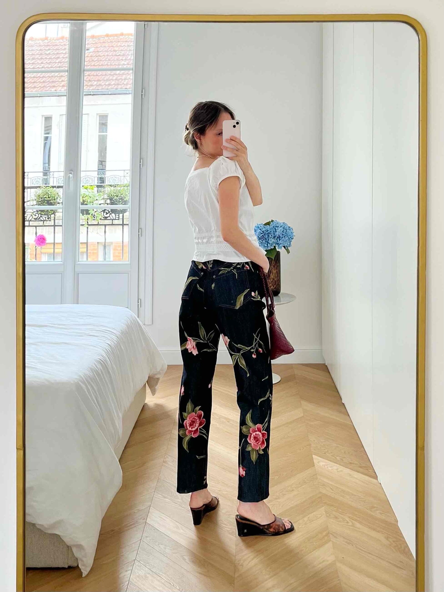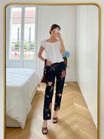 Prix unitaire parPantalon à fleurs, 76% de coton, taille haute, porté ici de façon légèrement oversize sur une T36 pour 1m64 (ourlet intérieur pour la photo car longueur de 109cm)