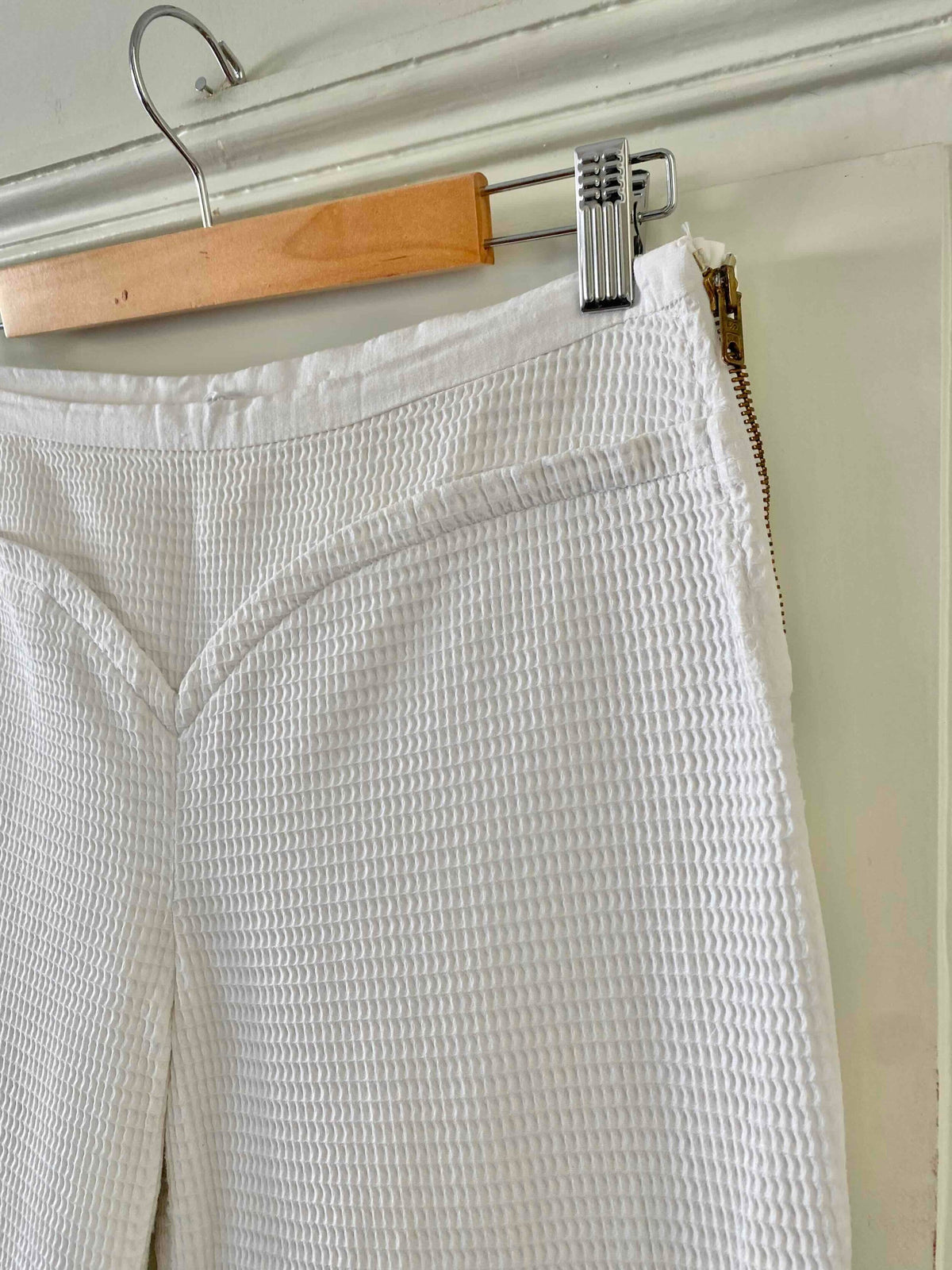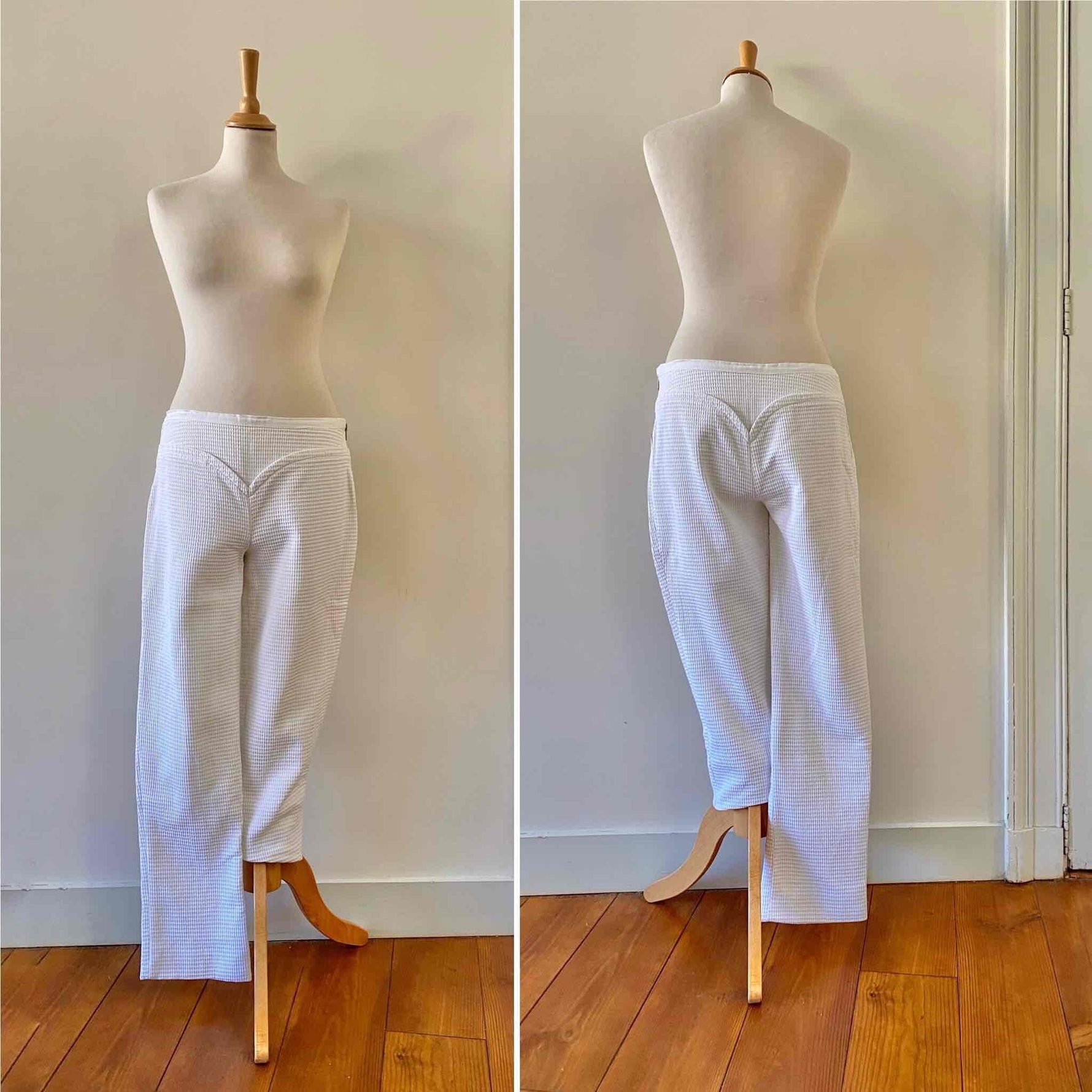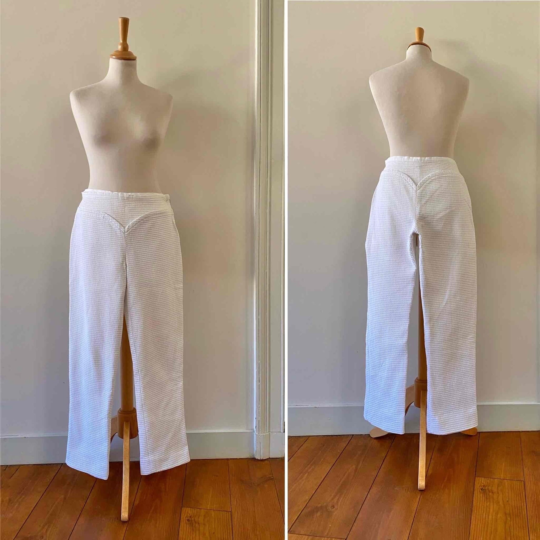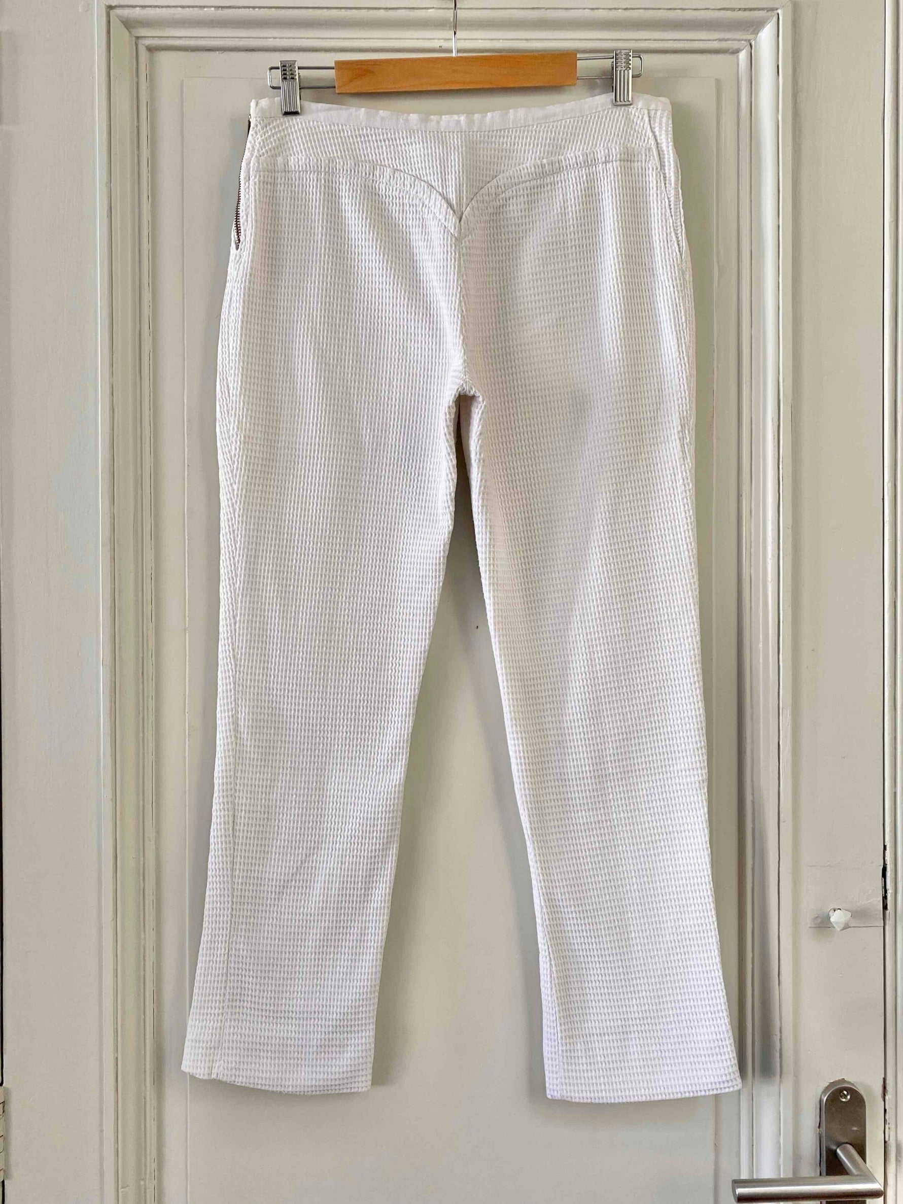 Pantalon Courrèges, en piqué de coton double blanc, détails de ceinture en forme coeur, fermeture éclaire côté, taille mi-haute, longueur 7/8 et mini flare, fabriqué en France, taille 38 porté ici sur un mannequin T36, taille 38cm