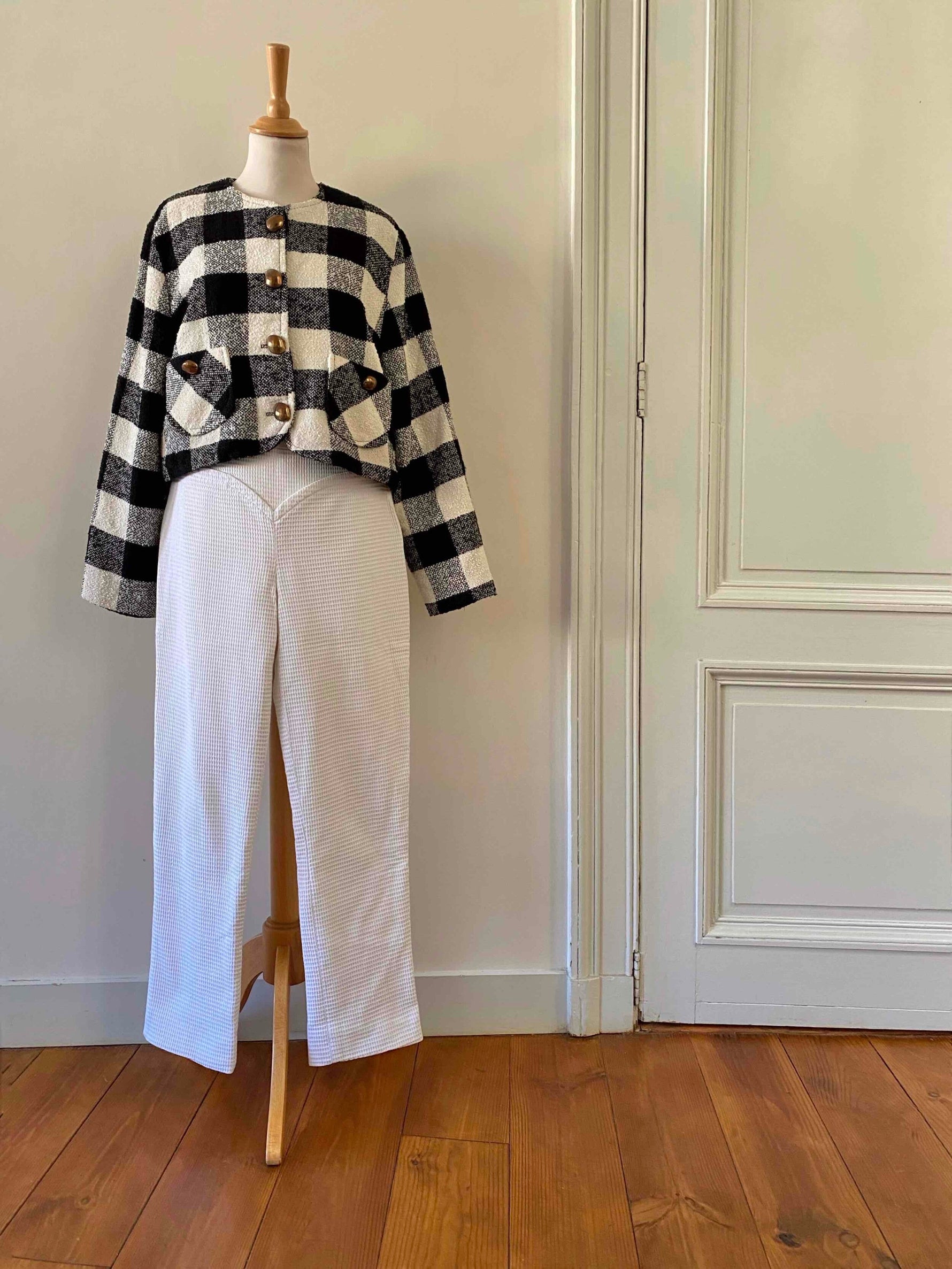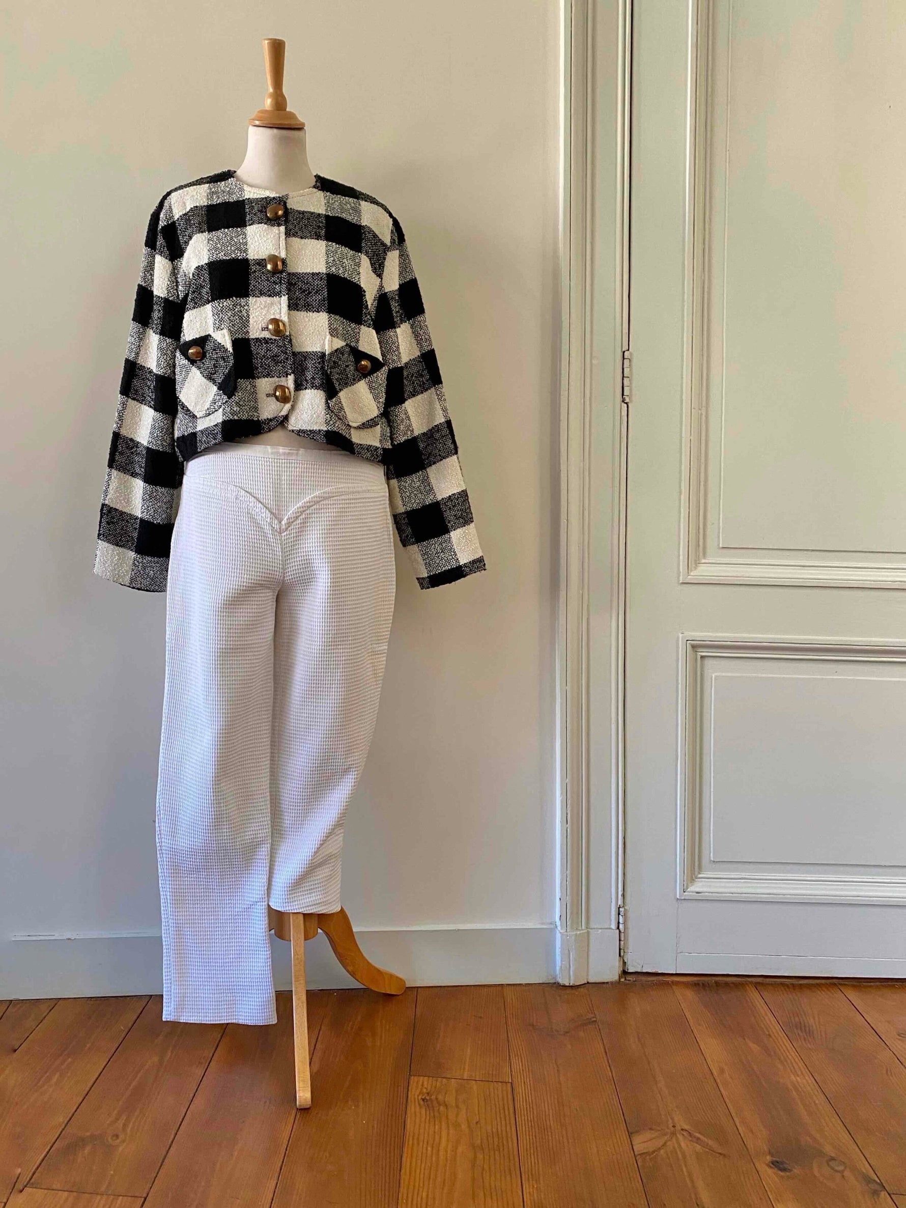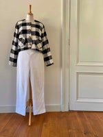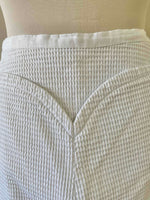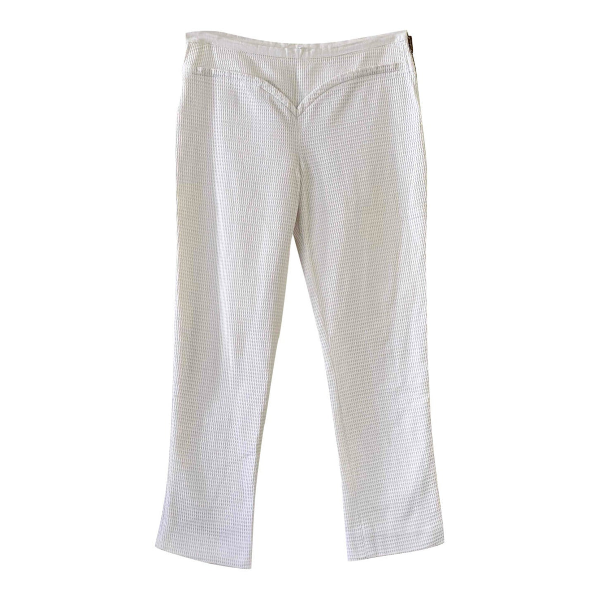 Pantalon Courrèges, en piqué de coton double blanc, détails de ceinture en forme coeur, fermeture éclaire côté, taille mi-haute, longueur 7/8 et mini flare, fabriqué en France, taille 38 porté ici sur un mannequin T36, taille 38cm
