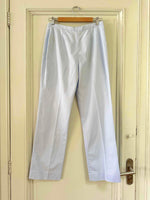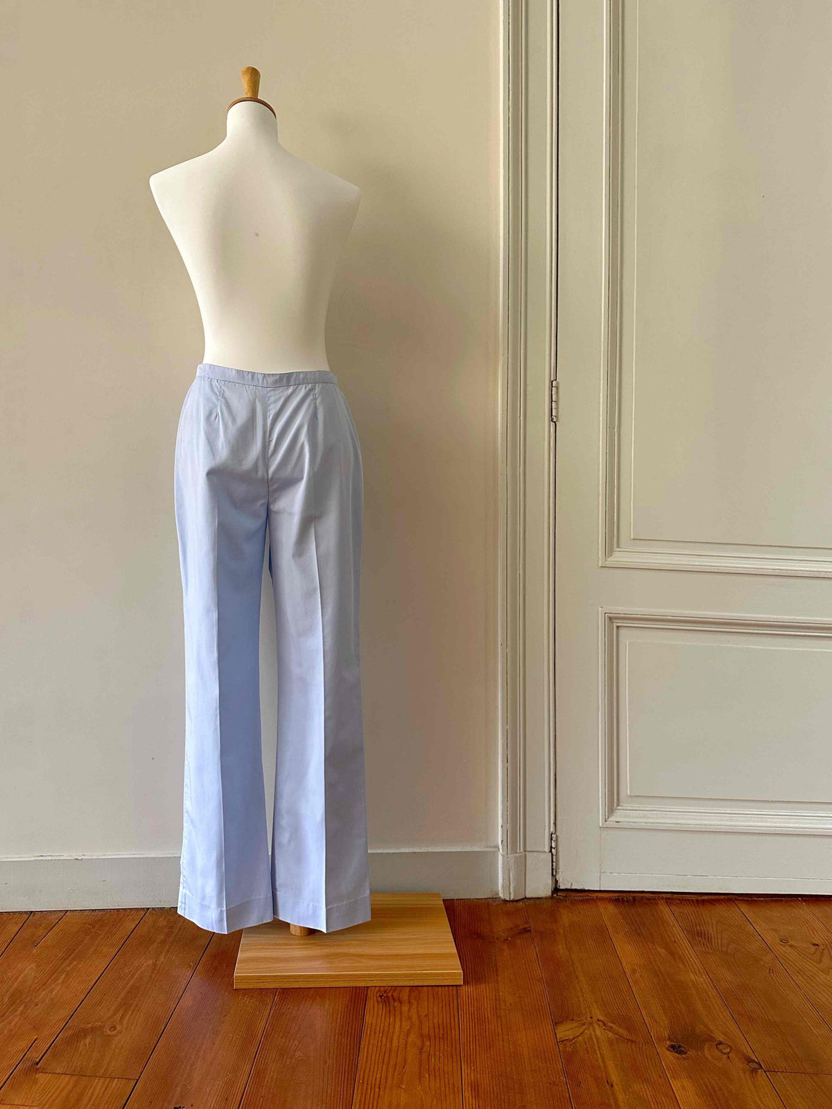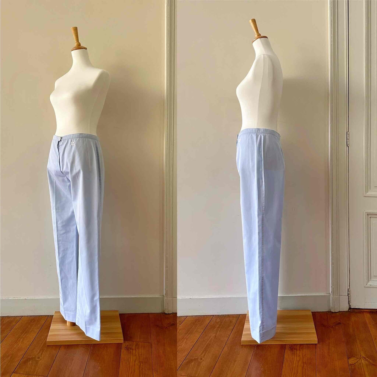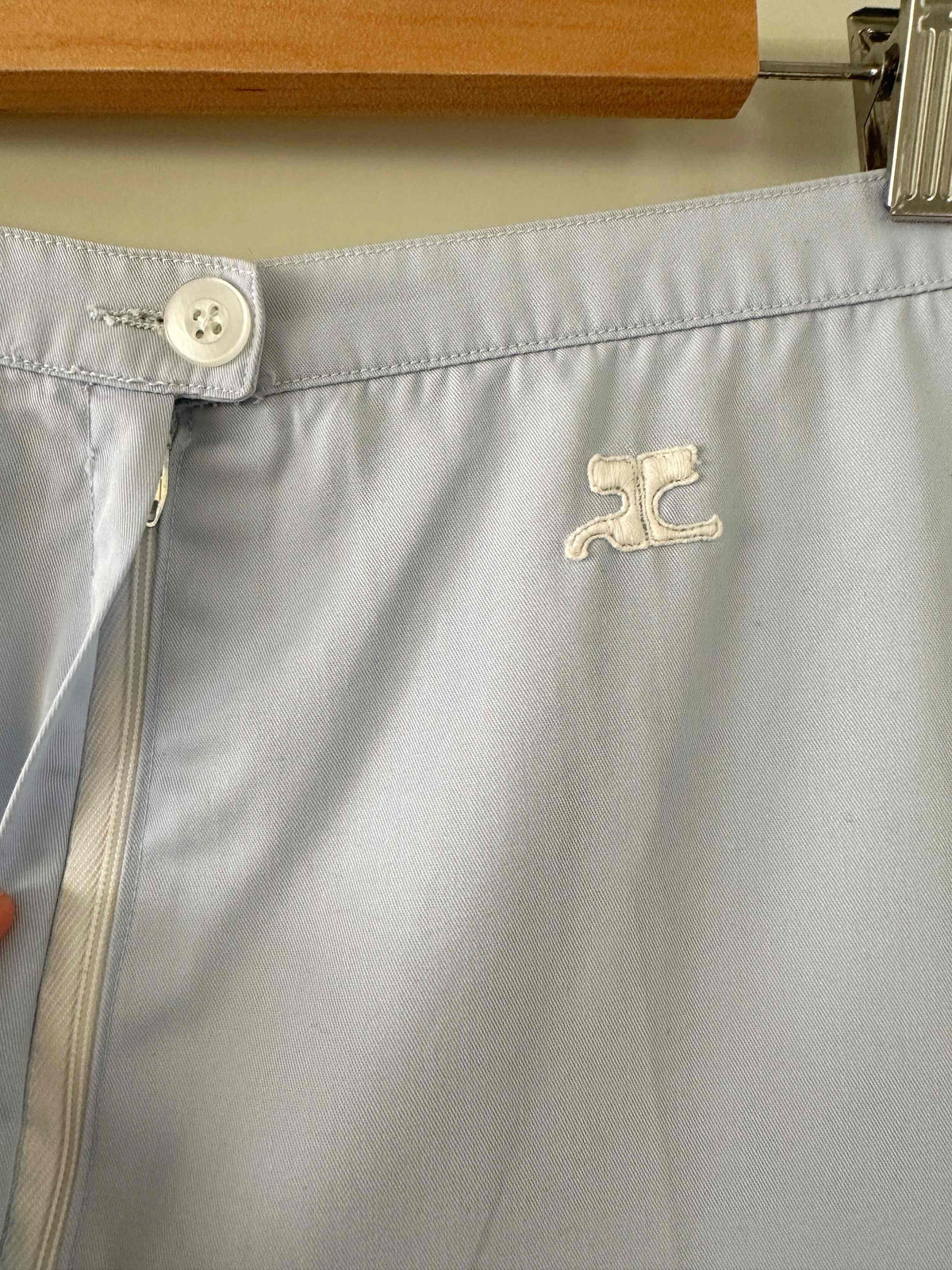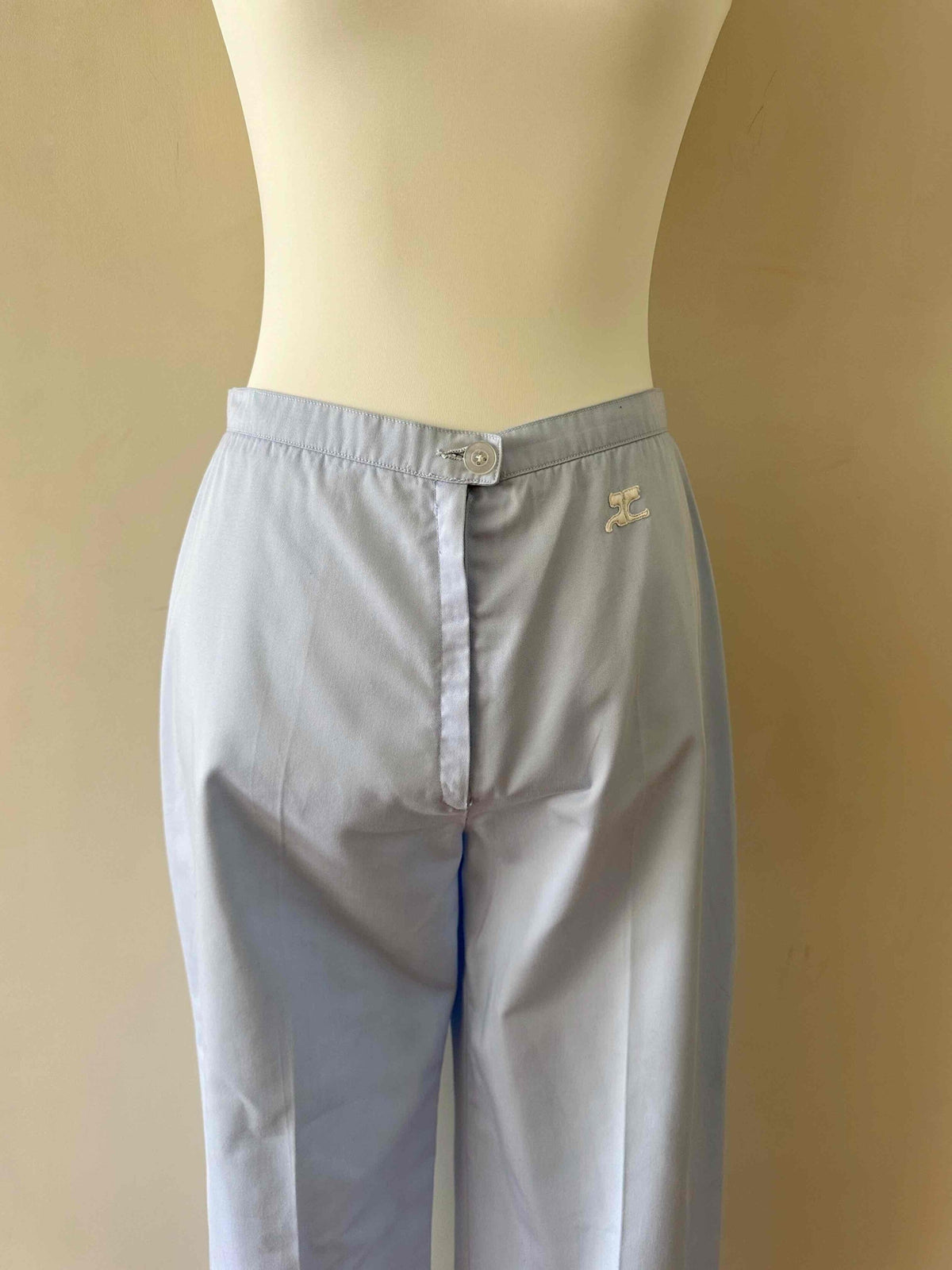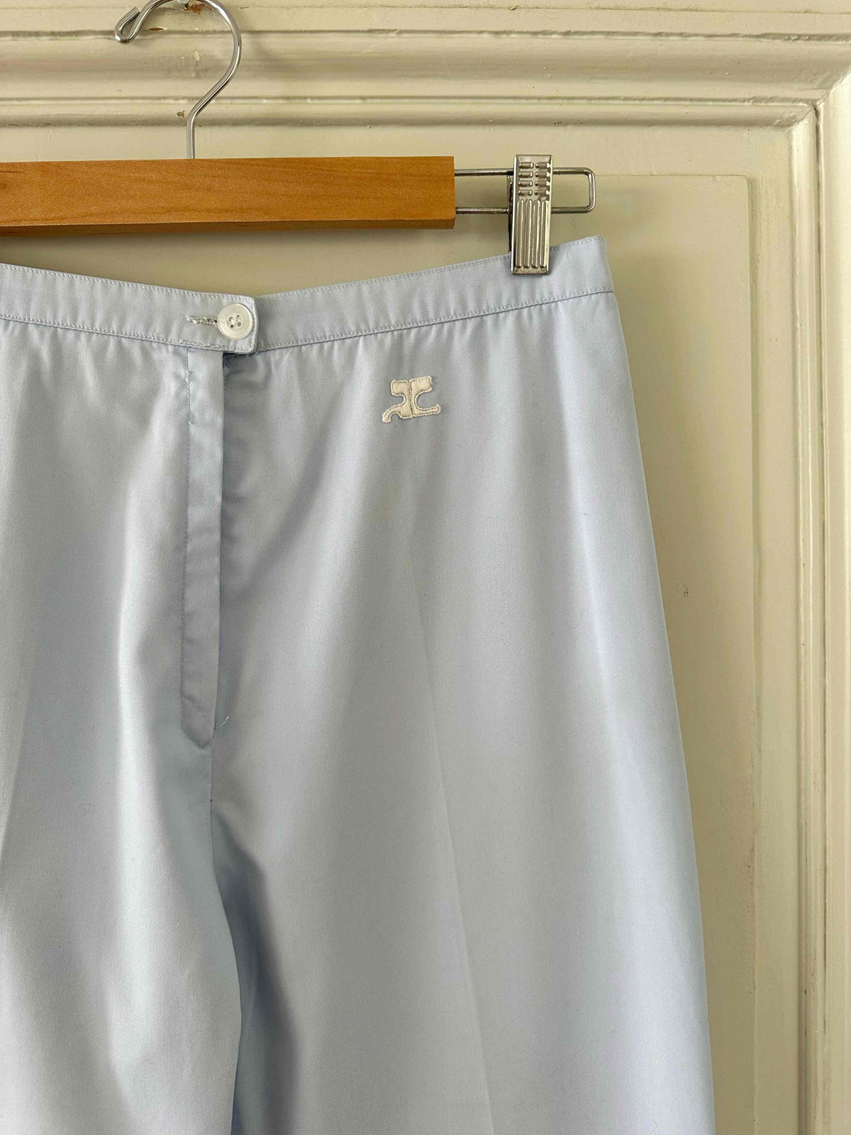 Prix unitaire parPantalon Courrèges, en toile de coton fin bleu ciel, logo brodé blanc à la taille, taille haute, jambes légèrement évasées, fabriqué en France, taille 38 porté ici sur un mannequin T36.