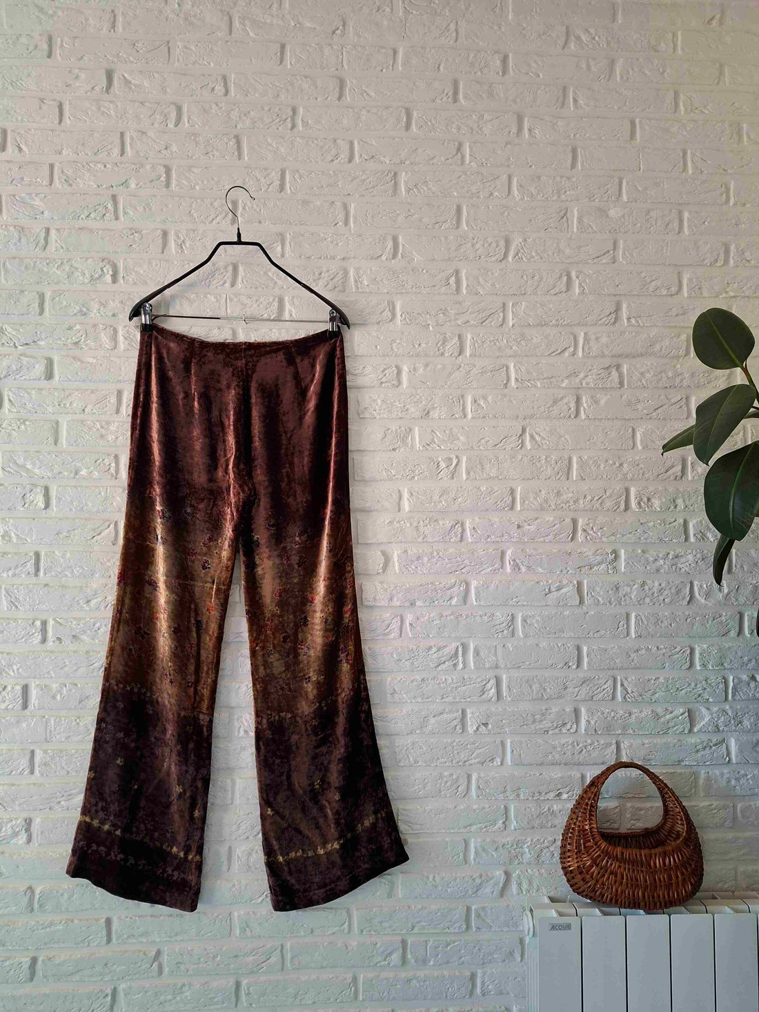 Prix unitaire parPantalon flare en soie vintage 70’s. En velours de soie et rayonne à petites fleurs. Taille mi haute zippée devant avec liens à nouer pour ajuster celle-ci. Velours marron mordoré avec petites fleurs roses et bleues sur fond vert en dégradé. Le mannequin fait une taille 40.Taille 39cm. Longueur 103cm Entrejambe 77cm.Taille 38/40.