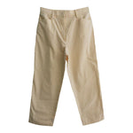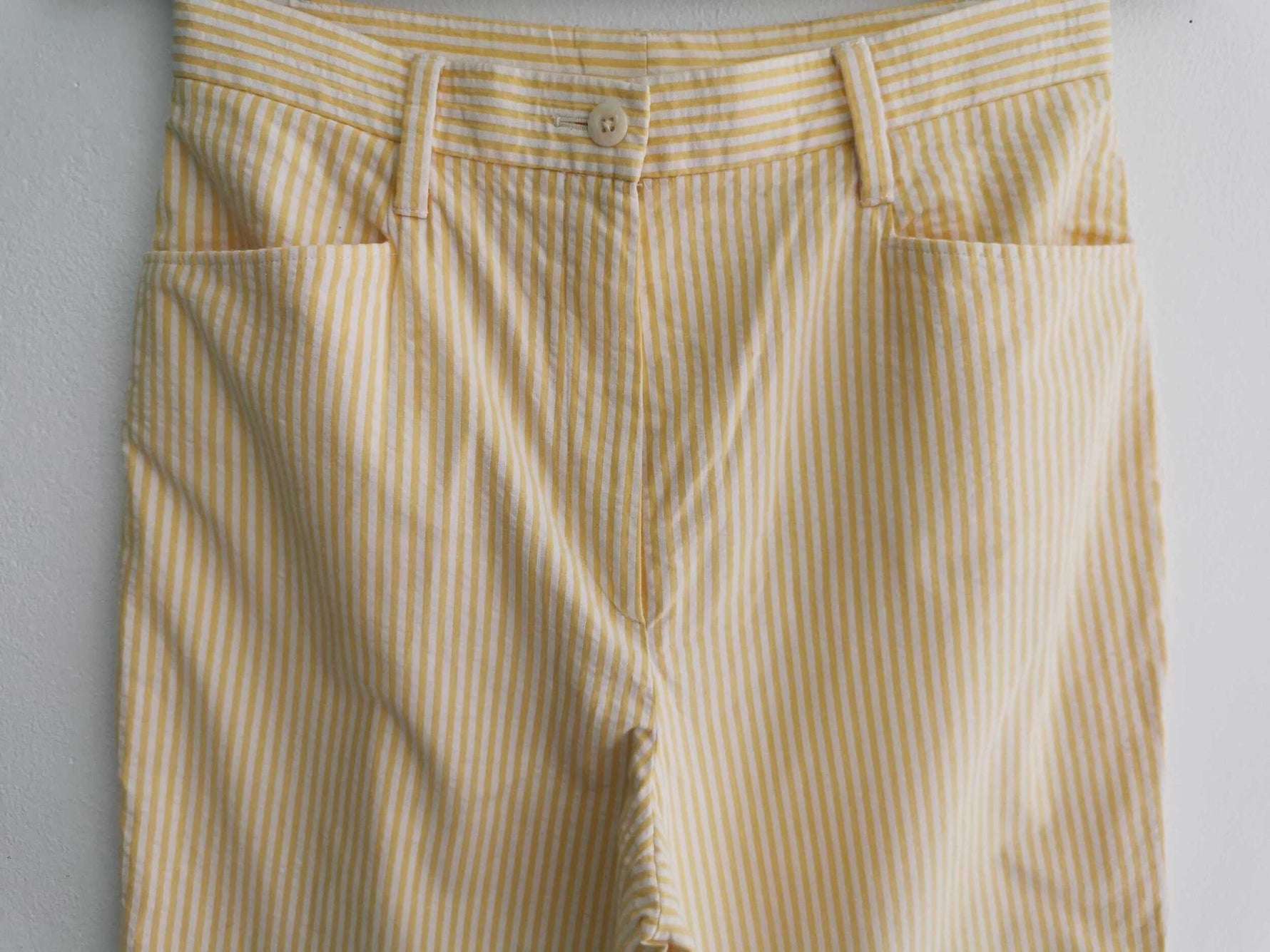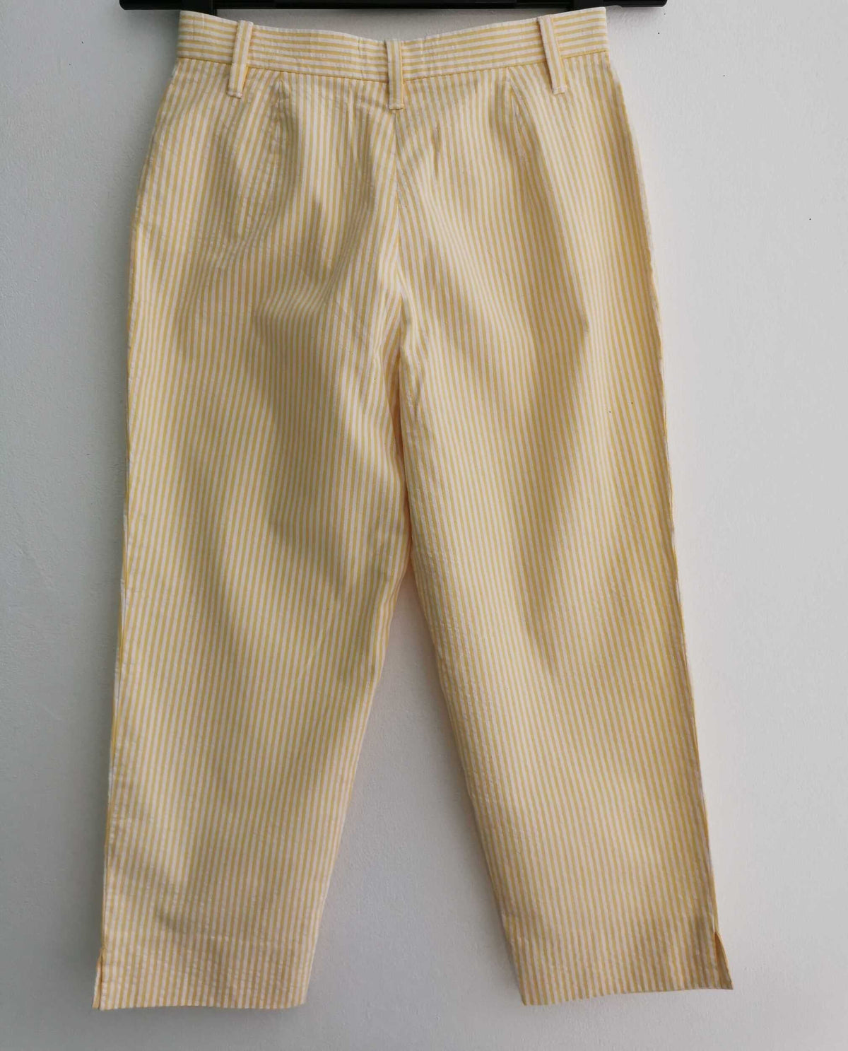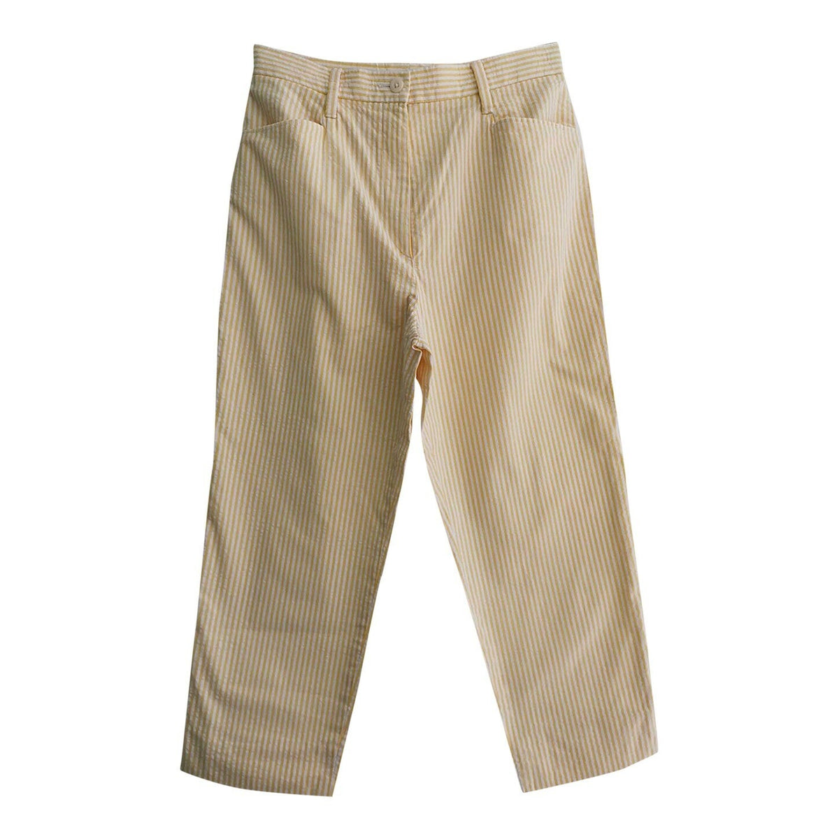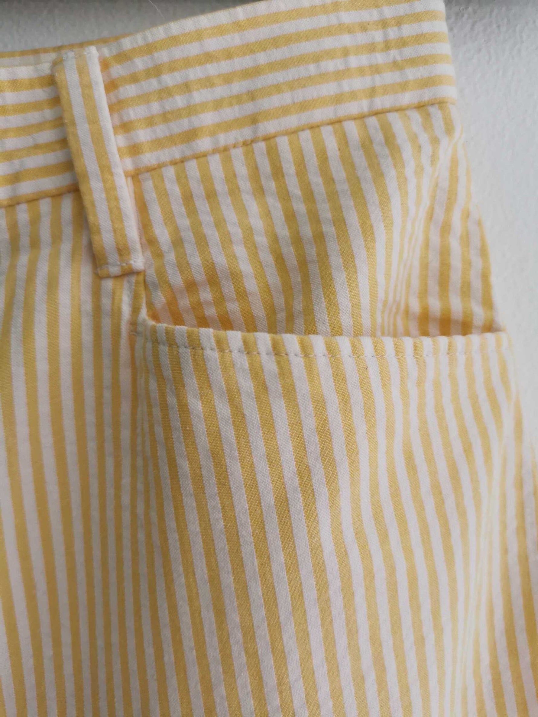 Prix unitaire parPantalon à rayures Made in France, en coton 85% rayé blanc et jaune pastel, 2 poches, à taille haute et longueur 7/8 ème. Fermeture éclair.