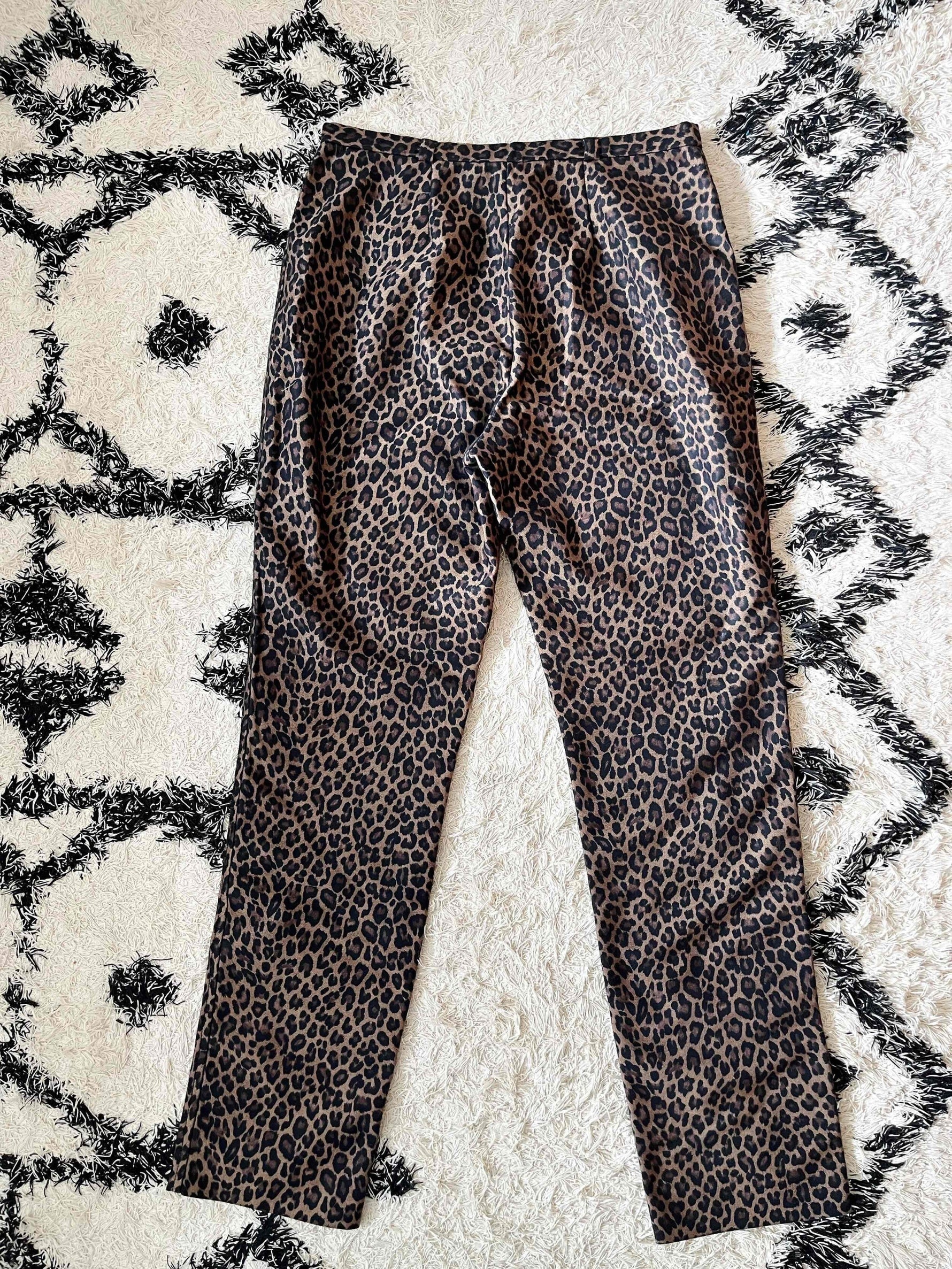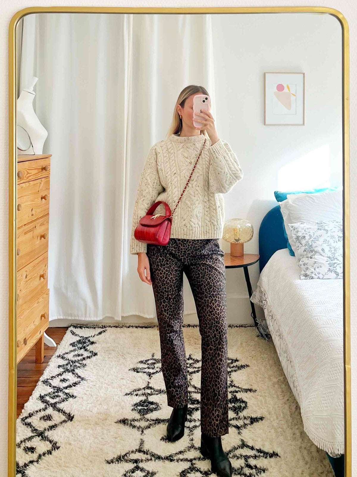 Pantalon léopard, taille haute, coupe droite, porté ici par une T36 pour 1m64