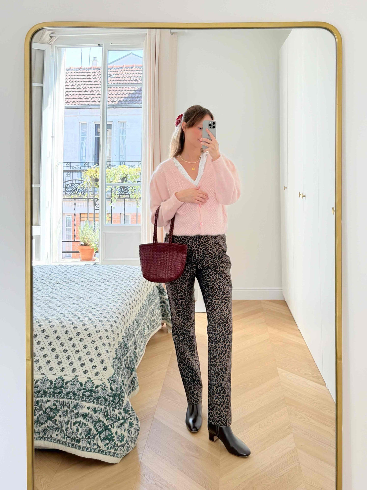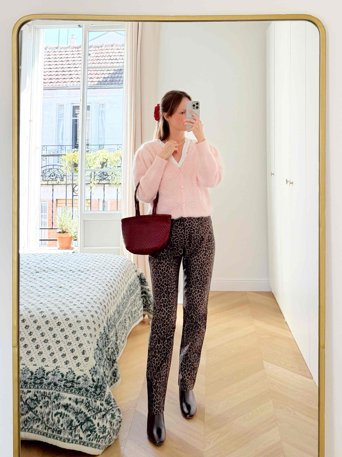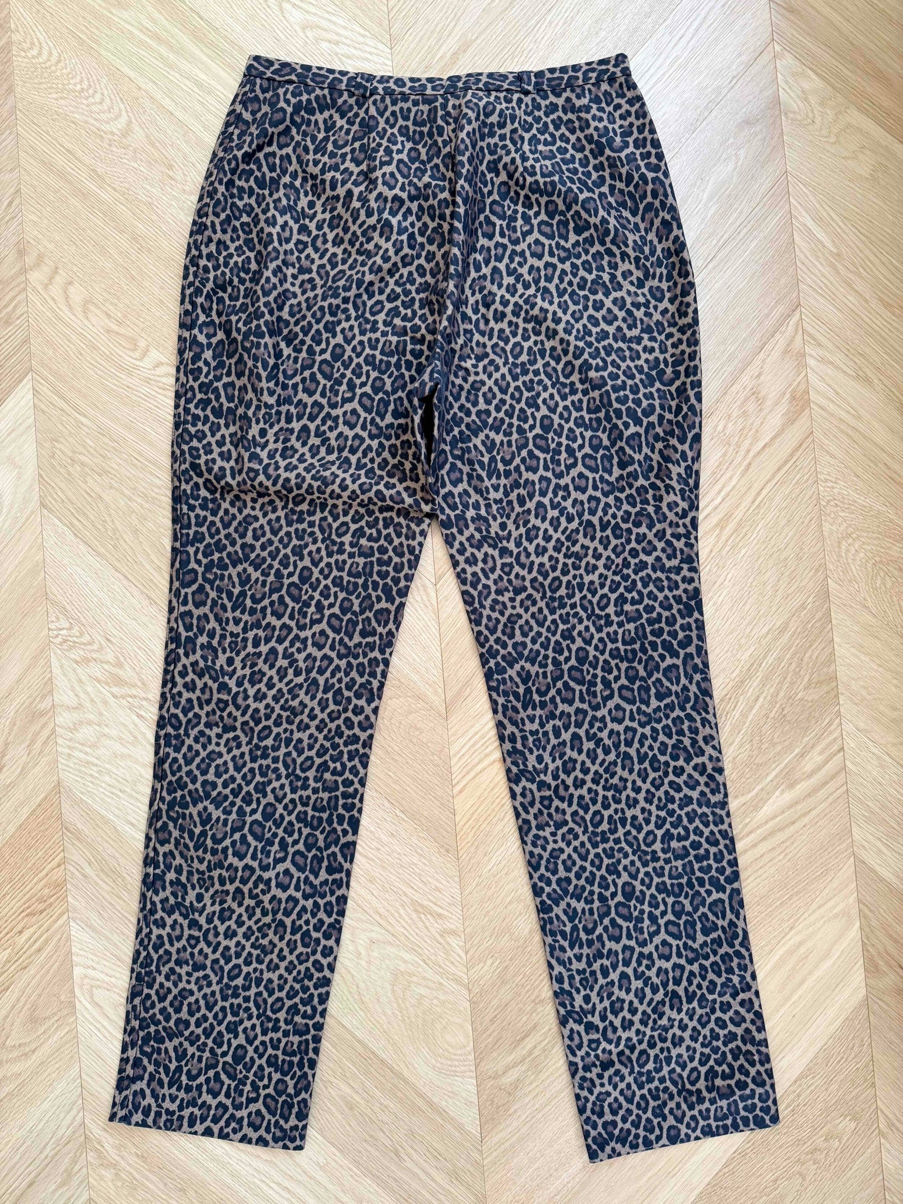 Prix unitaire parPantalon léopard, taille haute, coupe droite, petit bouton et fermeture éclair sur le devant, tissu non stretch, porté ici par une T36 pour 1m64