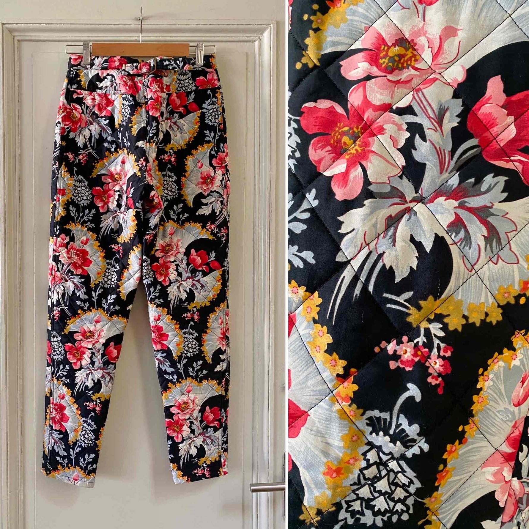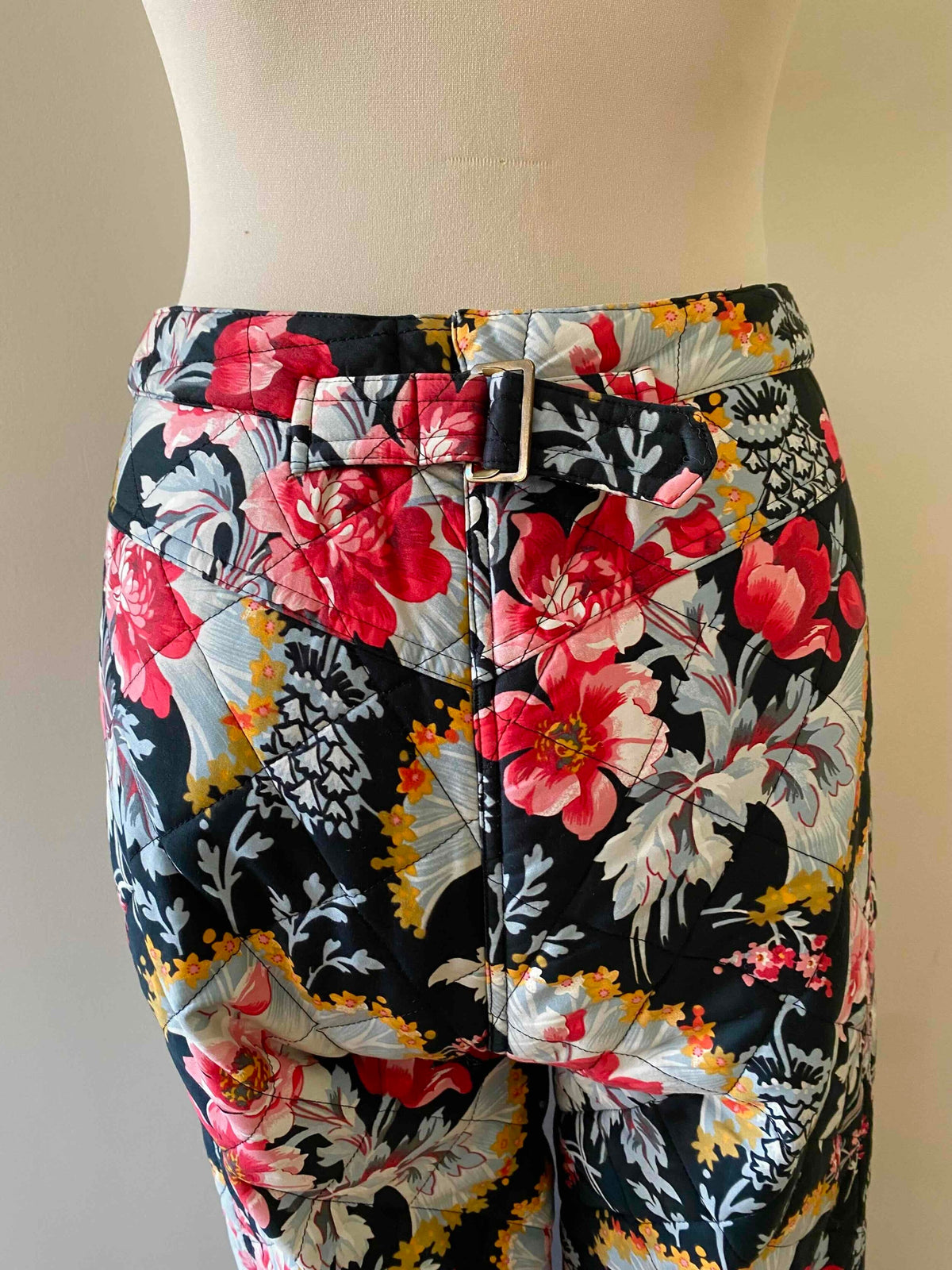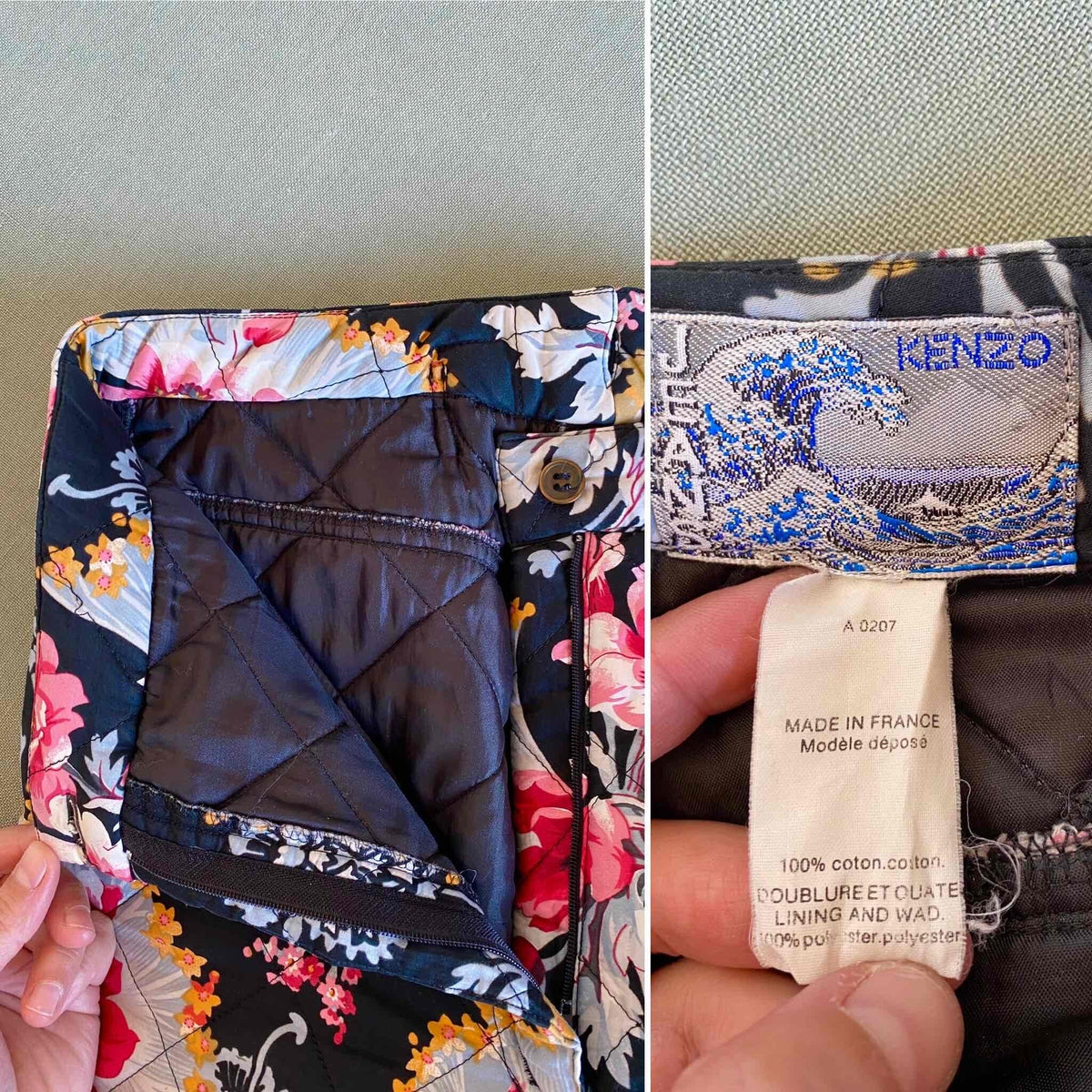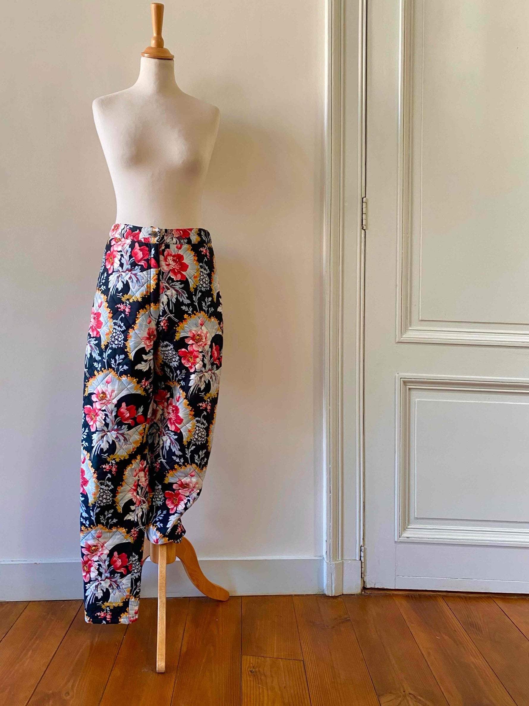 Pantalon matelassé Kenzo, en 100% coton imprimé fleurs japonisantes, matelassé ouatiné croisillons, taille haut, sangle dos à boucle de serrage, fabriqué en France, taille 36 porté ici sur un mannequin T36, taille 34cm, hanches 45cm, hauteur entrejambe 28cm, jambe extérieure 100cm, jambe intérieure 73cm. Pièce rare des années 90’s.