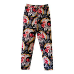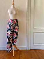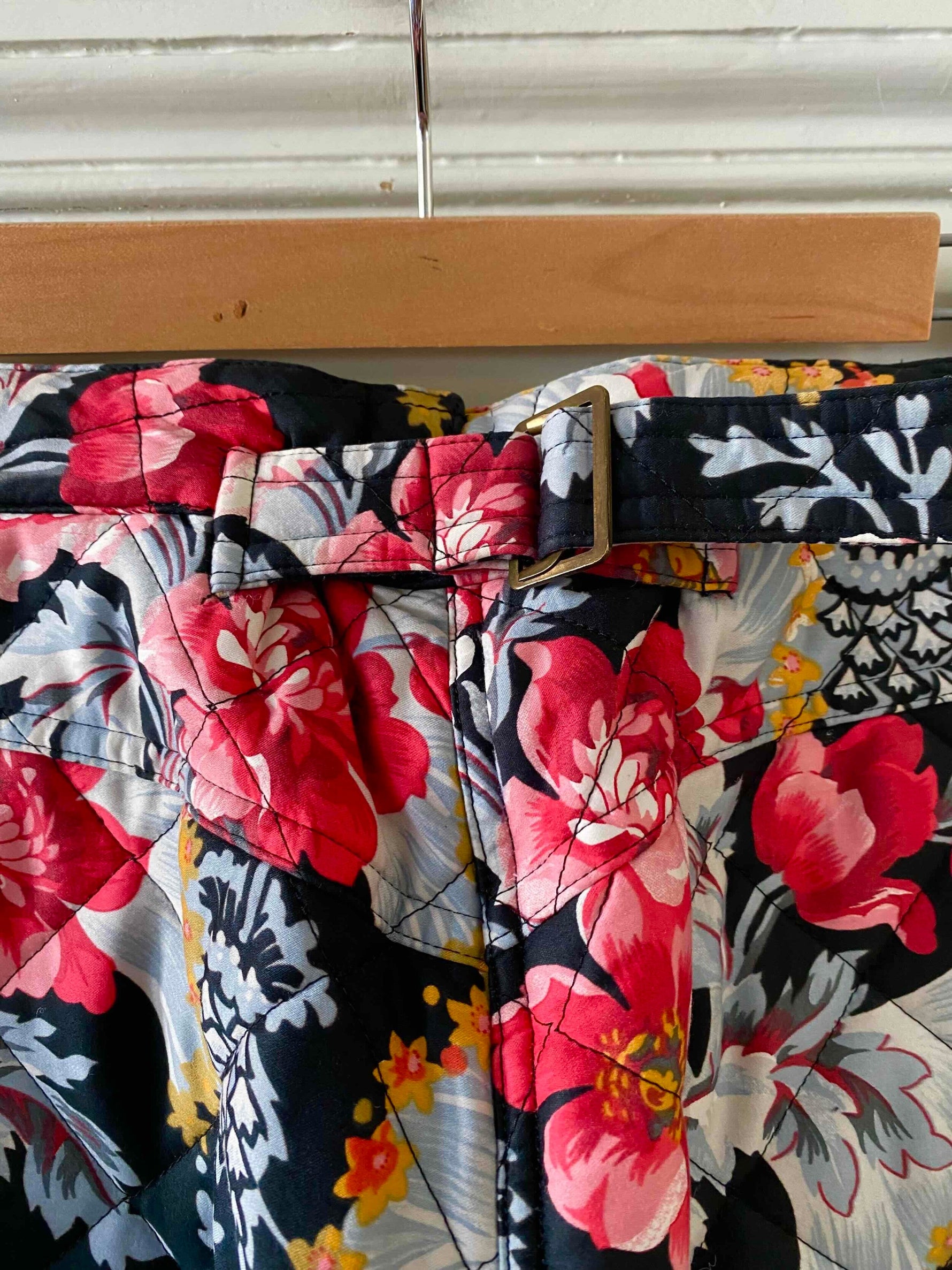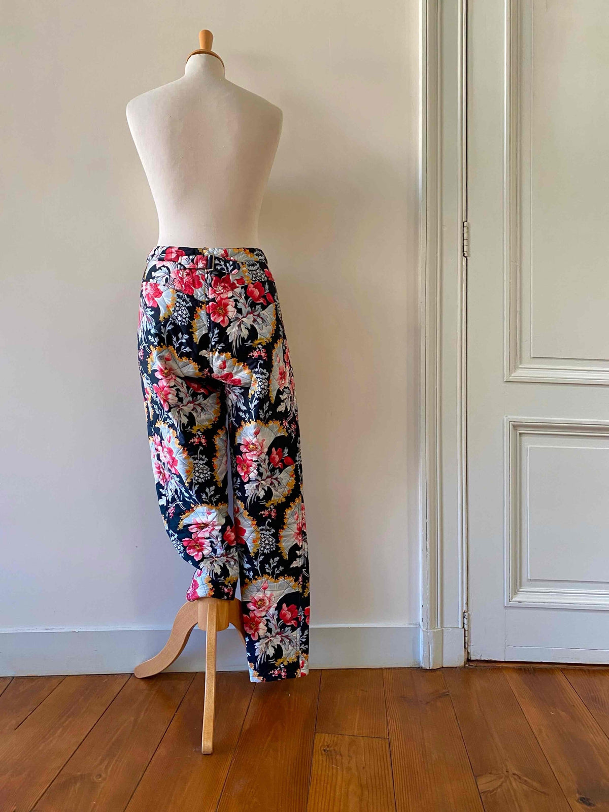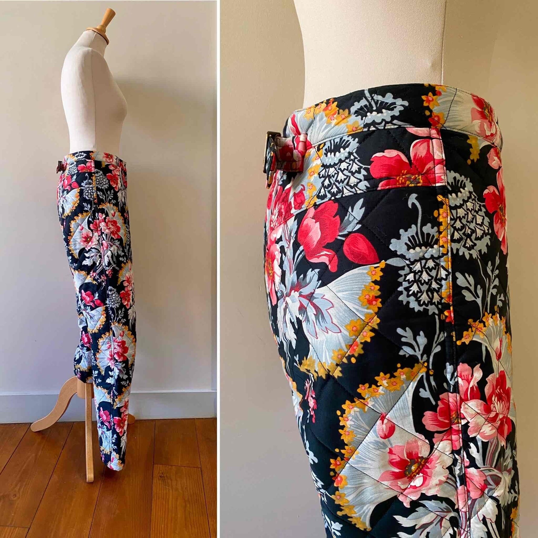 Pantalon matelassé Kenzo, en 100% coton imprimé fleurs japonisantes, matelassé ouatiné croisillons, taille haut, sangle dos à boucle de serrage, fabriqué en France, taille 36 porté ici sur un mannequin T36, taille 34cm, hanches 45cm, hauteur entrejambe 28cm, jambe extérieure 100cm, jambe intérieure 73cm. Pièce rare des années 90’s.