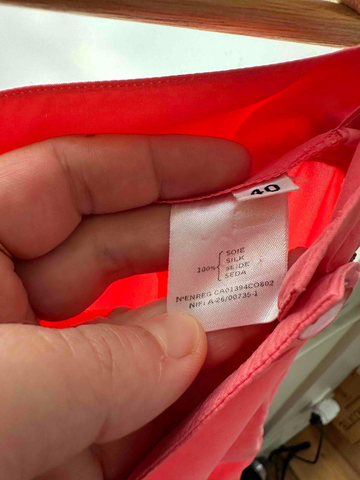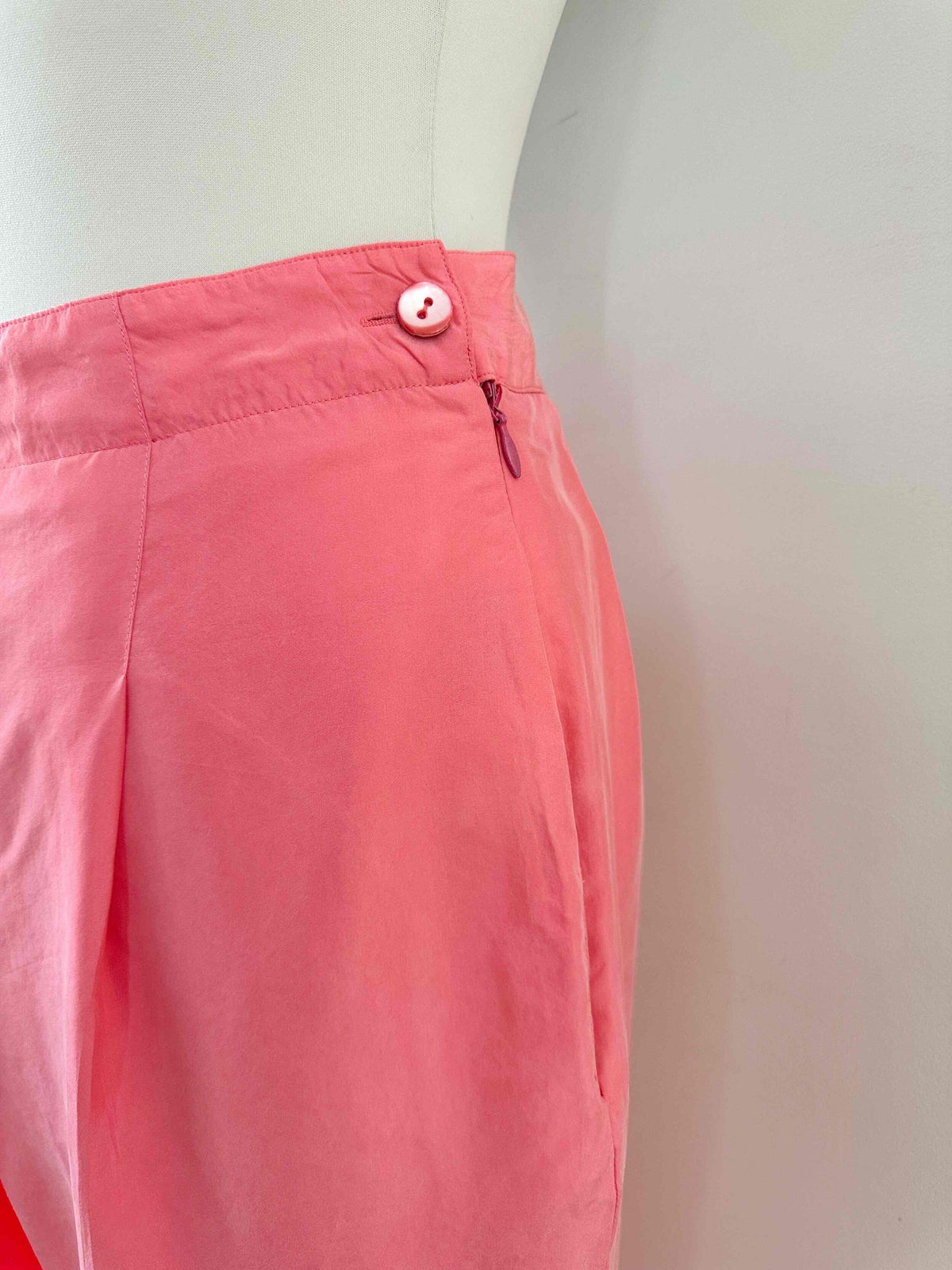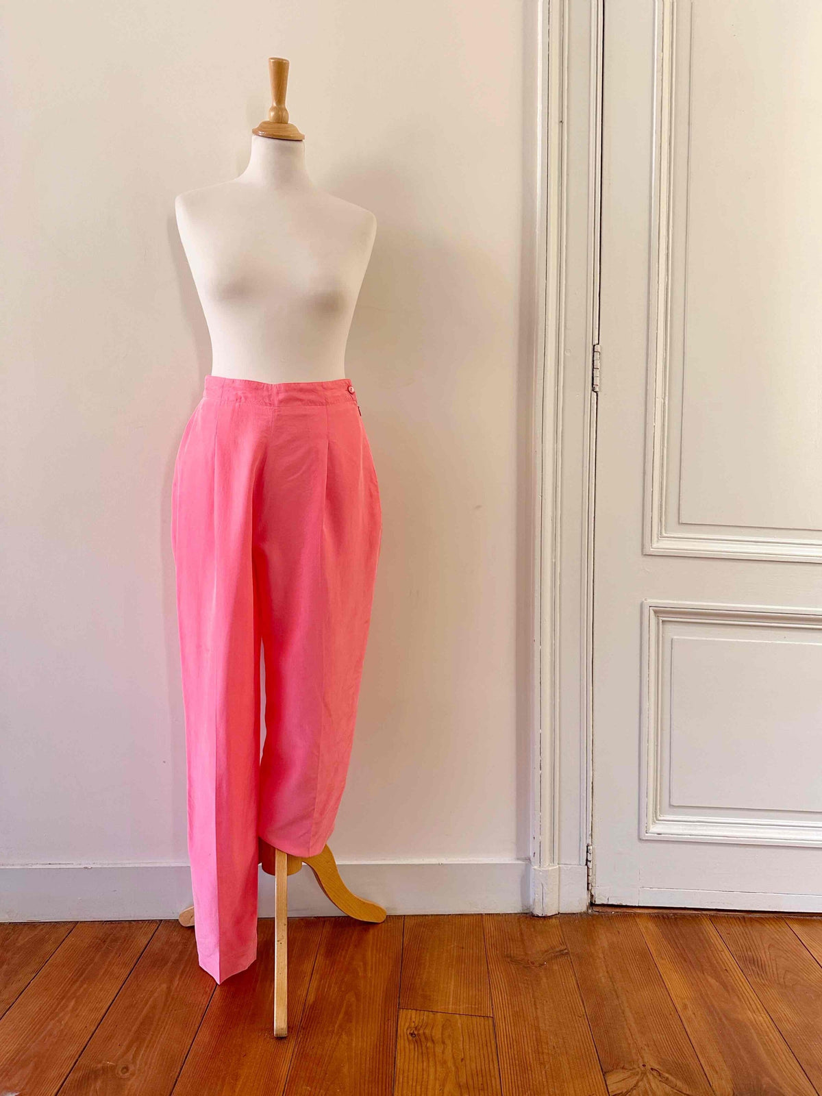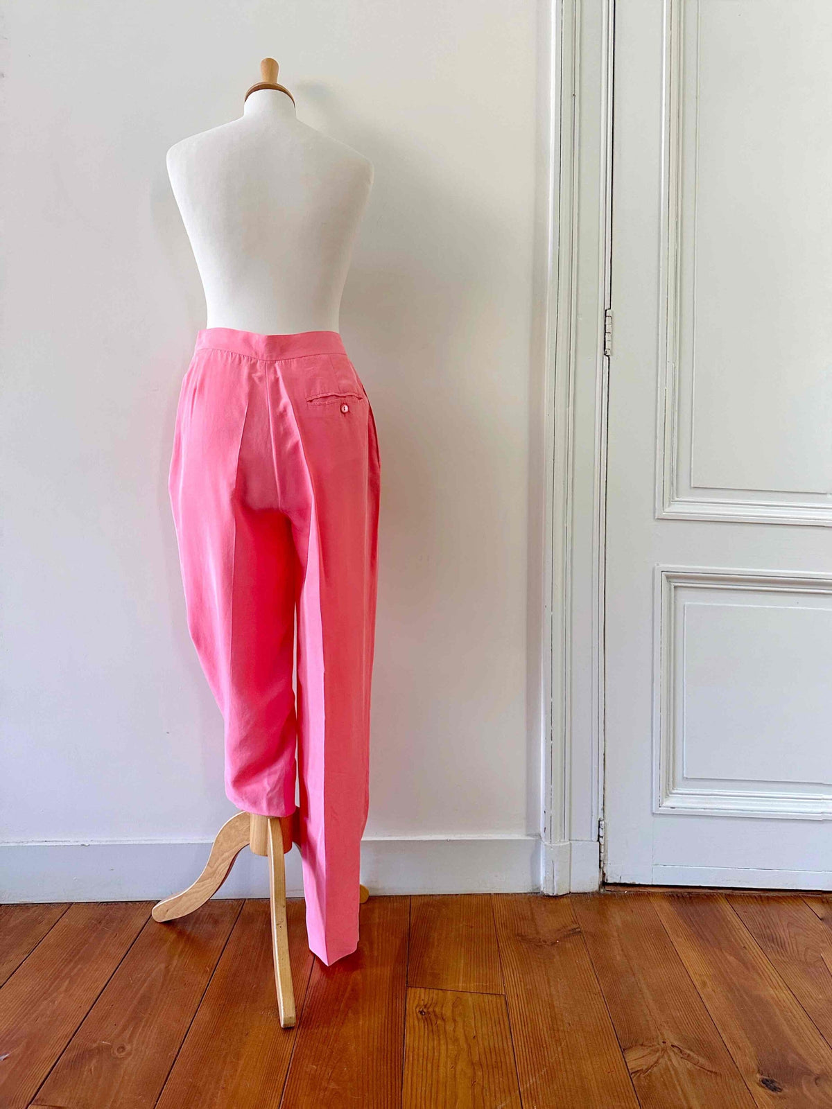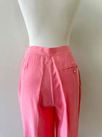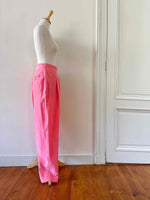 Pantalon en soie Rodier, en 100% soie rose bonbon, taille haute et plate, fermeture éclair et bouton côté, forme à pinces carrott, taille 36 porté ici sur un mannequin T36, mesures : taille 35cm, hanches 48cm, longueur jambe extérieure 105cm, longueur jambe intérieure 75cm.