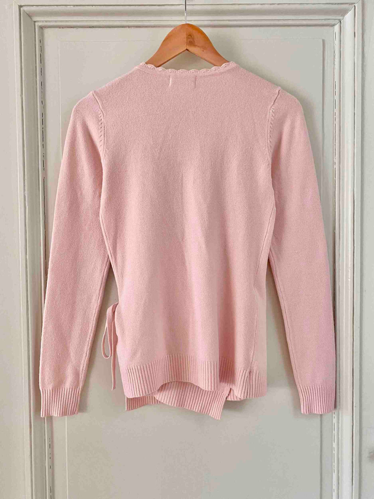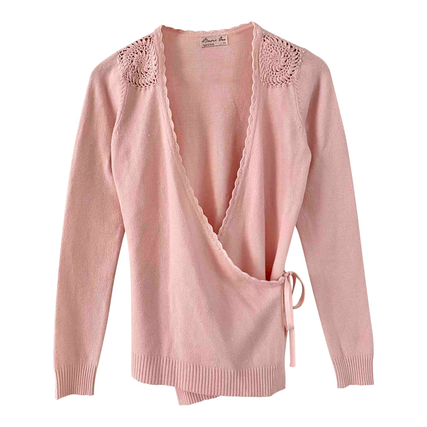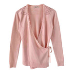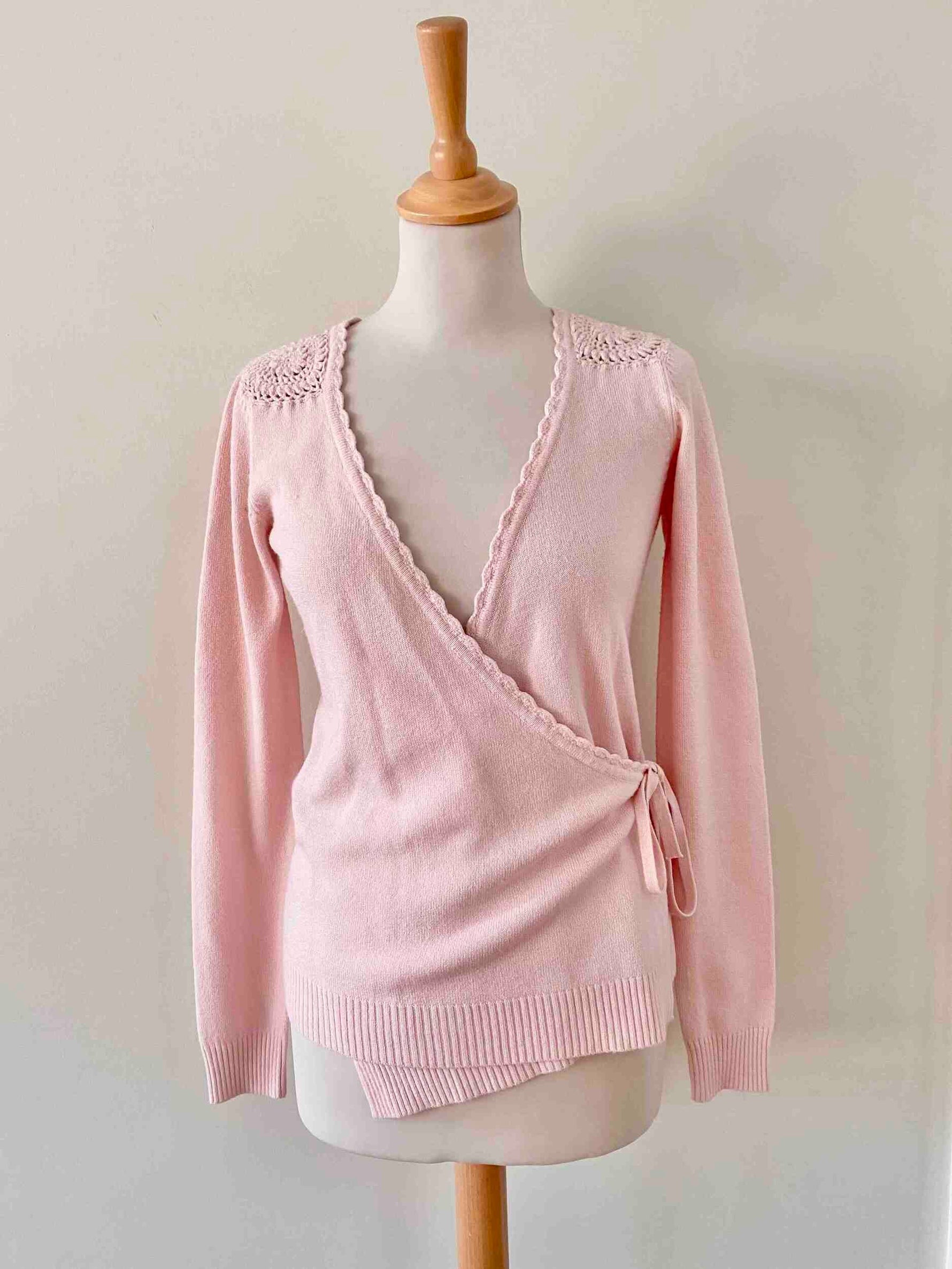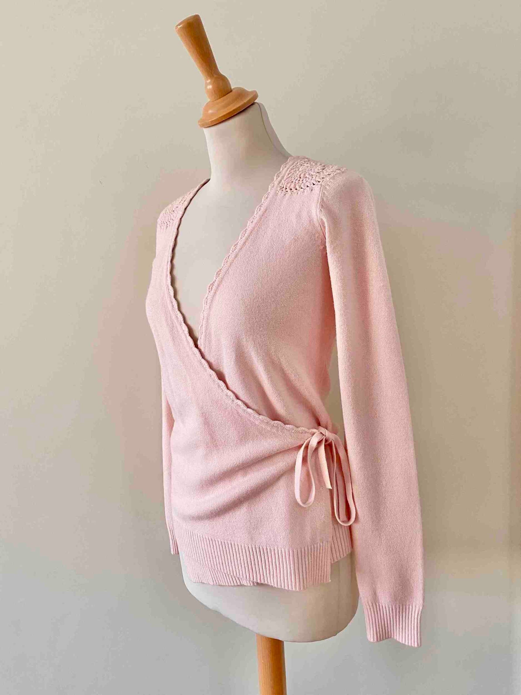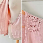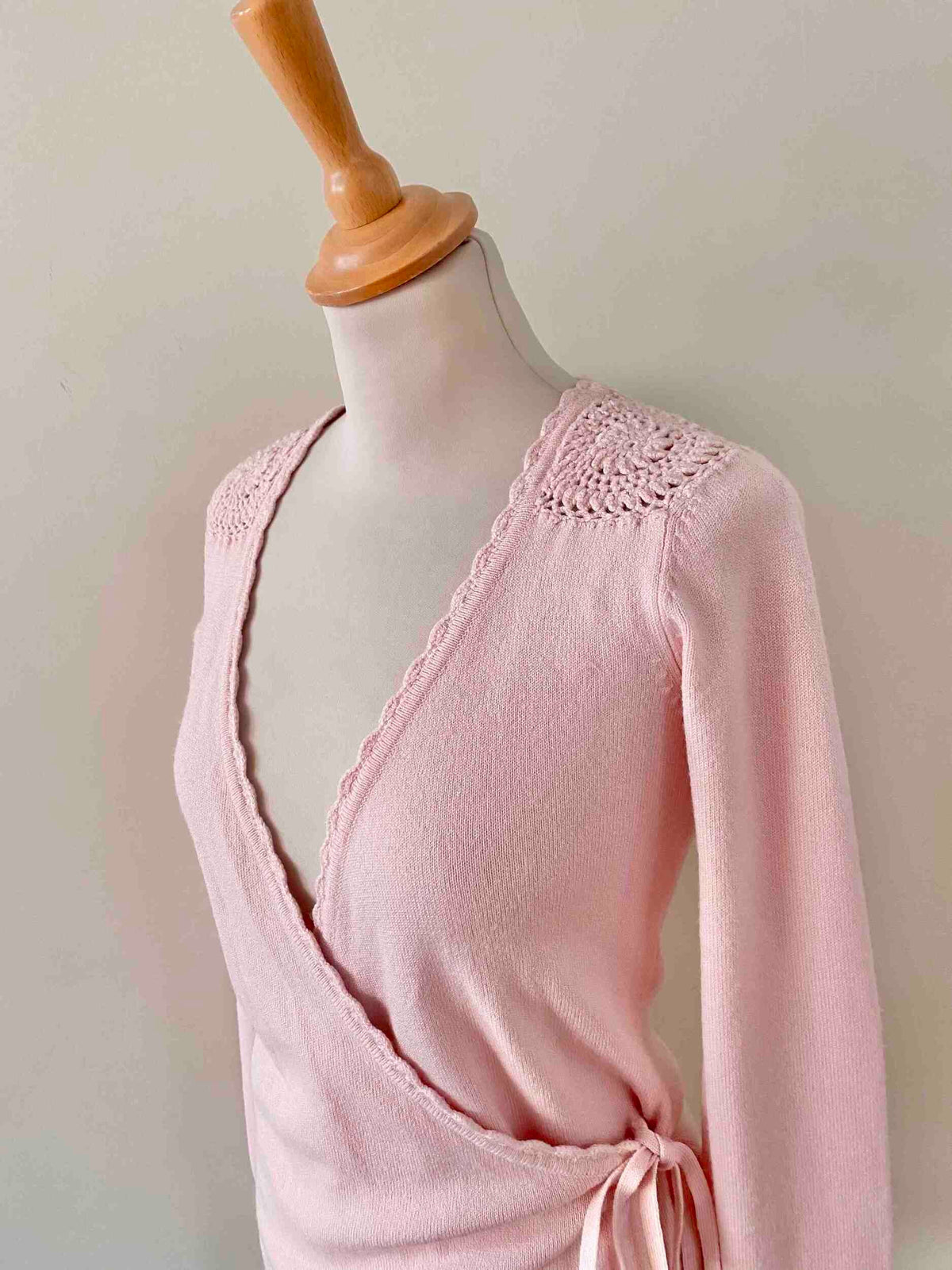 Prix unitaire parCache-cœur en crochet maille acrylique rose layette douce, à croiser par lien intérieur et taille, détails de fleurs en crochets sur les épaules.