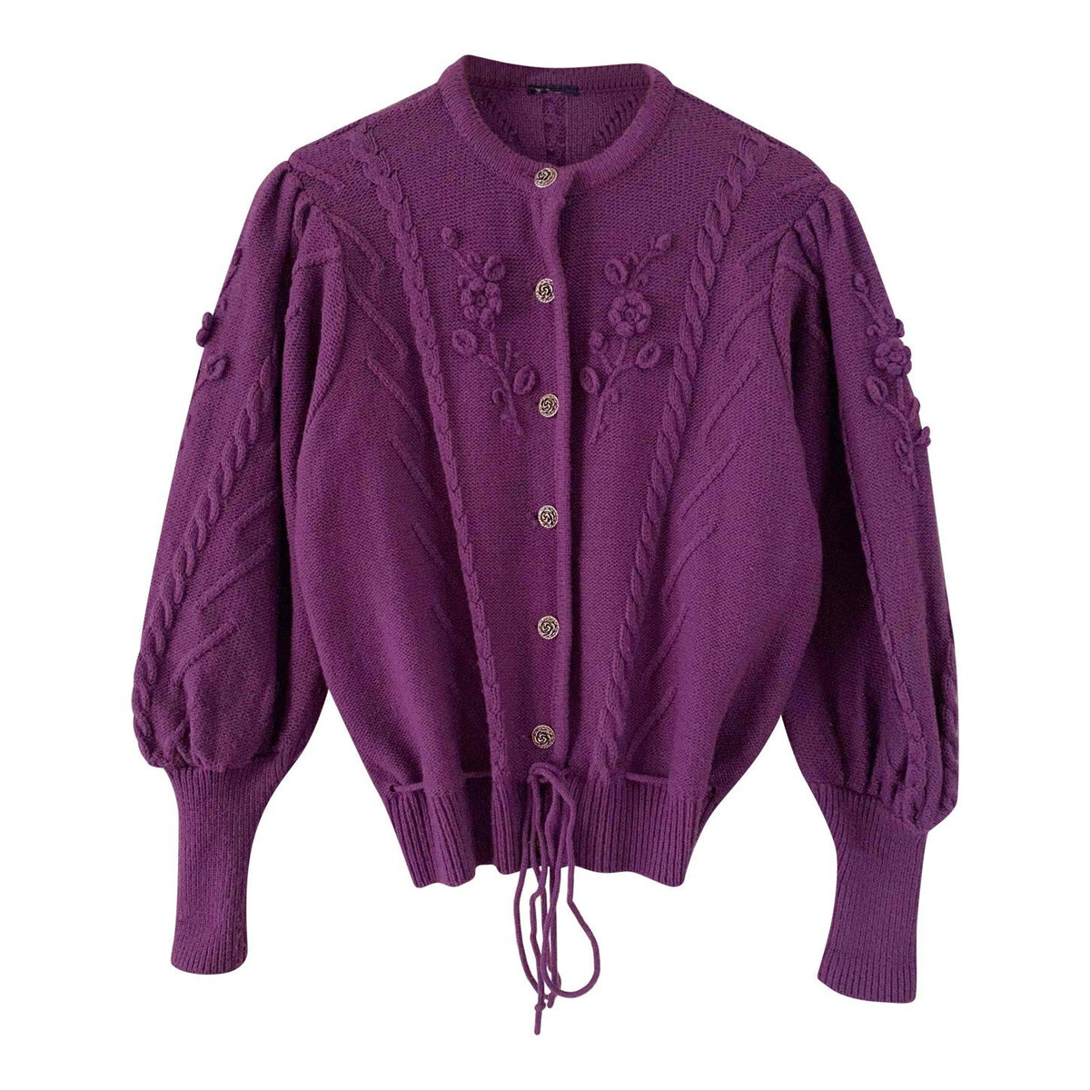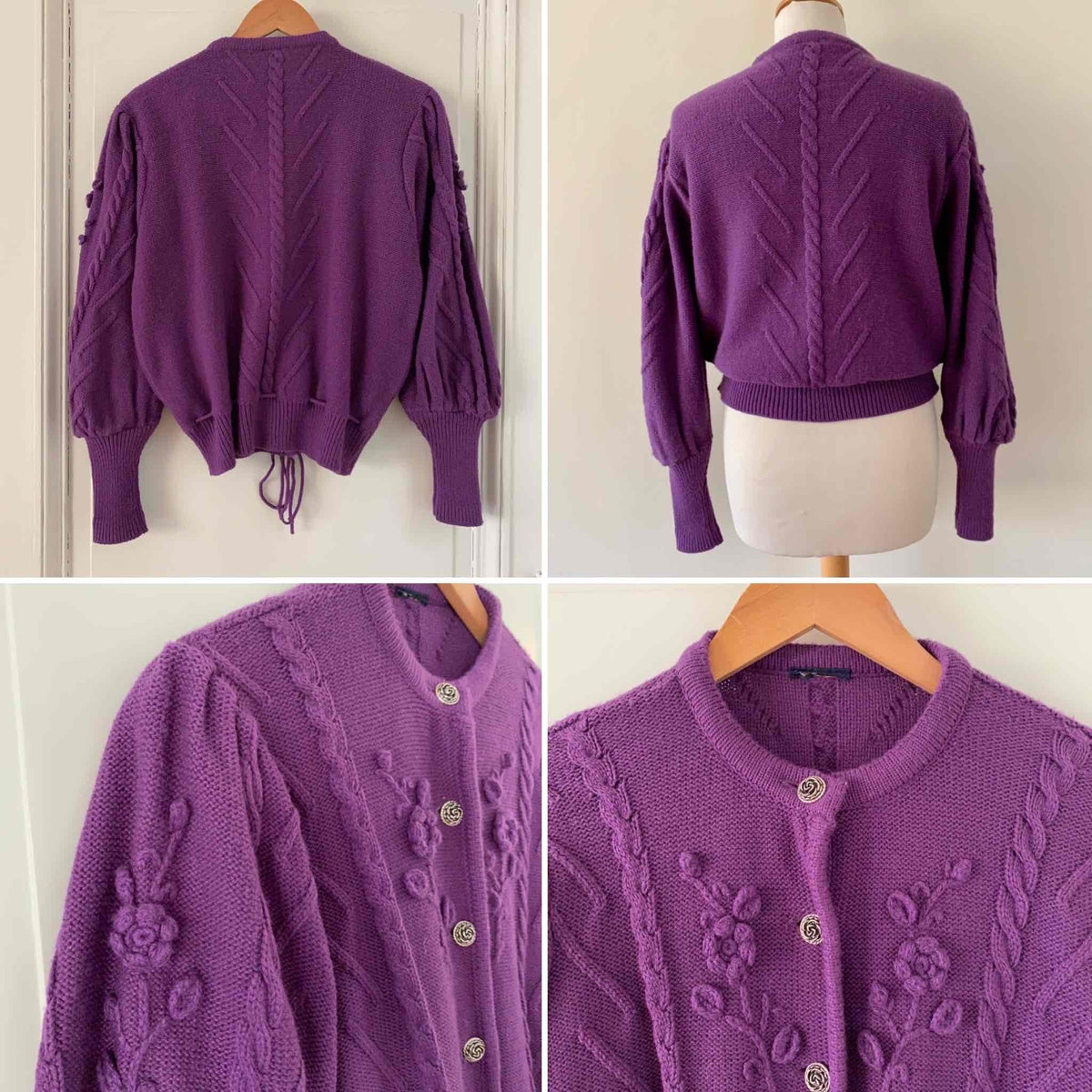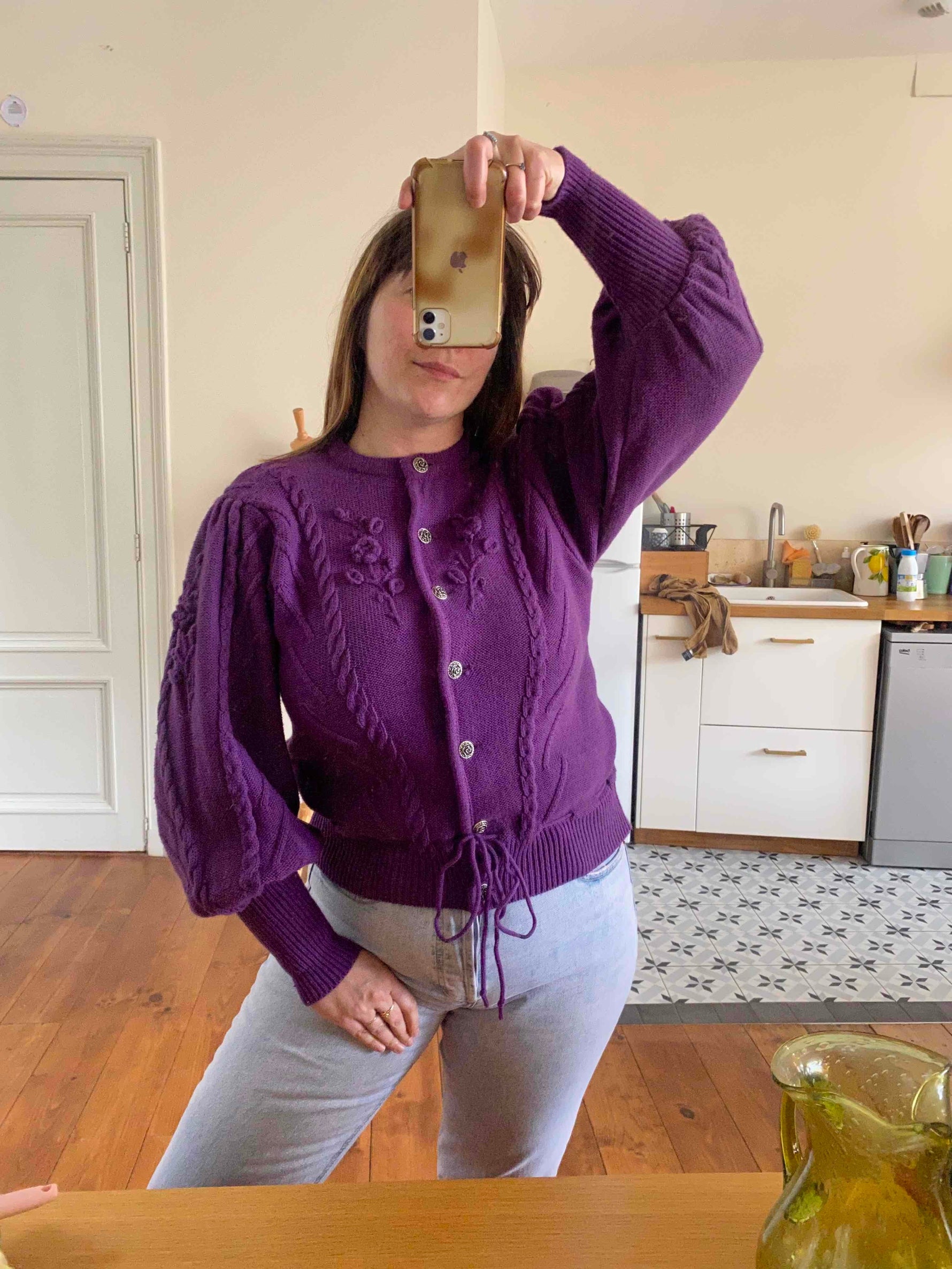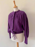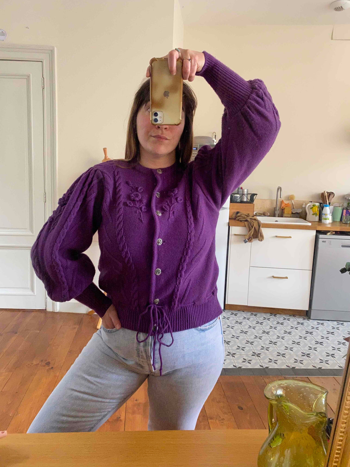 Prix unitaire parCardigan autrichien en laine violette brodé de fleurs au crochet ton sur ton, détails de torsades, manches ballons brodées, boutons bijoux argentés fleuris, cordon à nouer taille, taille 38/40 porté ici sur un mannequin T36 et une personne T40.