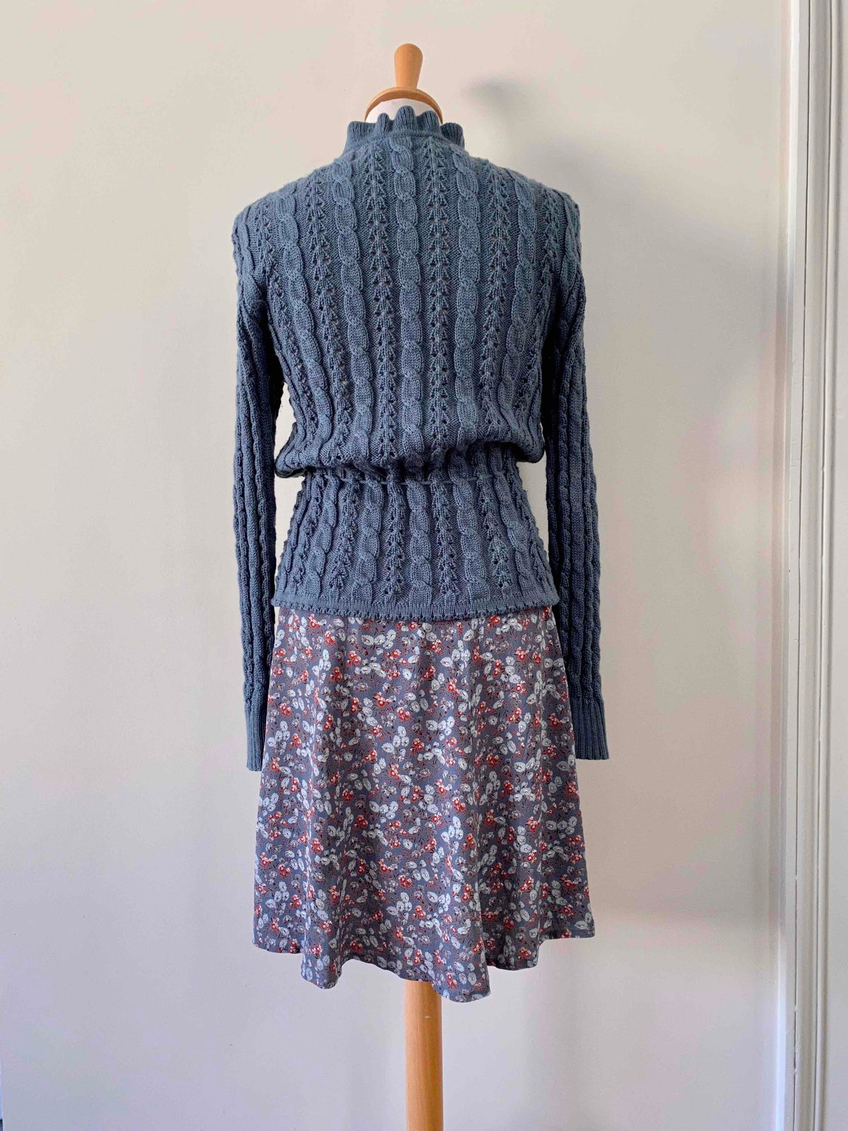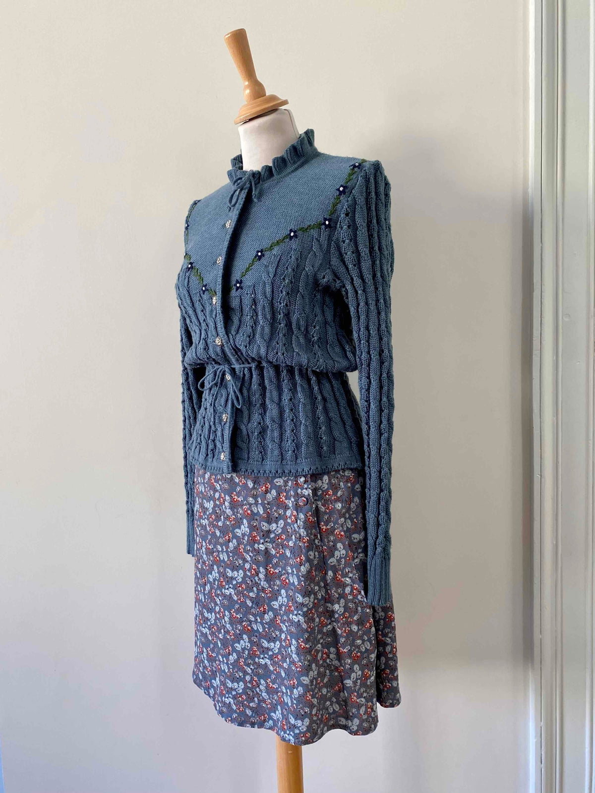 Cardigan autrichien en pure laine bleu orage brodé de fleurs bleu marine, vertes et blanches.