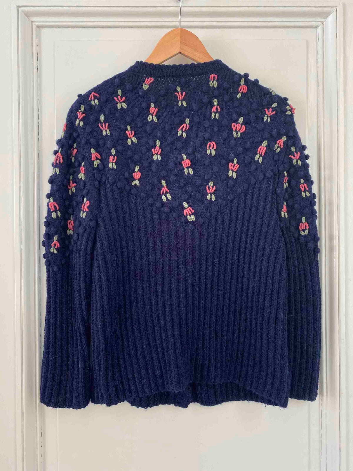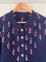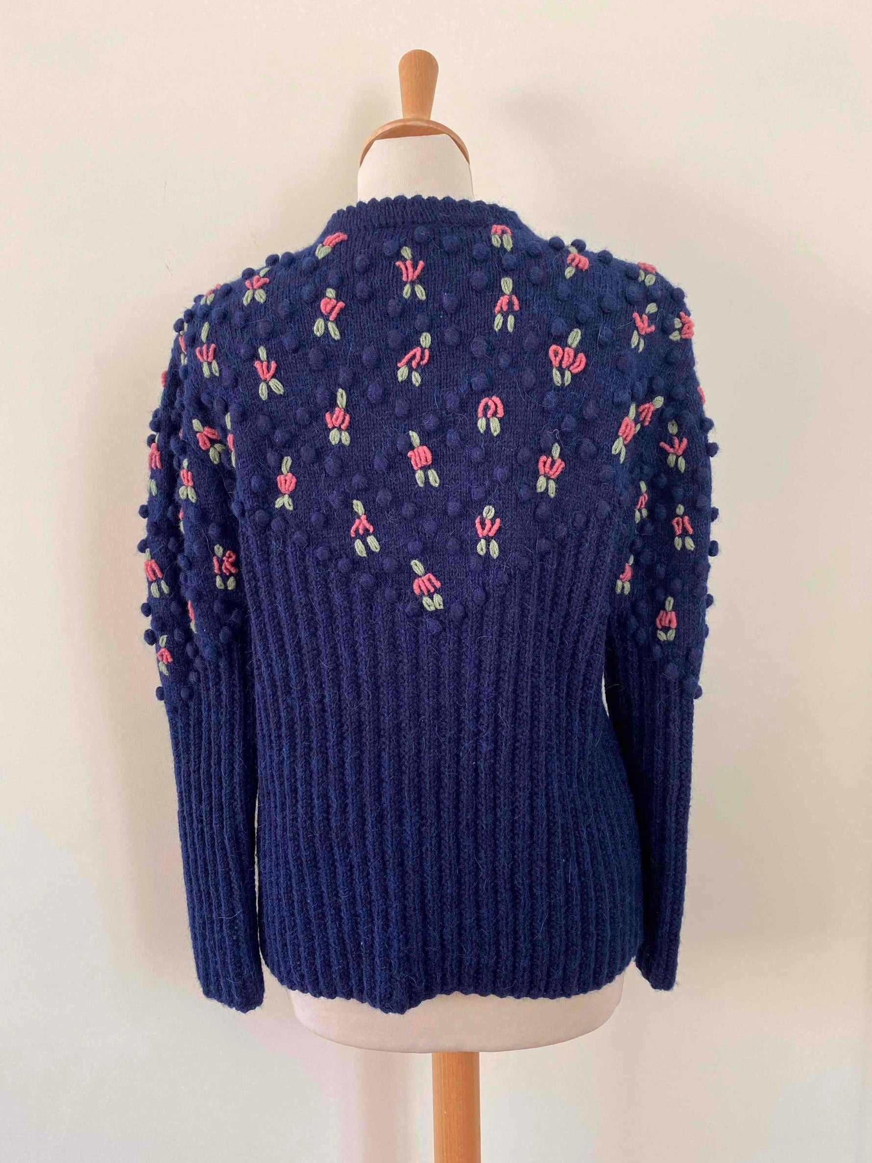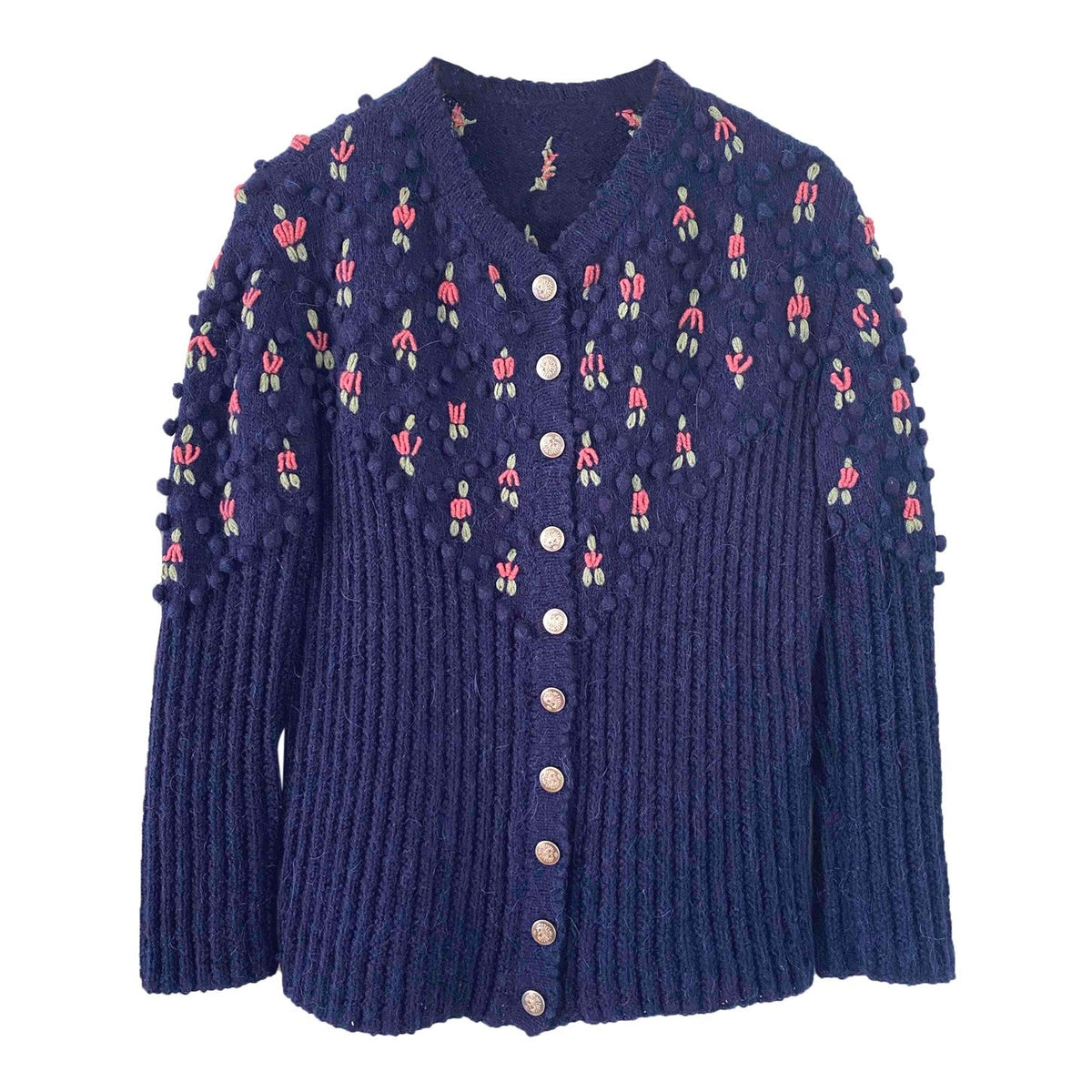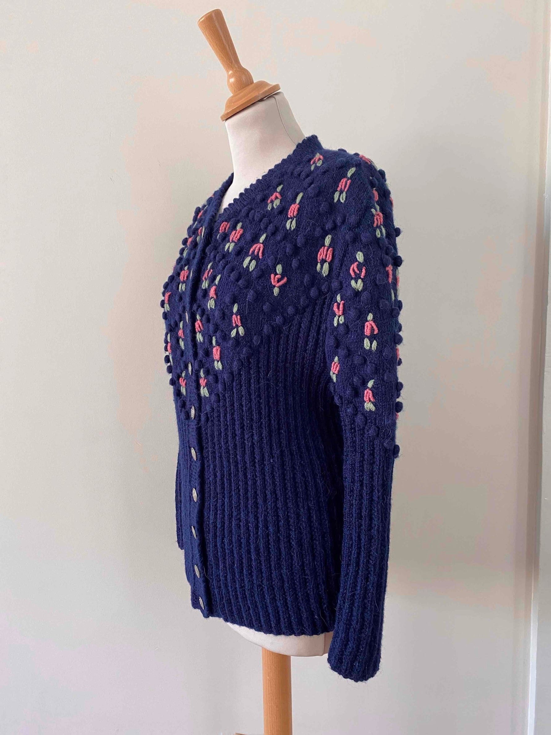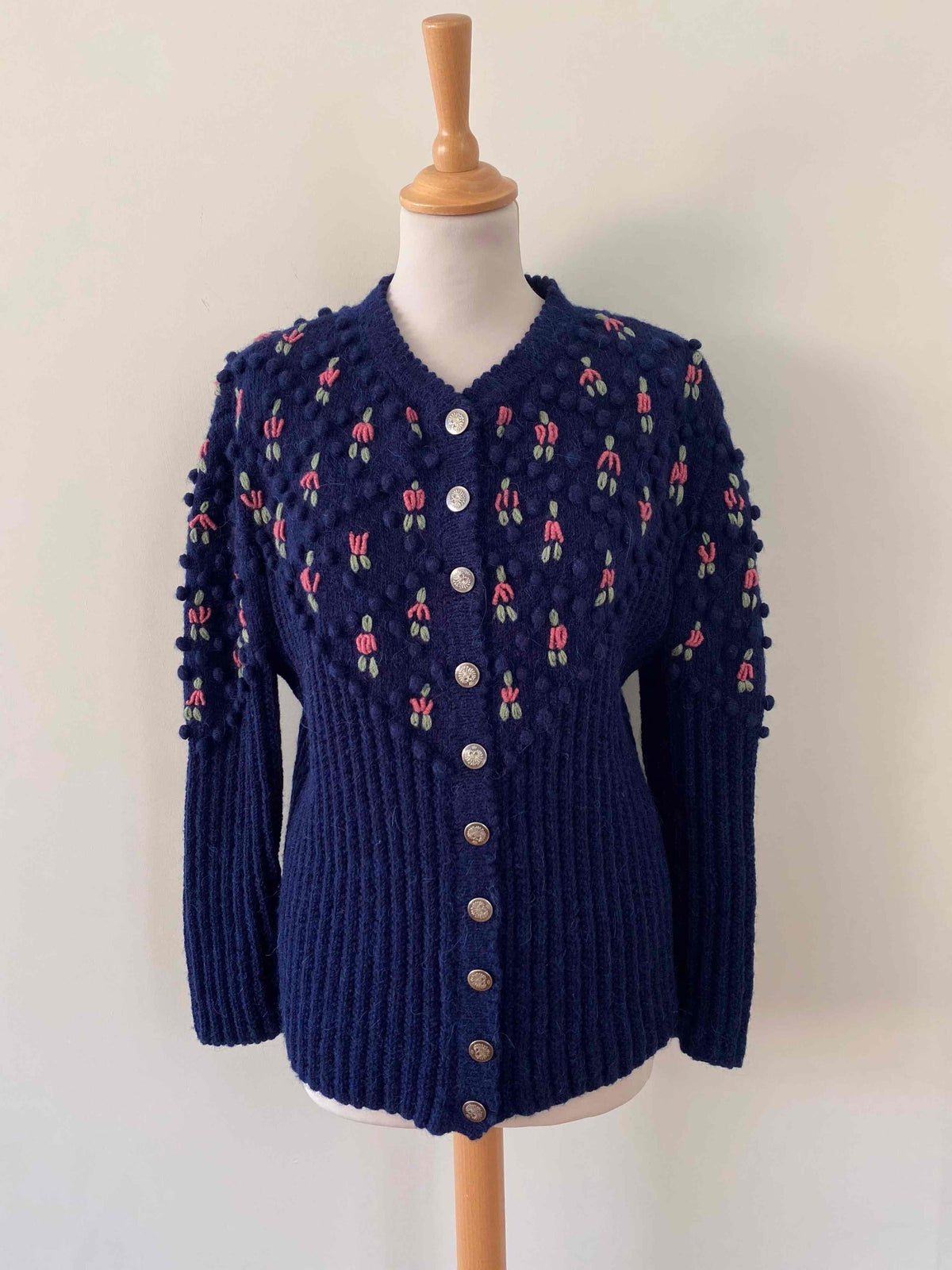 Prix unitaire parCardigan autrichien en laine bleu nuit, contenant du mohair maille fluffy, brodé de fleurs, pompons brodés, boutons bijoux argentés, tricoté mains en Autriche