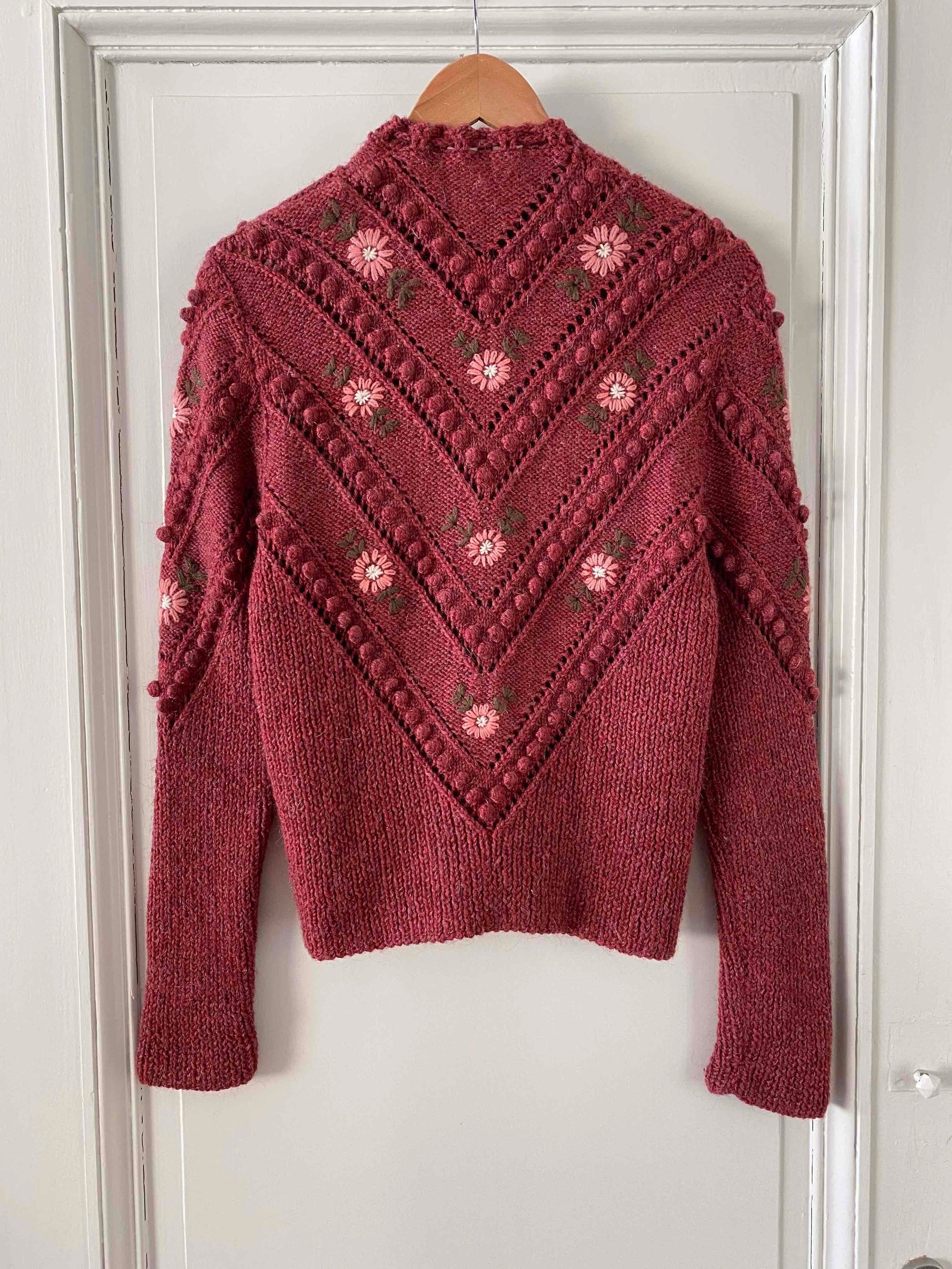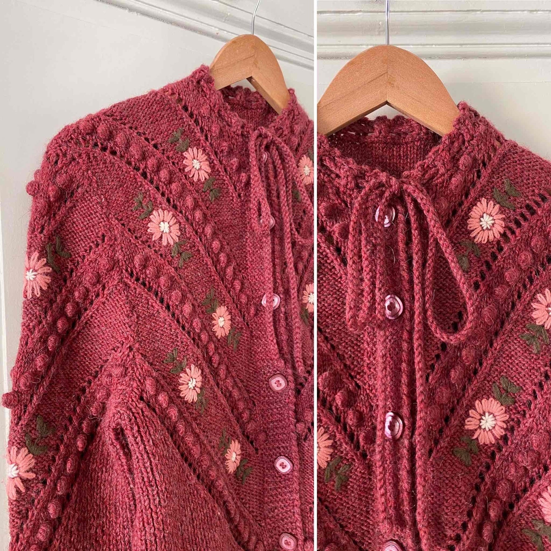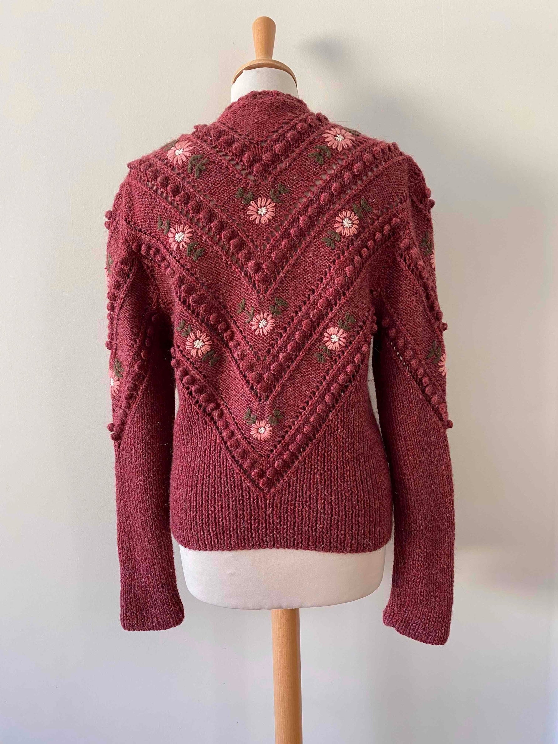 Prix unitaire parCardigan autrichien en laine et mohair légèrement fluffly bois de rose entièrement brodé de fleurs roses et vertes, maille popcorn pompons brodés, cordon tressé à nouer au col, manches ballons brodées, taille 36 et 38 porté ici sur un mannequin T36, tricoté et brodé mains en Autriche.