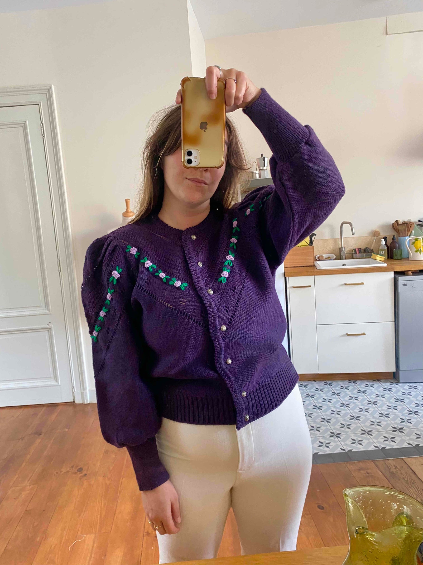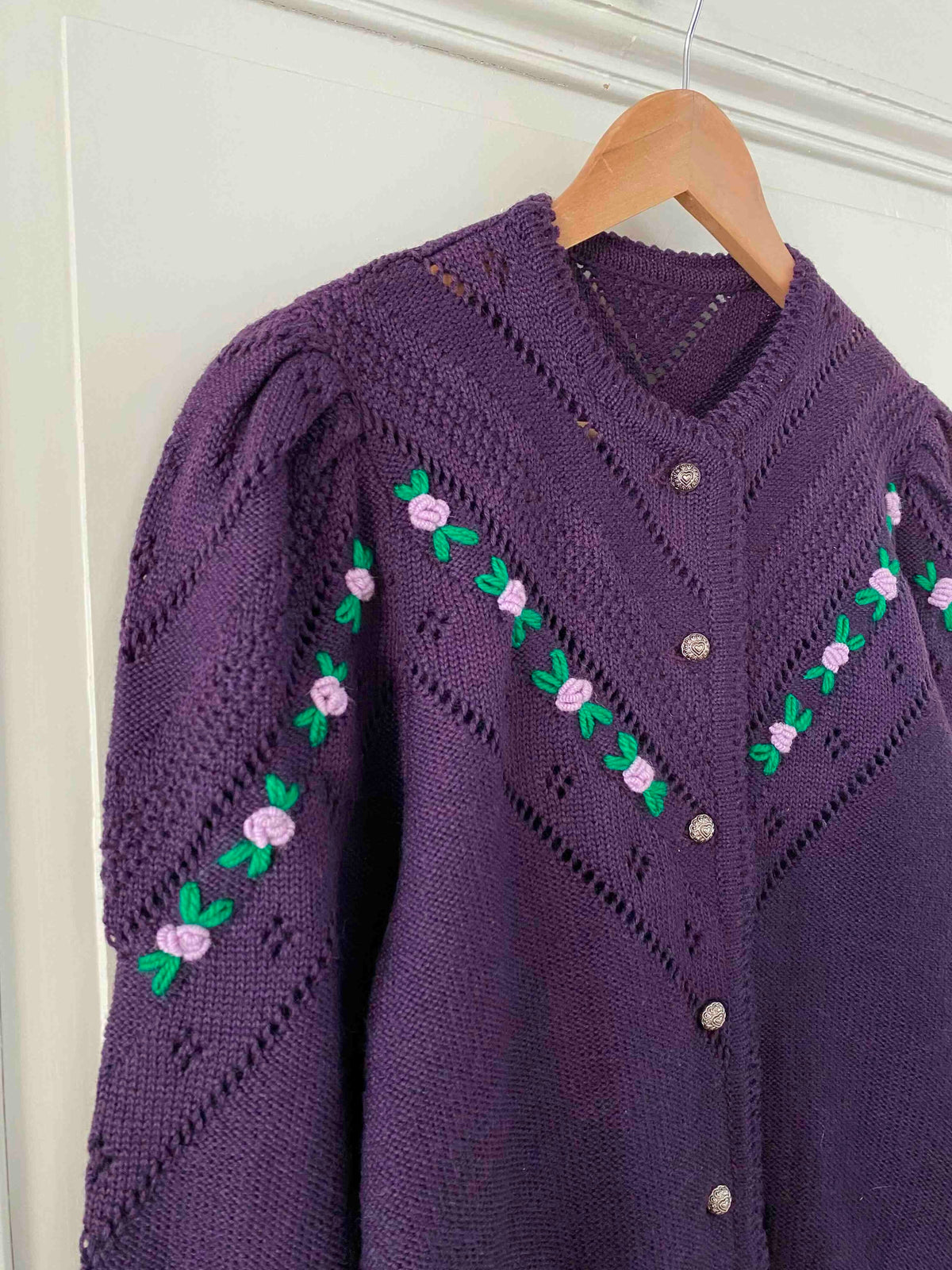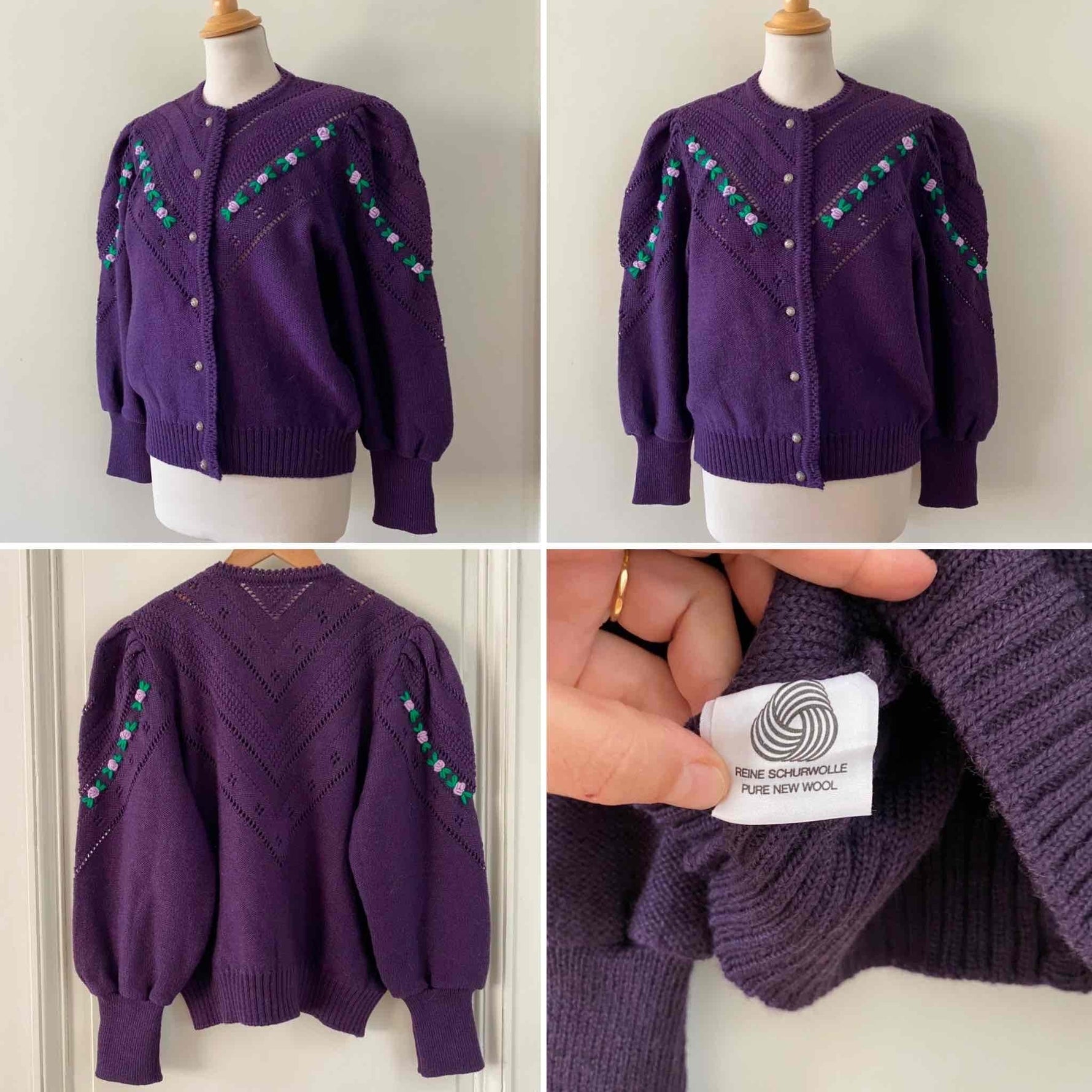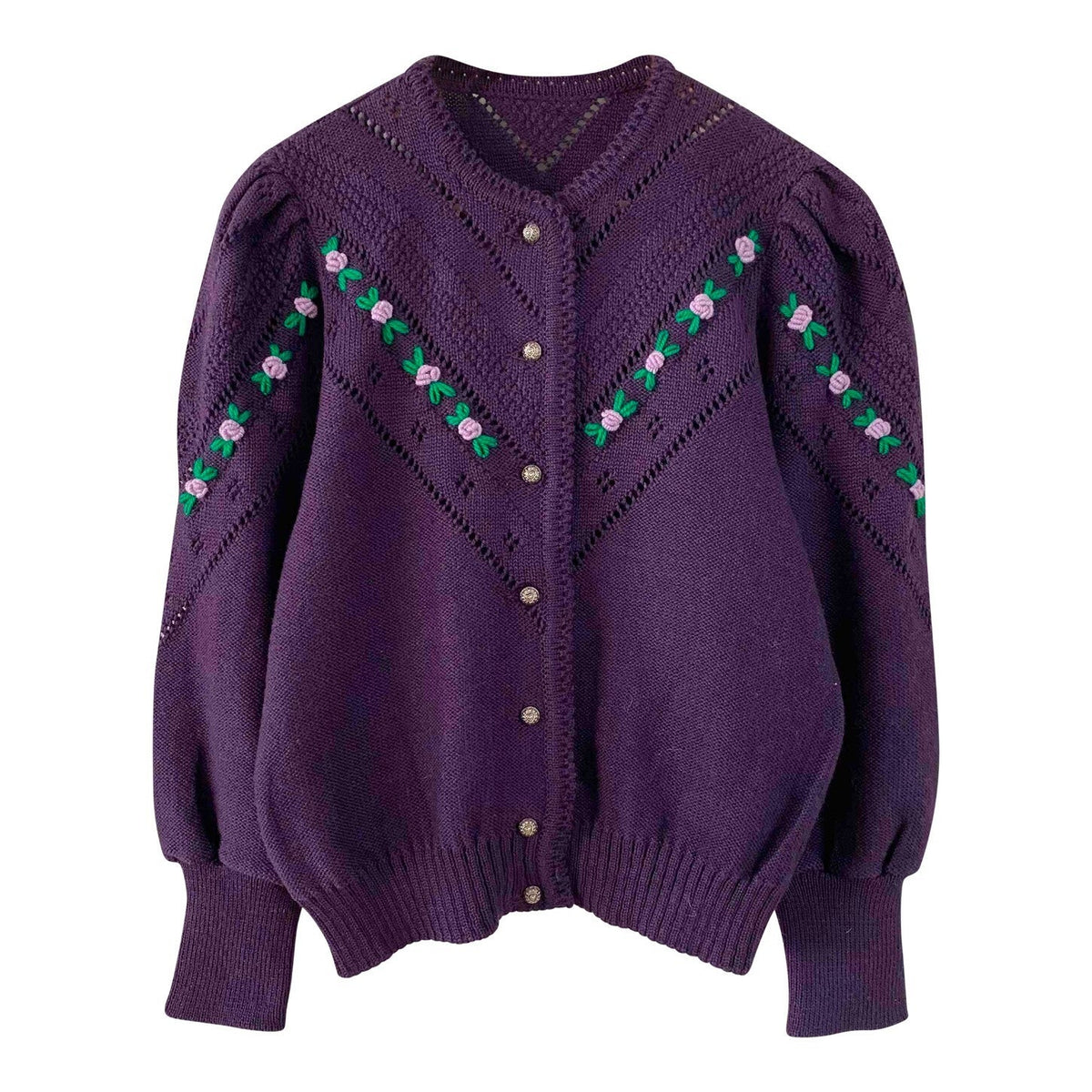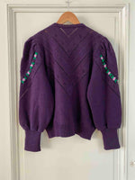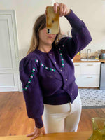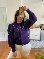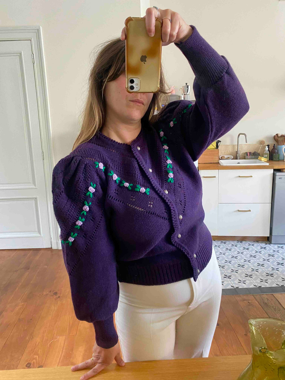 Prix unitaire parCardigan Autrichien en pure laine violet foncé, maille ajourée et brodé de fleurs lilas et vert chlorophylle, manches ballon brodées, boutons bijoux argentés fleuris, taille 38 et 40 porté ici sur une personne T40 et un mannequin T36.