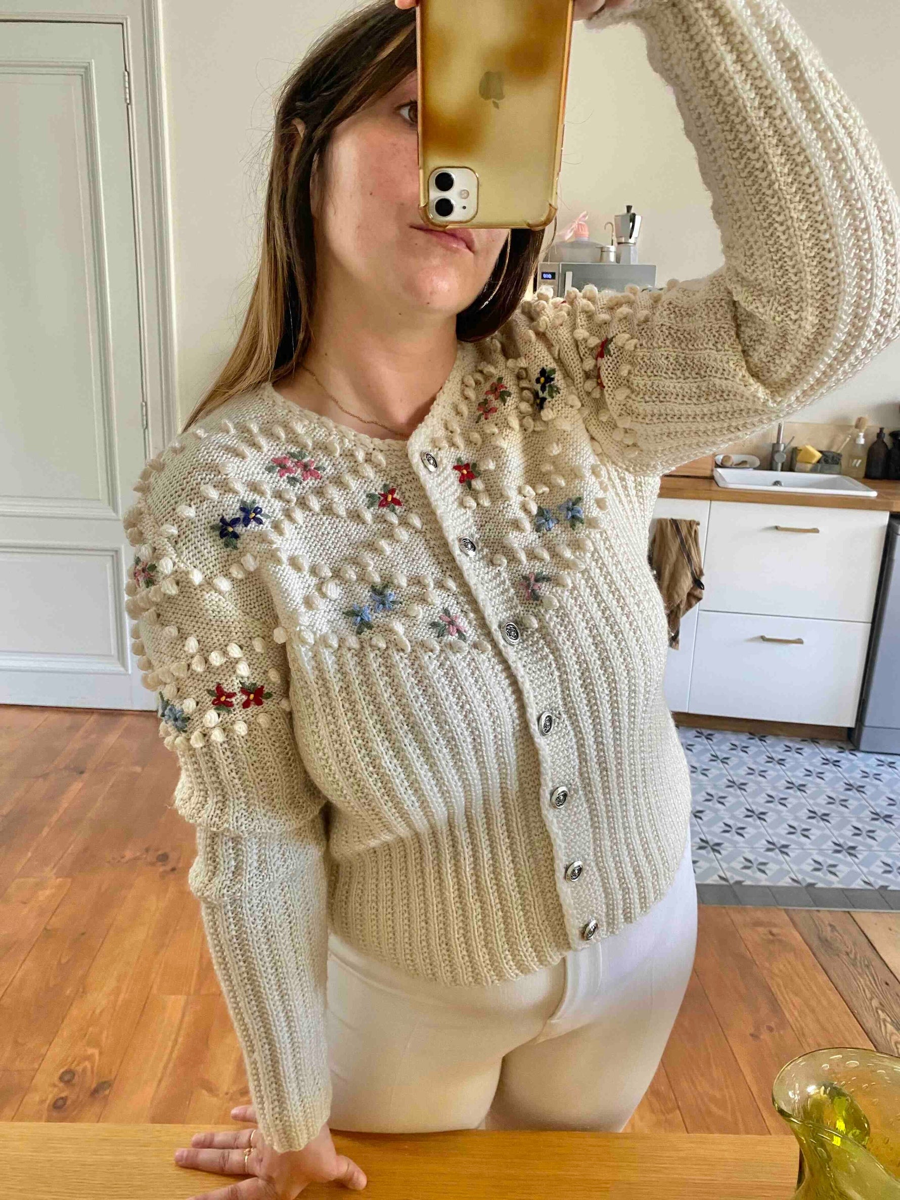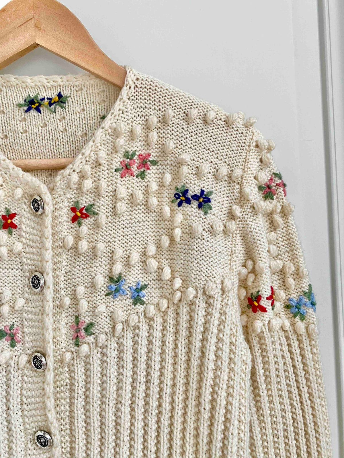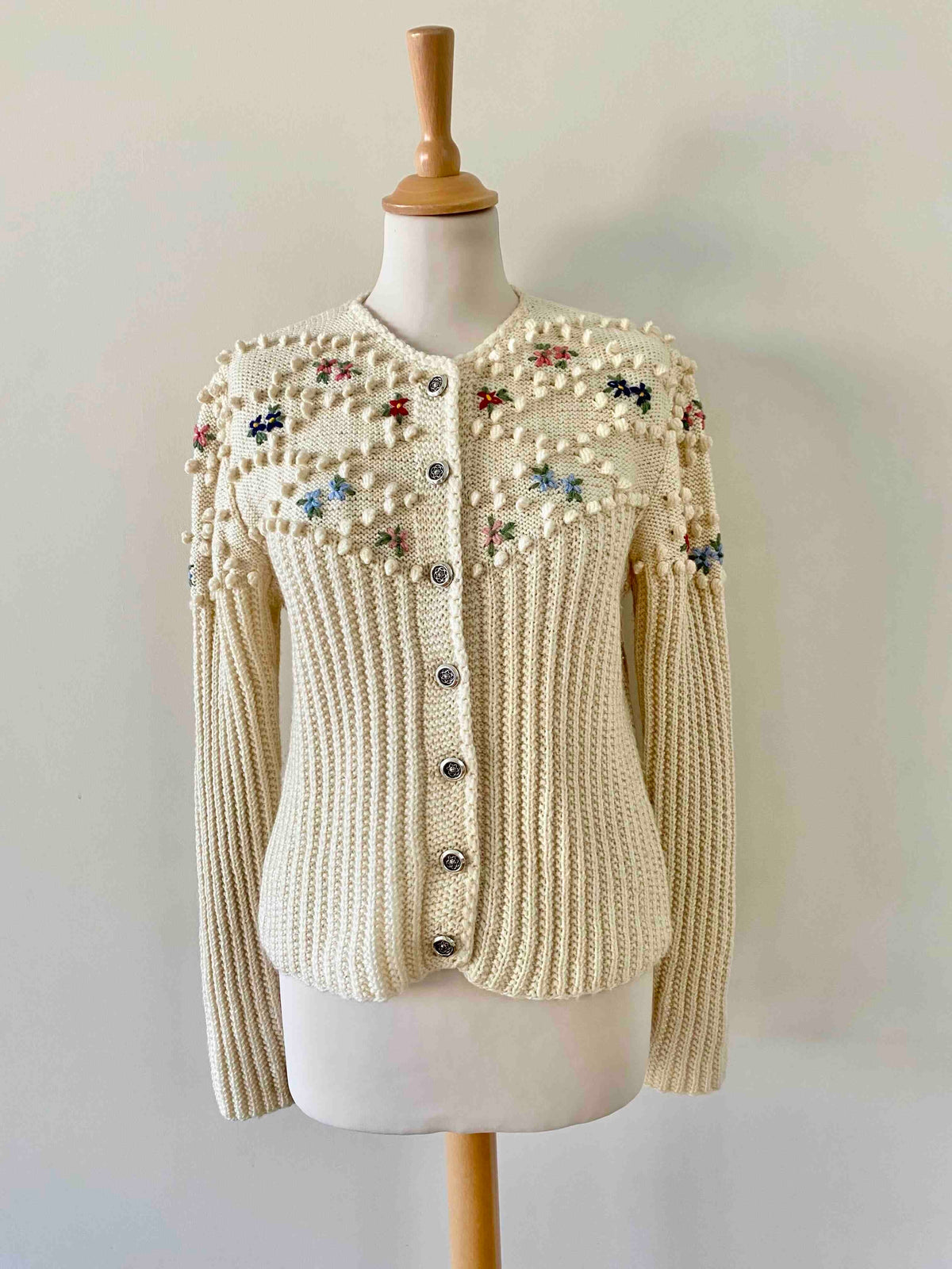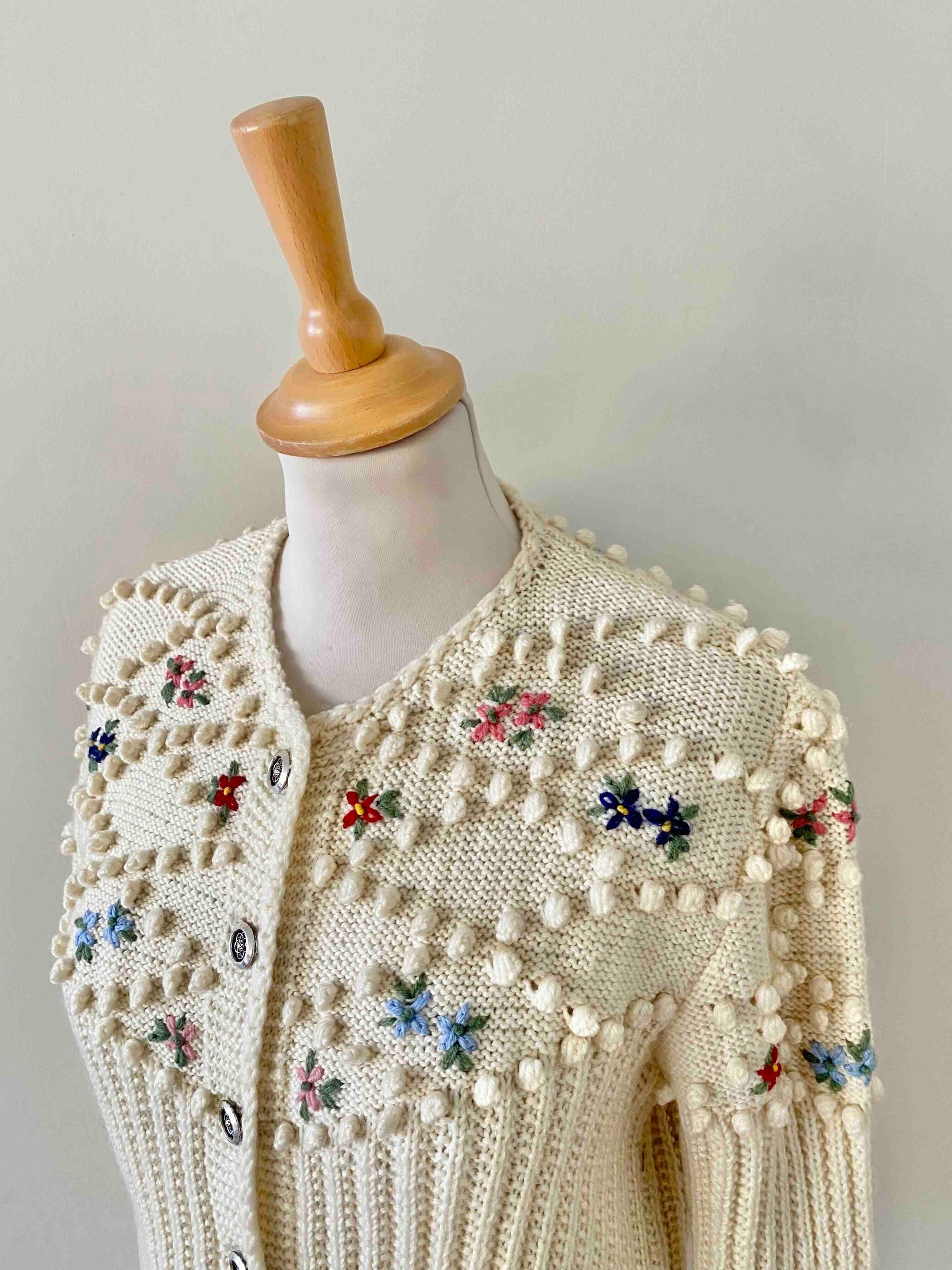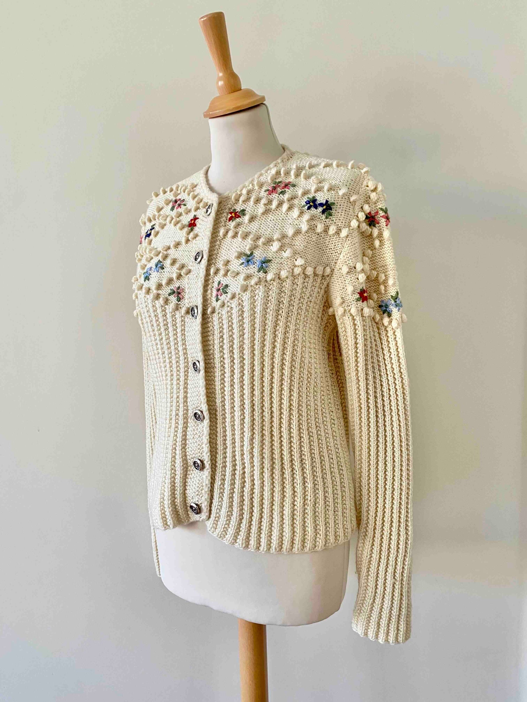 Prix unitaire parCardigan Autrichien en laine écrue maille popcorn pompons brodés et brodé de fleurs multicolores pastels, manches ballons brodées, boutons bijoux argentés fleuris, tricotté et brodé mains en Autriche, taille 38 porté ici sur un mannequin T36 et une personne T40.