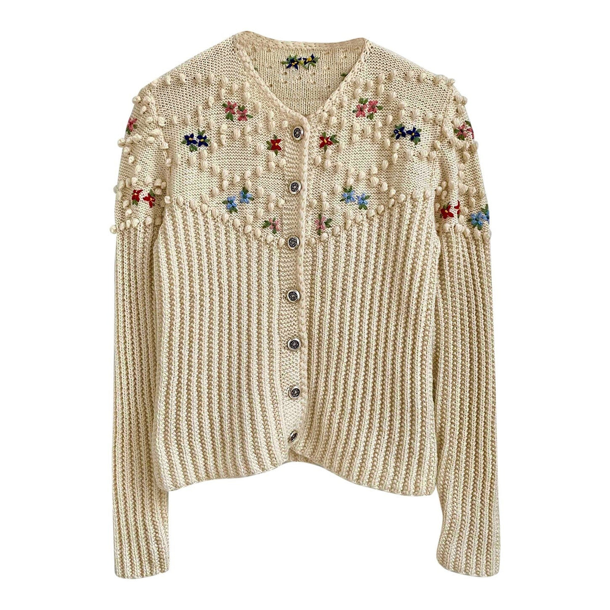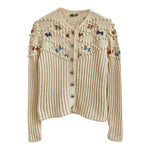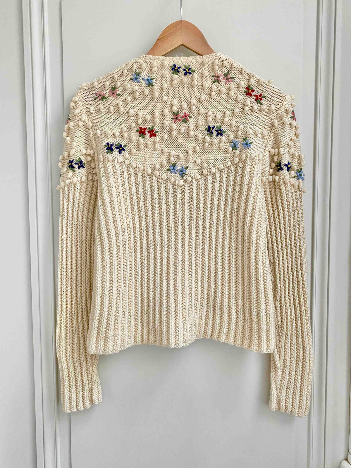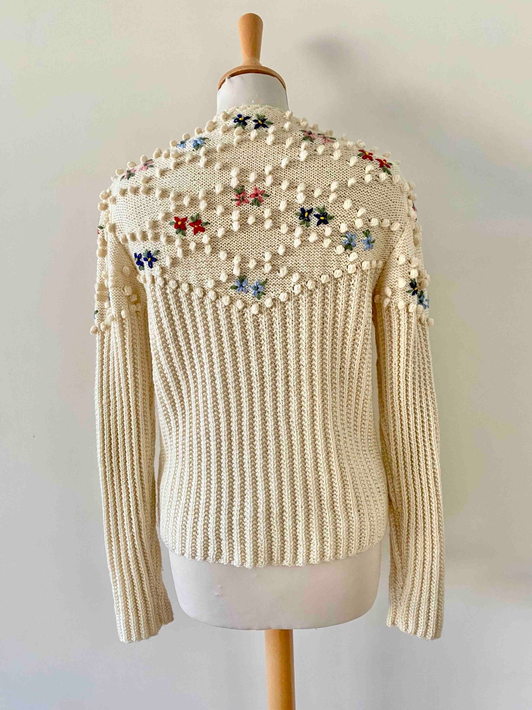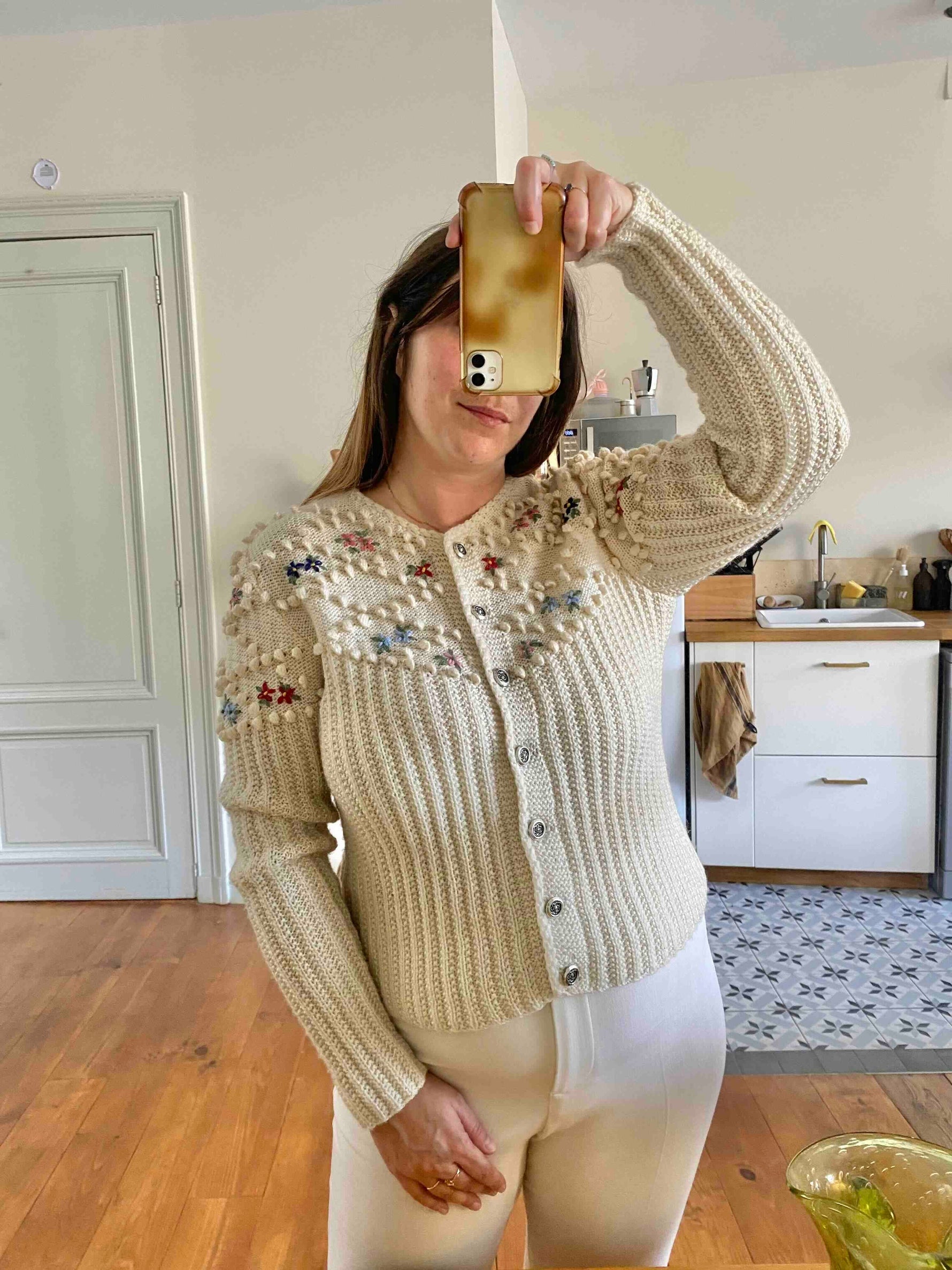 Prix unitaire parCardigan Autrichien en laine écrue maille popcorn pompons brodés et brodé de fleurs multicolores pastels, manches ballons brodées, boutons bijoux argentés fleuris, tricotté et brodé mains en Autriche, taille 38 porté ici sur un mannequin T36 et une personne T40.