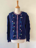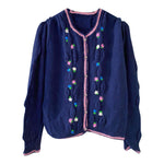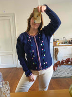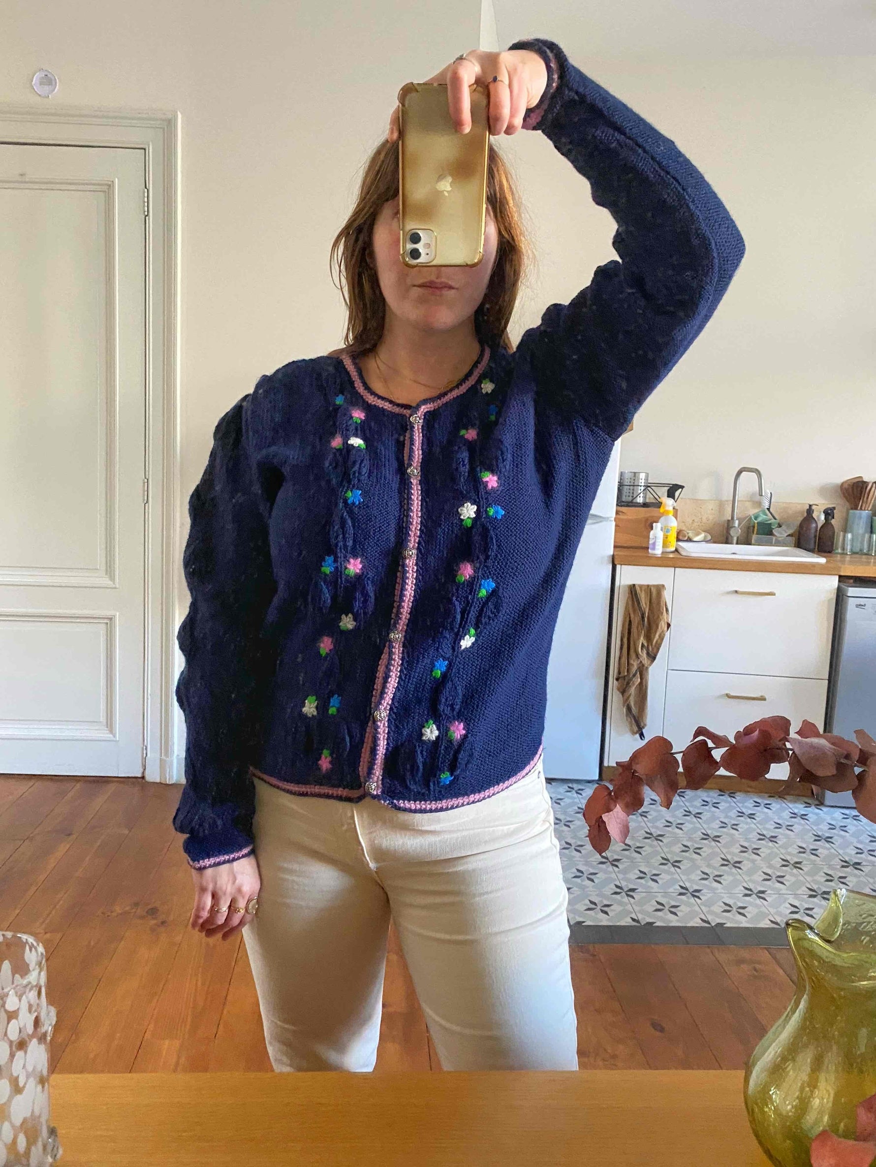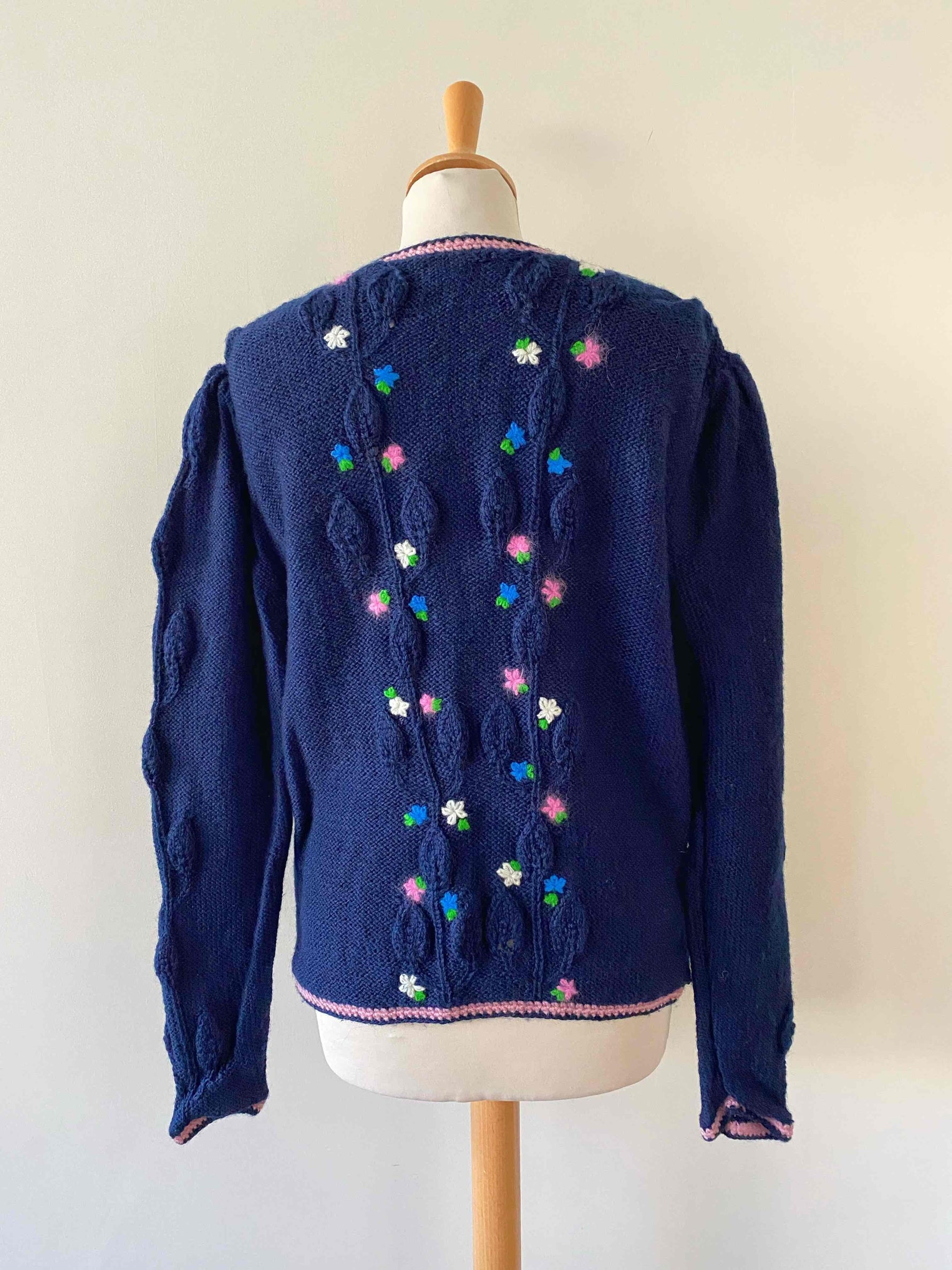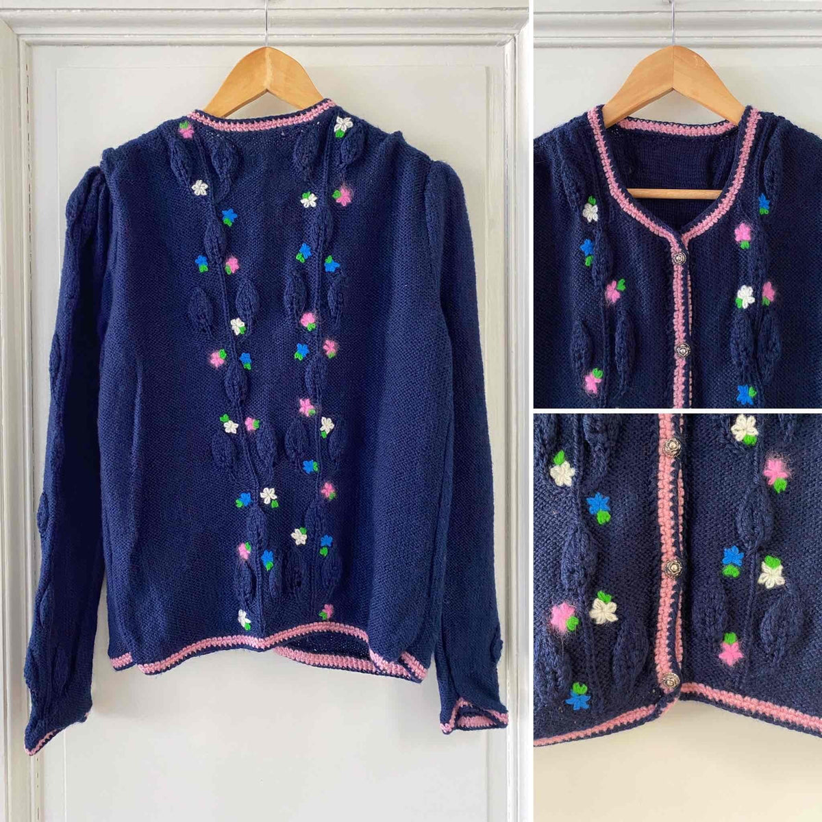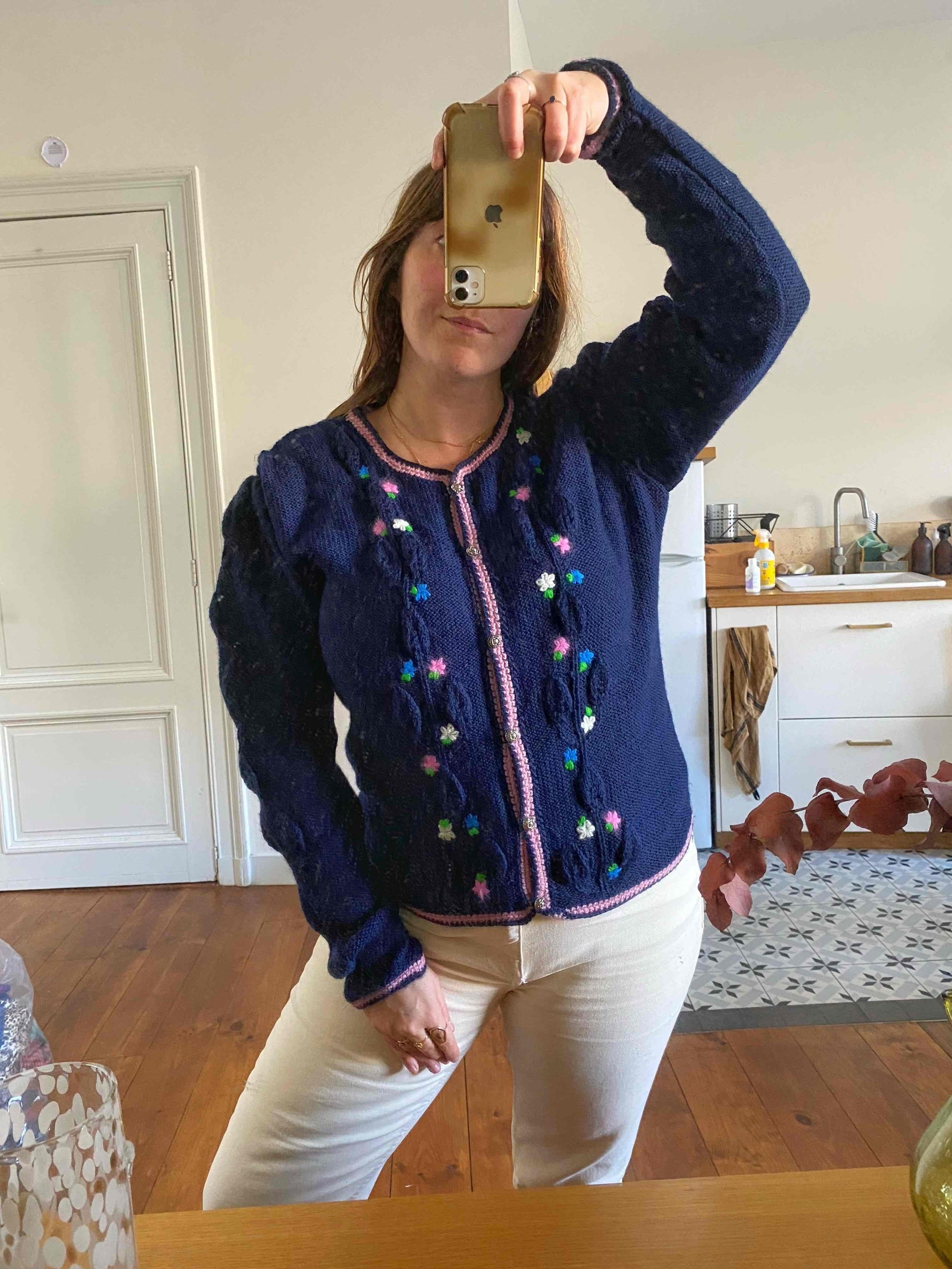Prix unitaire parCardigan autrichien en pure laine bleue foncée brodée de fleurs multicolores roses, bleu, blanc et vertes pastels, boutons bijoux argentés, tricoté et brodé mains en Autriche, taille 38/40 porté ici sur un mannequin T36 et une personne T40.
