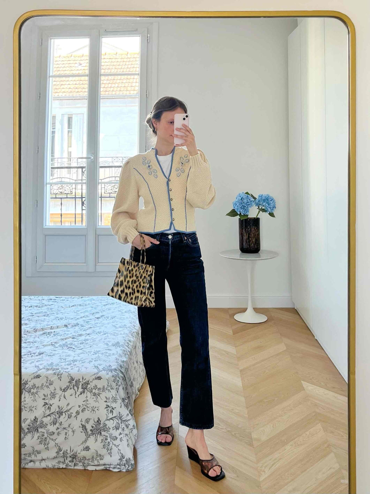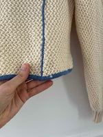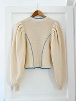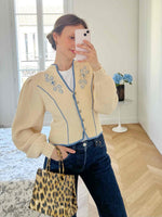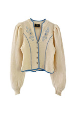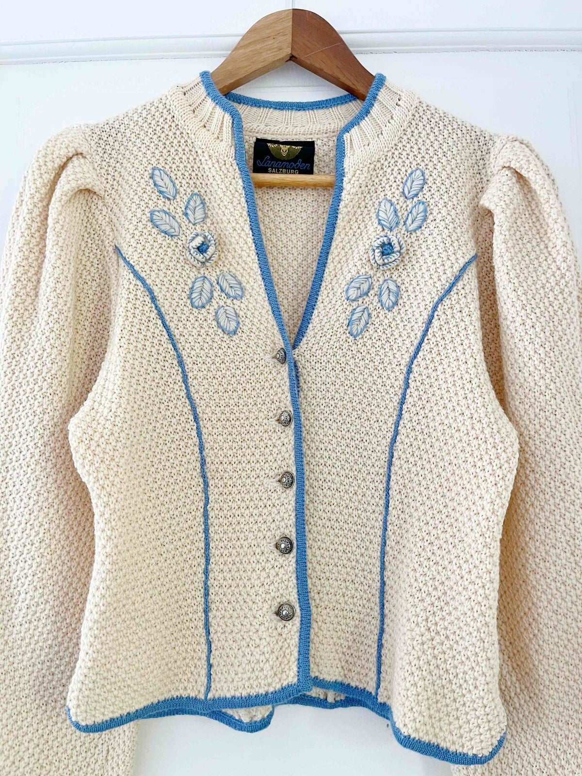 Cardigan autrichien, manches légèrement bouffantes, cintré à la taille, orné de fleurs et d’un liseré bleu, col en V, boutons argenté. Porté ici sur une T36 pour 1m64