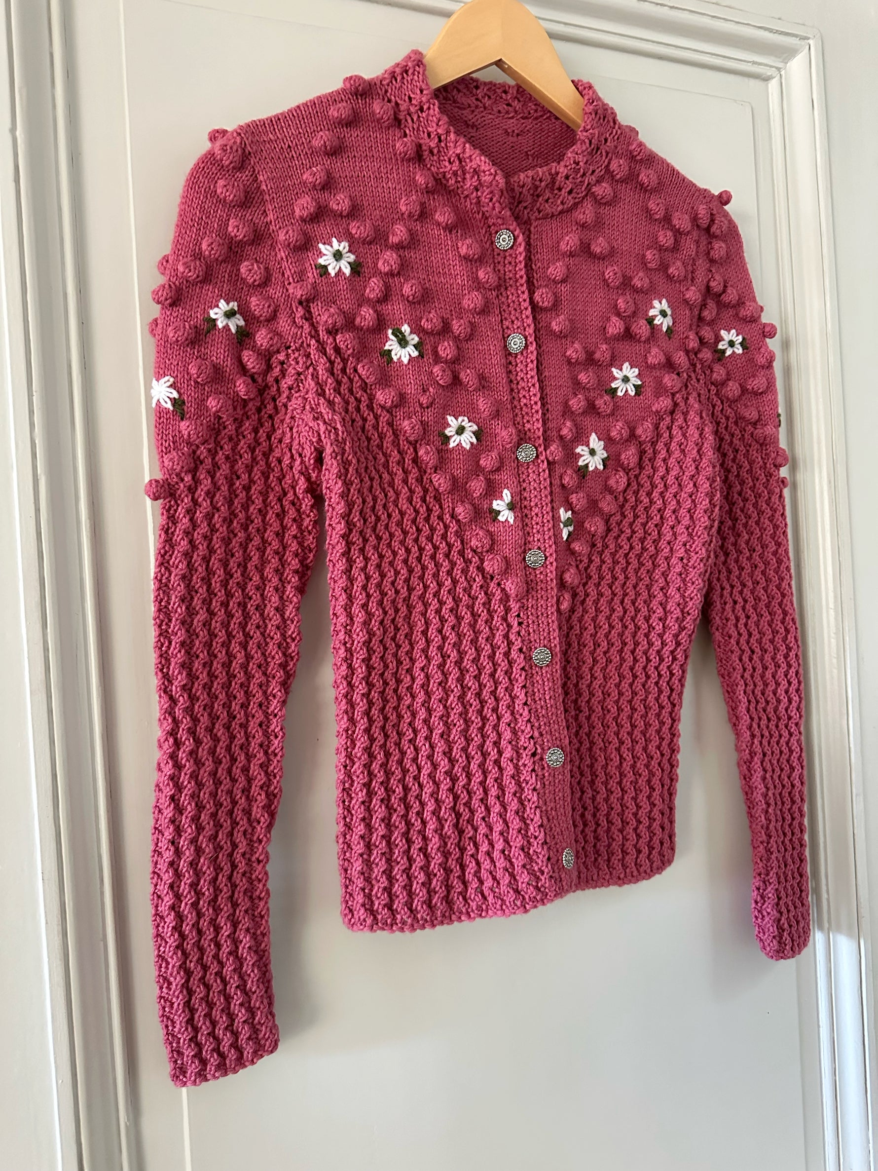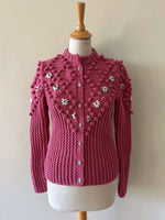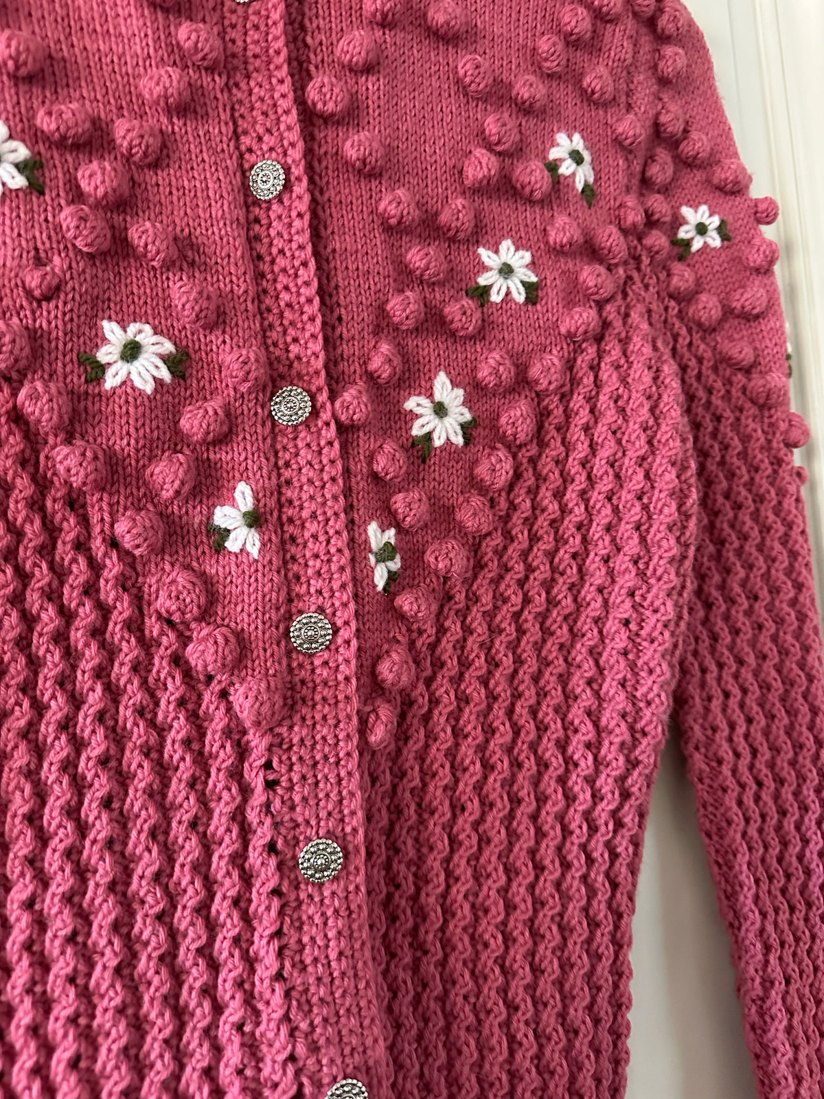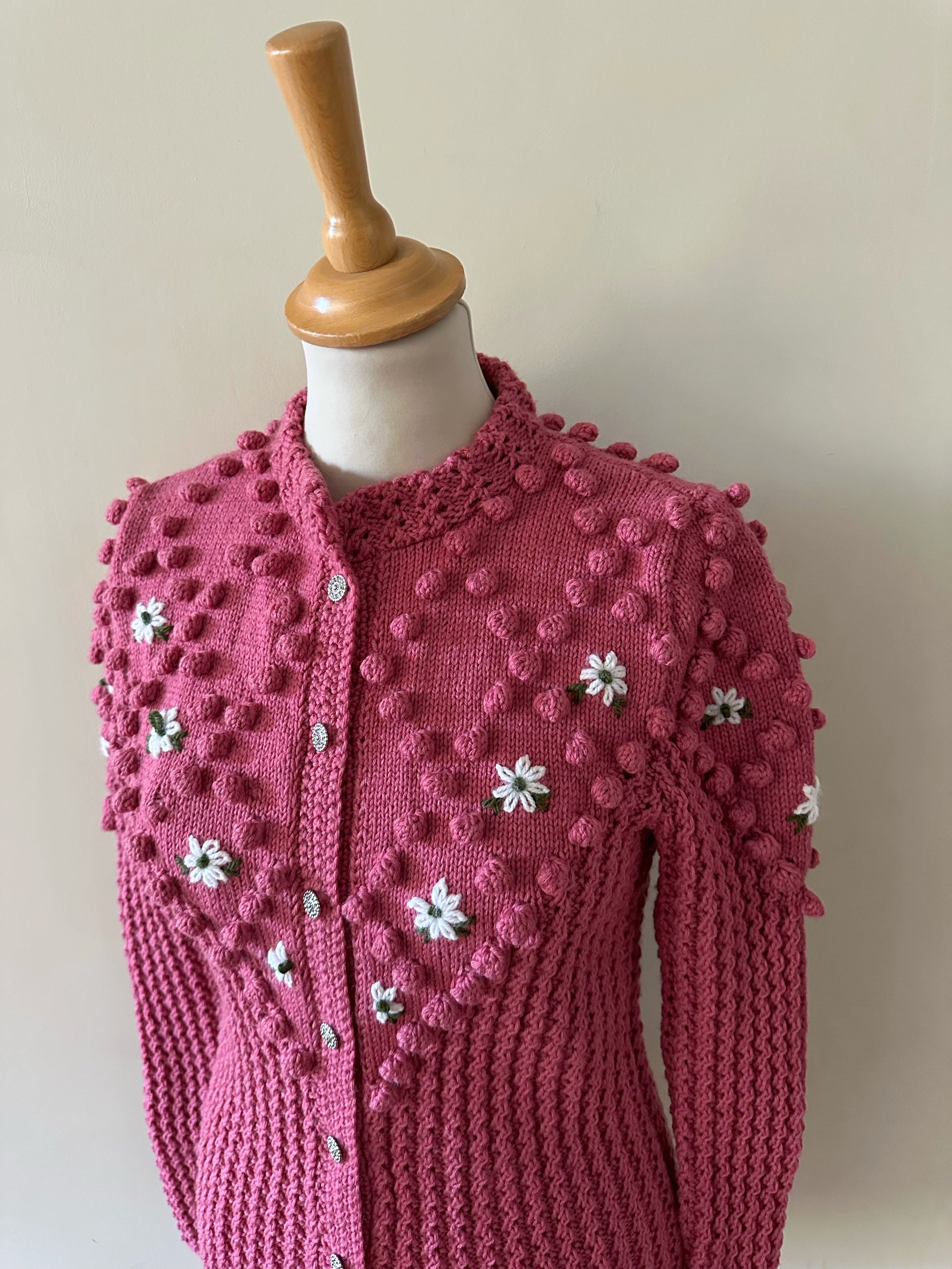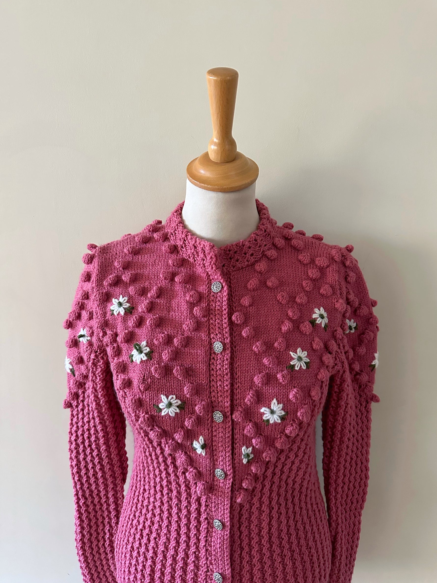 Prix unitaire parCardigan Autrichien, en laine mélangée bois de rose, maille pompons brodés, brodé de fleurs blanches et vertes, manches ballons, boutons bijoux argentés, tricoté main en Autriche, taille 36 porté ici sur un mannequin T36. Longueur dos 55cm Aisselles 44cm.